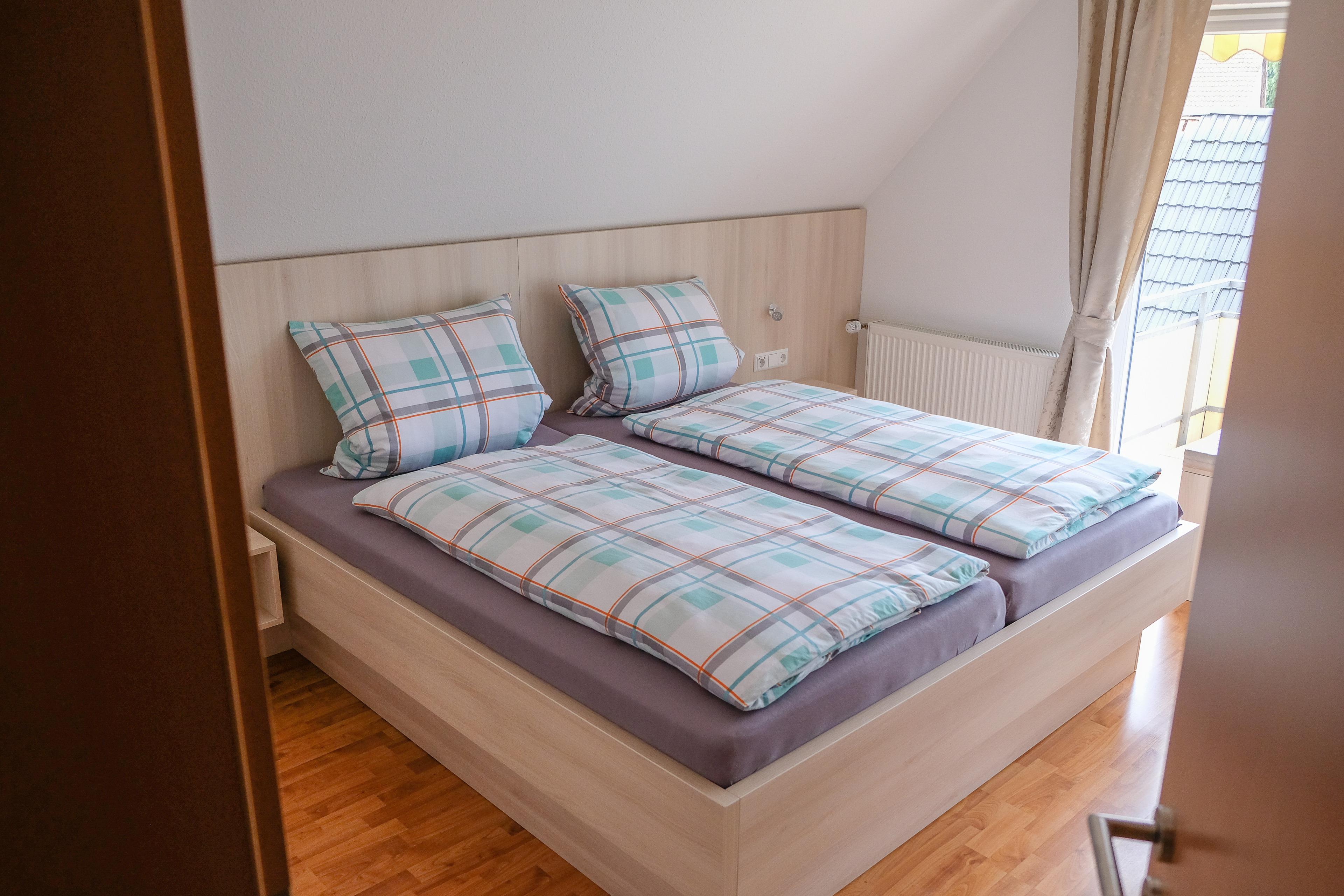 Im Schlafzimmer steht ein 2x2m großes Bett mit getrennten Matratzen und verstellbaren Lattenrosten. Weiterhin befindet sich im Schlafzimmer ein großer Schrank mit eingebautem Tresor (gebührenfrei).