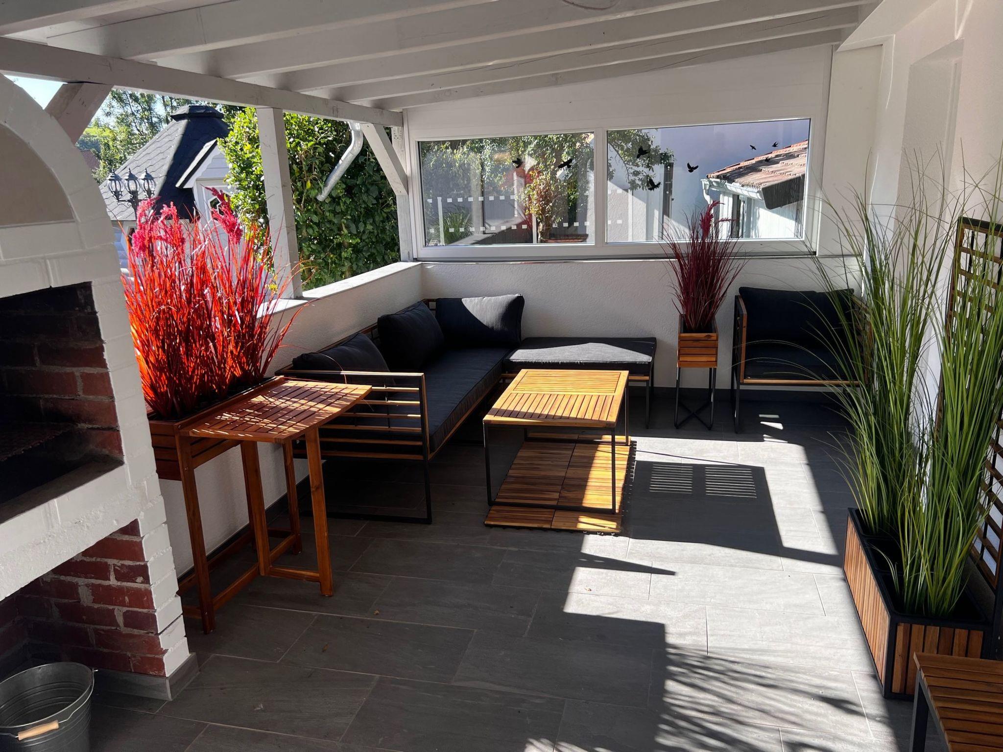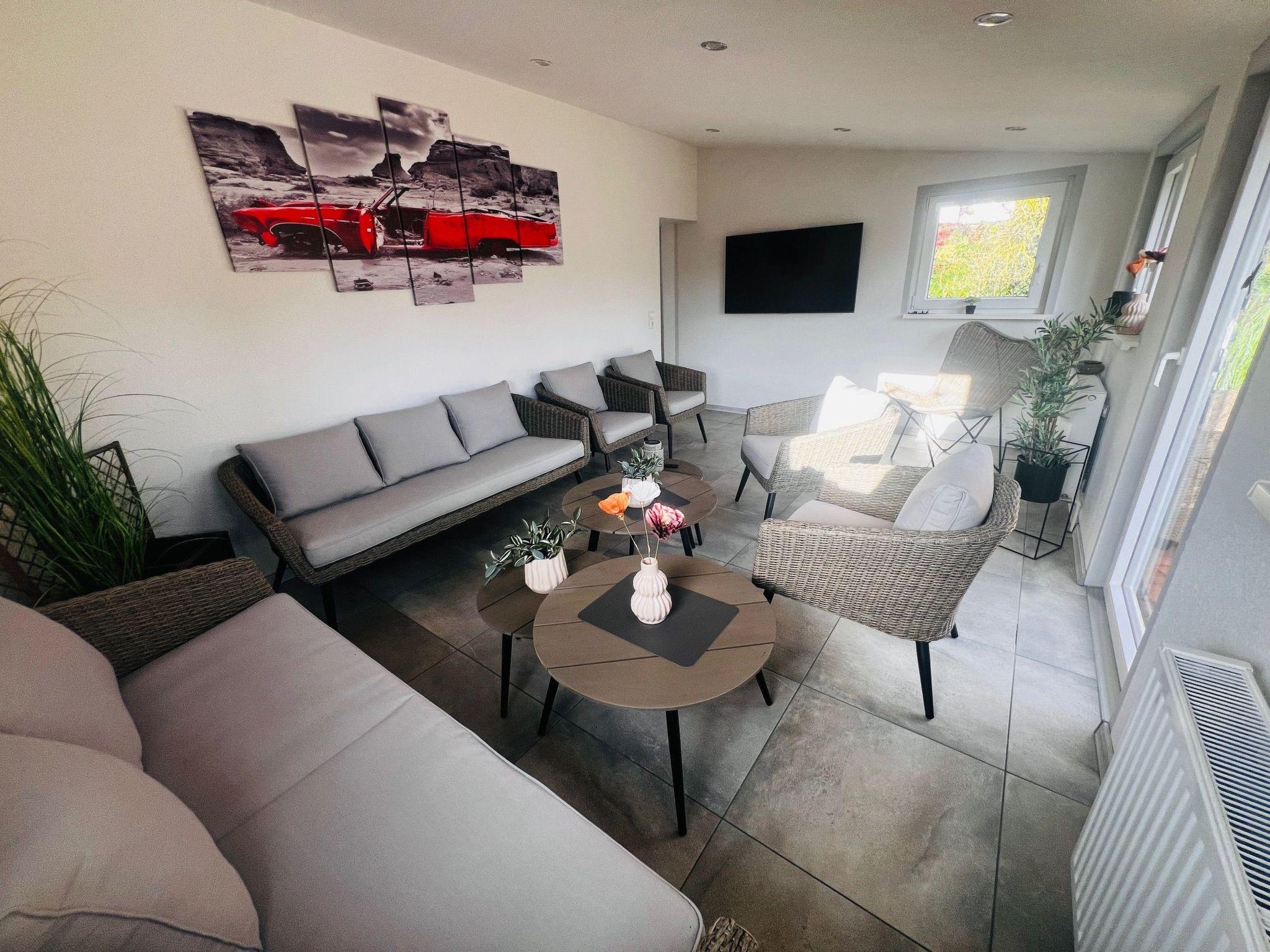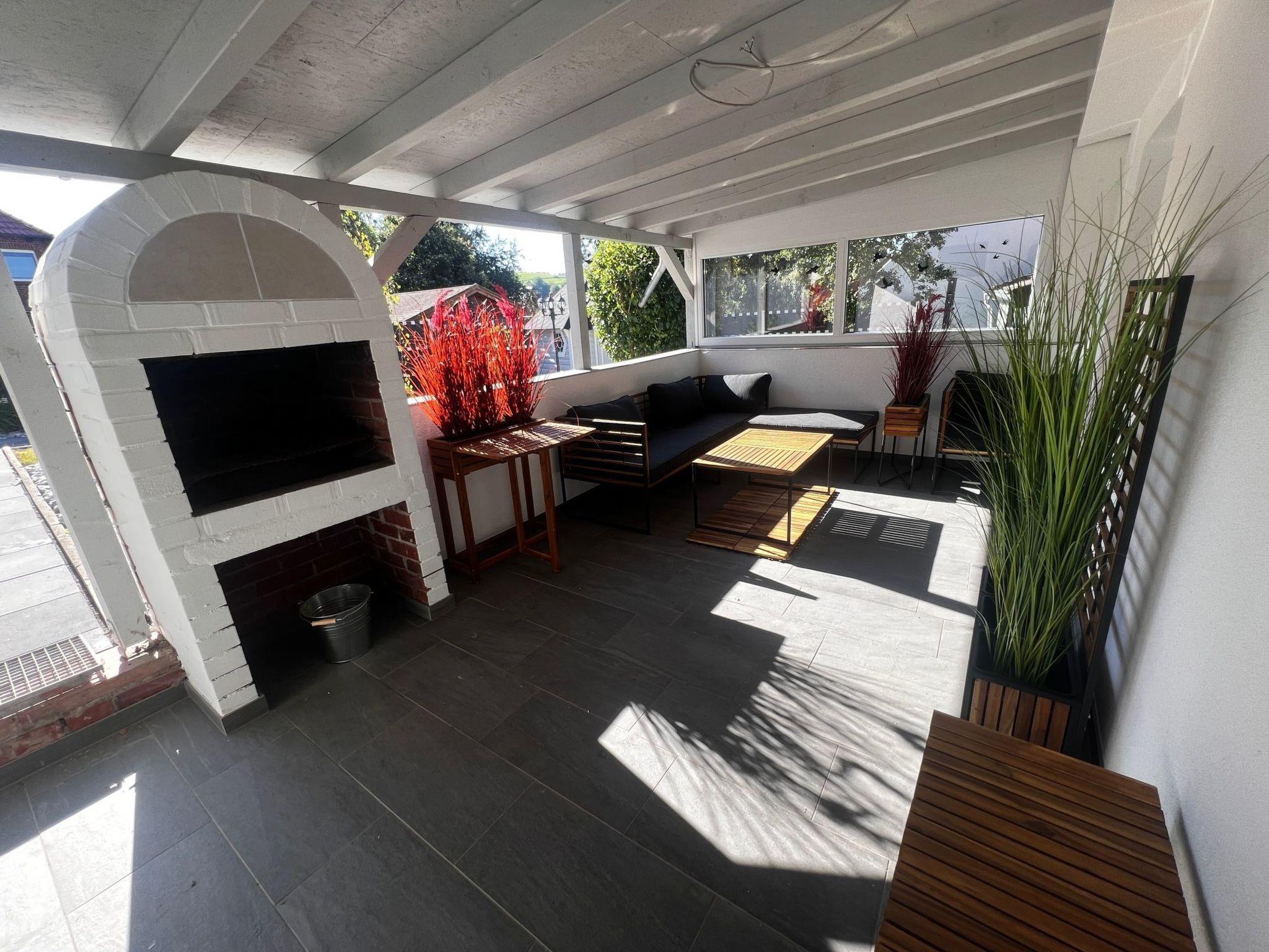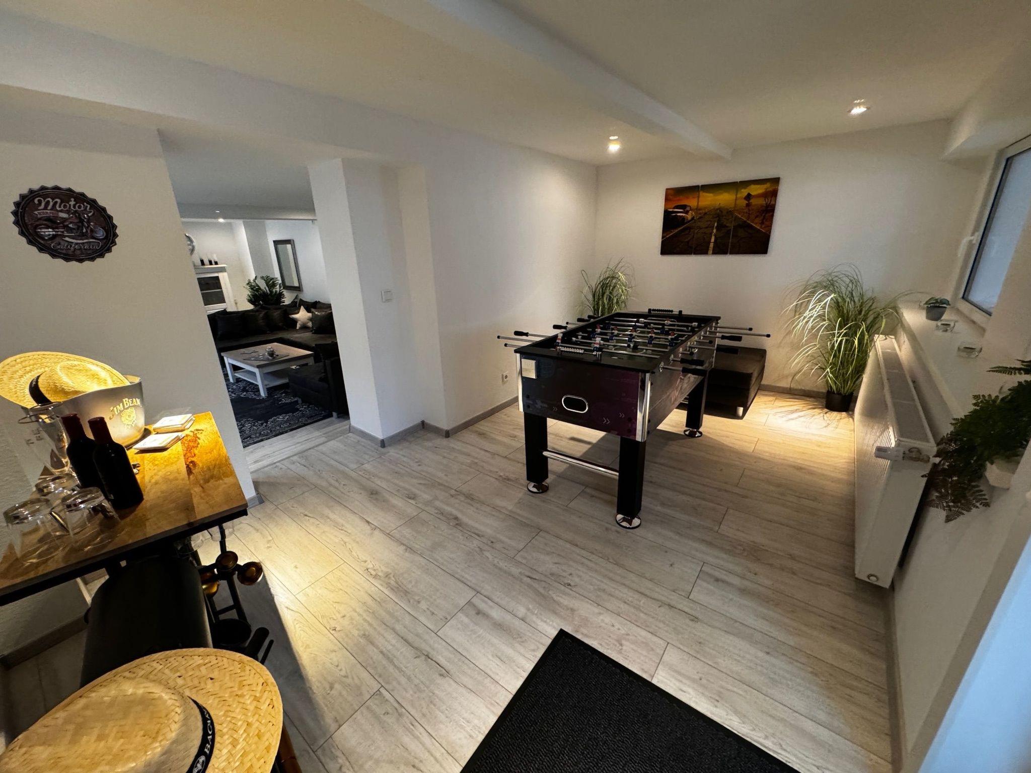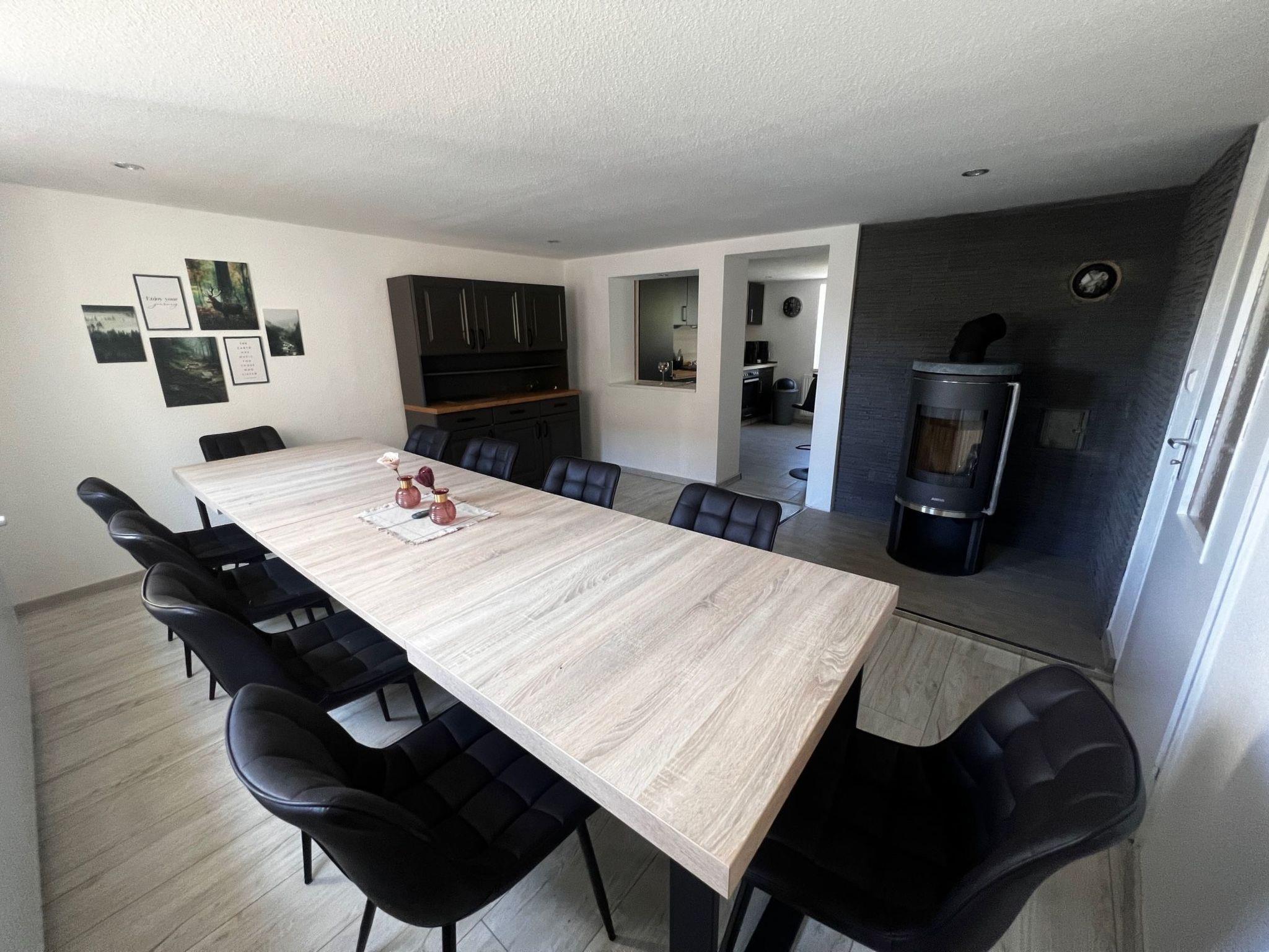 Newly renovated and refurbished holiday home to the latest standards, with 12-person outdoor sauna, balcony terrace, covered barbecue terrace, conservatory, outdoor seating, smoking lodge in the outbuilding, 3 bathrooms, table football room, kitchen with large dining area, 12-person table and wood-burning stove. Feel-good guarantee