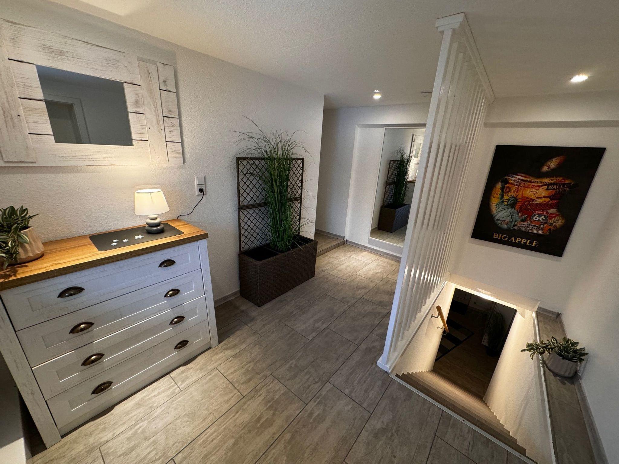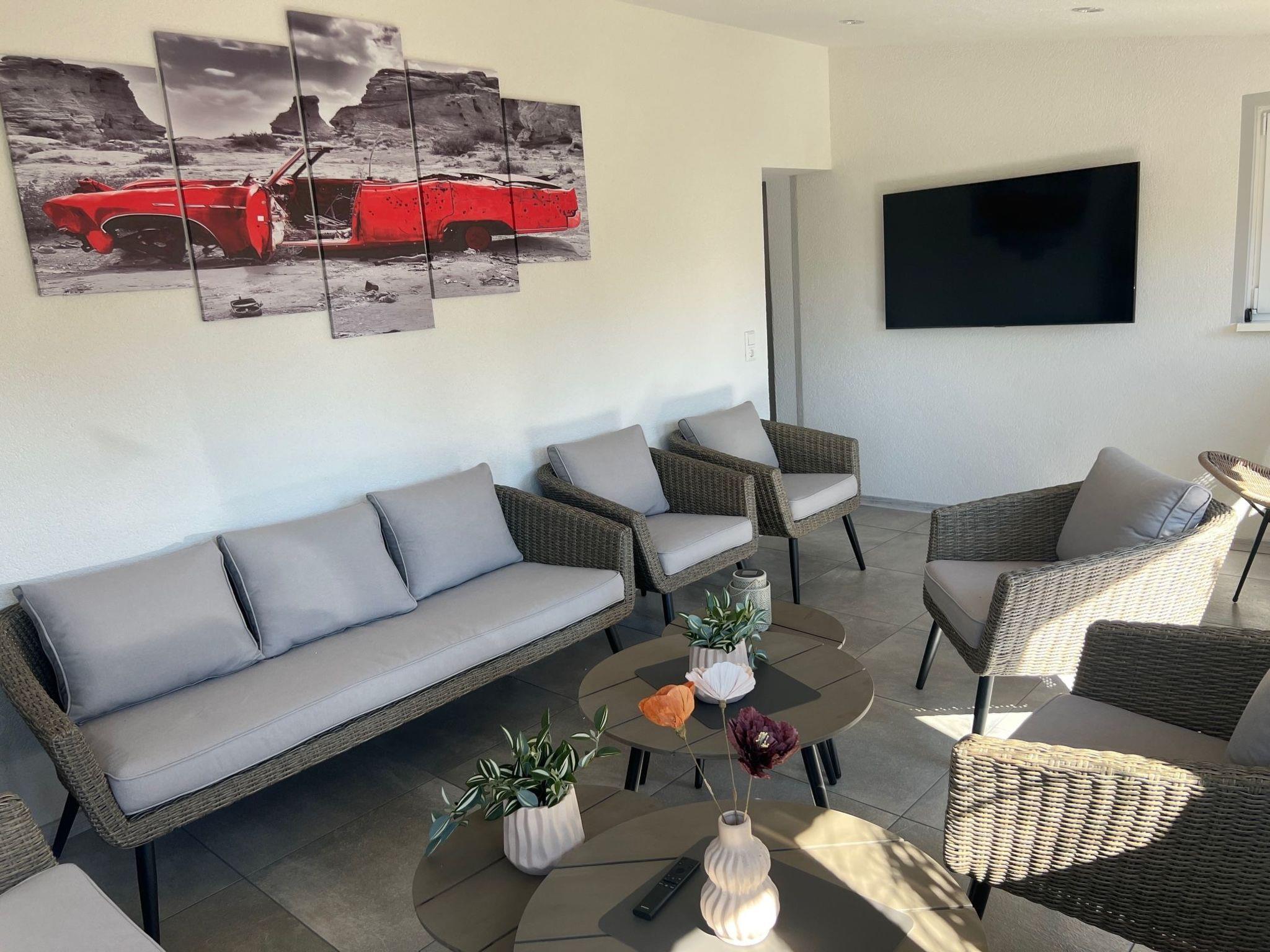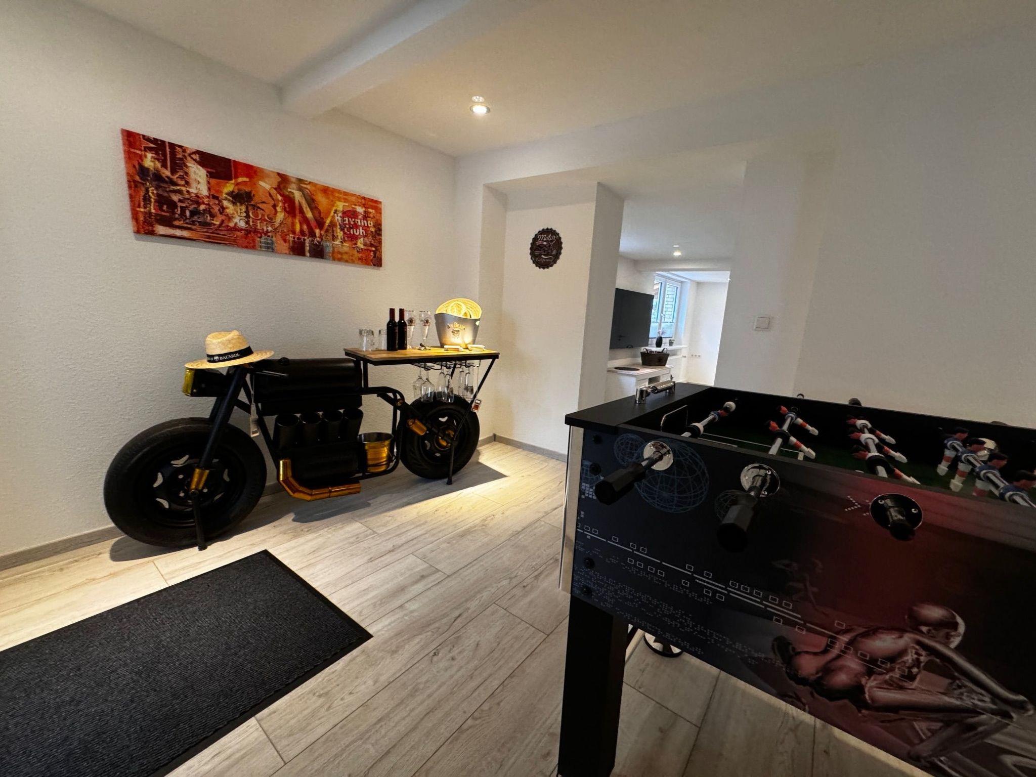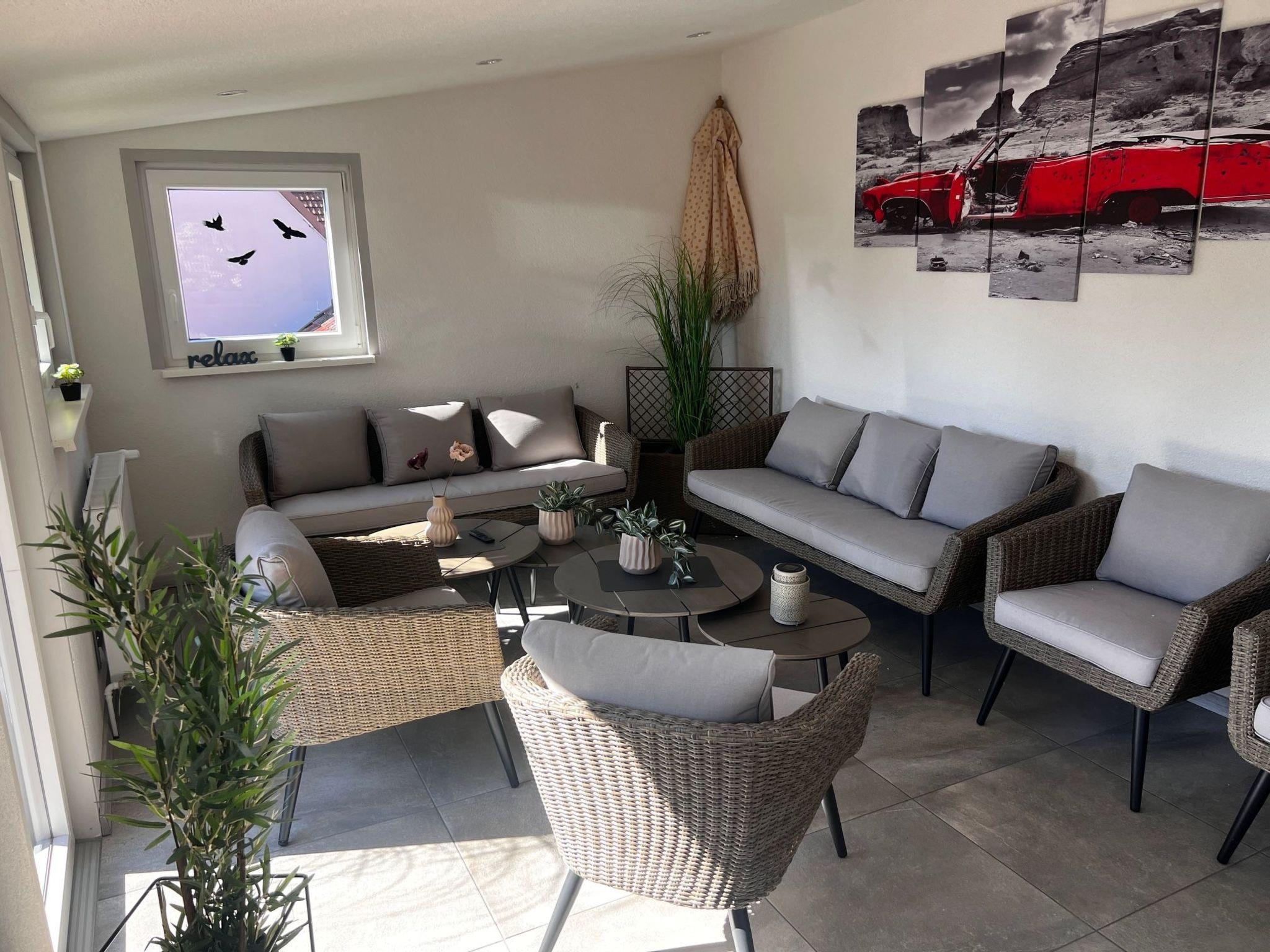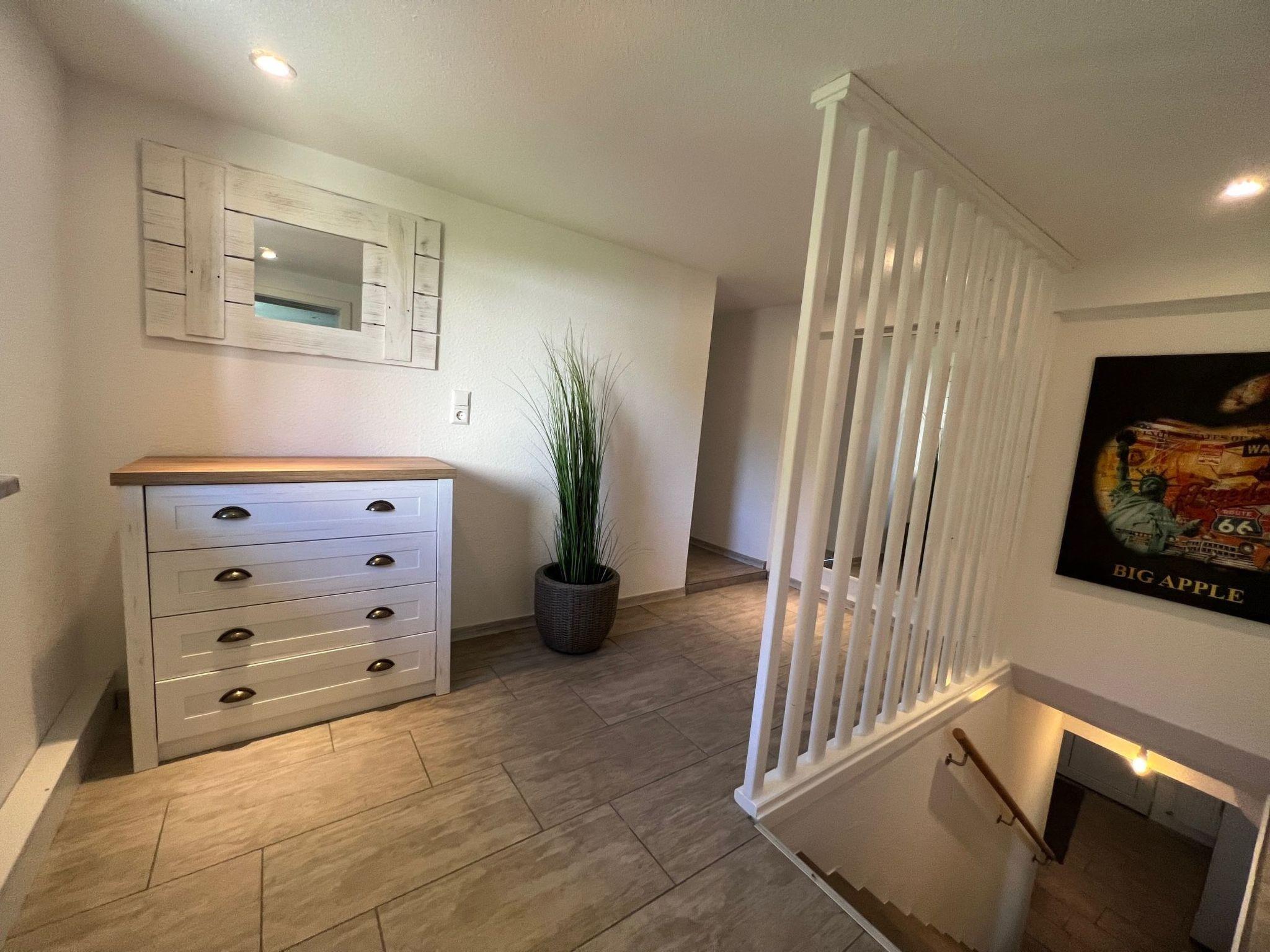 Newly renovated and refurbished holiday home to the latest standards, with 12-person outdoor sauna, balcony terrace, covered barbecue terrace, conservatory, outdoor seating, smoking lodge in the outbuilding, 3 bathrooms, table football room, kitchen with large dining area, 12-person table and wood-burning stove. Feel-good guarantee