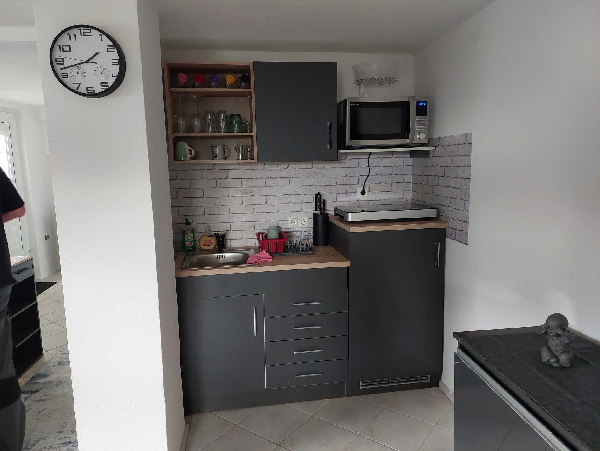 1 Küche mit Mikrowelle mit Back- und Grillfunktion, Induktionskochfeld, Filterkaffeemaschine (Filter vorhanden), Wasserkocher, Toaster, Kühlschrank mit Gefrierfach, Küchenuntensilien für 4 Personen (Gläser, Tassen, Teller, Besteck, Töpfe, Pfanne usw.)