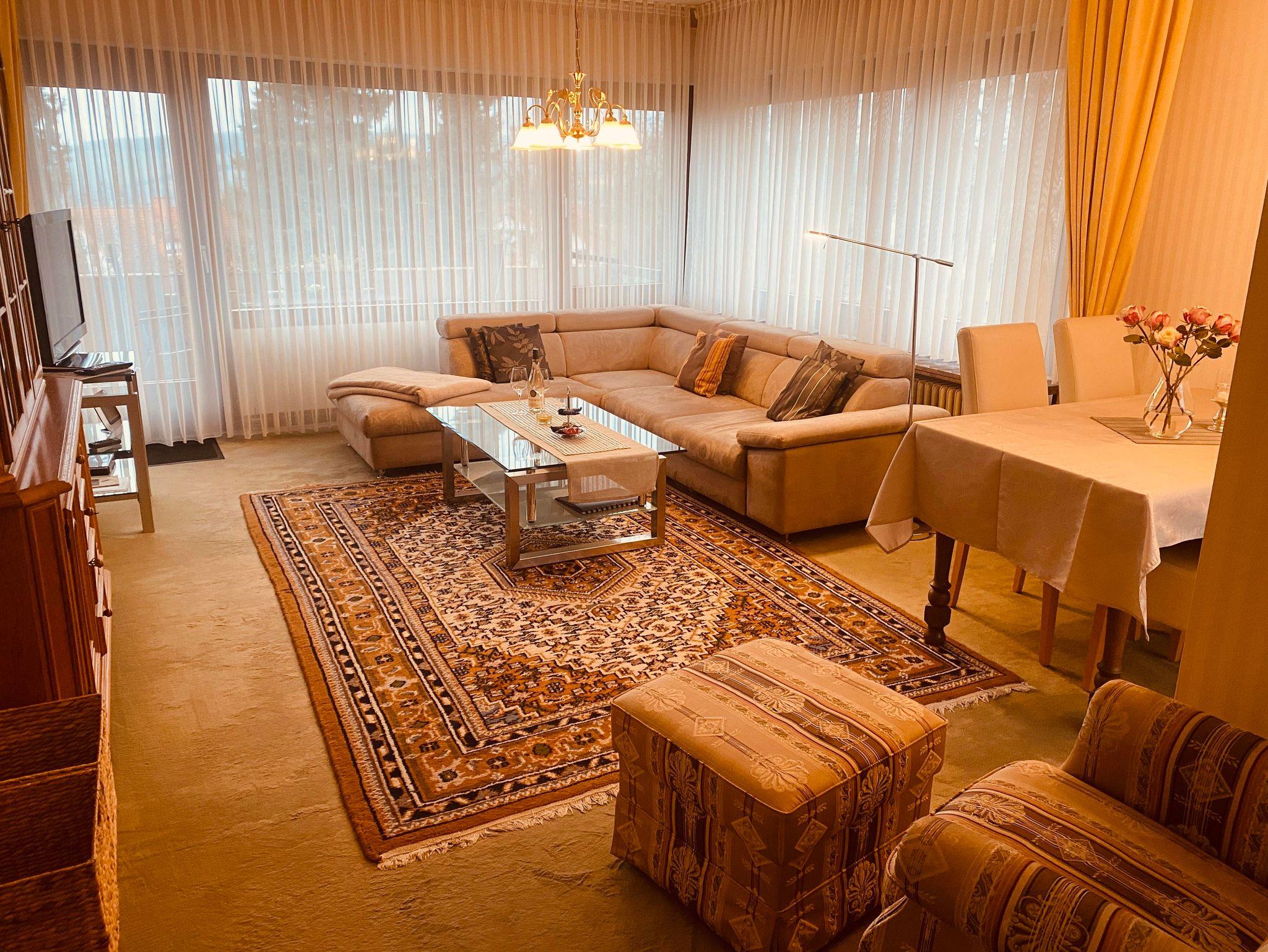 Die Ferienwohnung ist ca. 70 qm groß. Sie verfügt über ein Wohnzimmer mit einem gemütlichen Sofa, einem Flachbild - TV und einer kleinen Sitzecke. Außerdem bietet die Wohnung zwei überdachte Balkone mit Balkonmöbeln und einem herrlichen Ausblick. Die Küche besteht aus einer Küchenzeile mit Herd und Backofen und einem Kühlschrank mit Gefrierfach. Außerdem steht Ihnen eine Kaffeemaschine, ein Toaster sowie ein Wasserkocher zur Verfügung. Das Schlafzimmer ist mit einem Doppelbett ausgestattet. Im Kleiderschrank finden Sie genügend Platz für Ihre mitgebrachten Sachen. Das Badezimmer ist mit einer Dusche bestückt. Im Spiegelschrank finden Sie genügend Platz für Ihre Baduitensilien. Außerdem steht Ihnen ein Fön sowie Handtücher, Bettwäsche und Spültücher zur Verfügung.