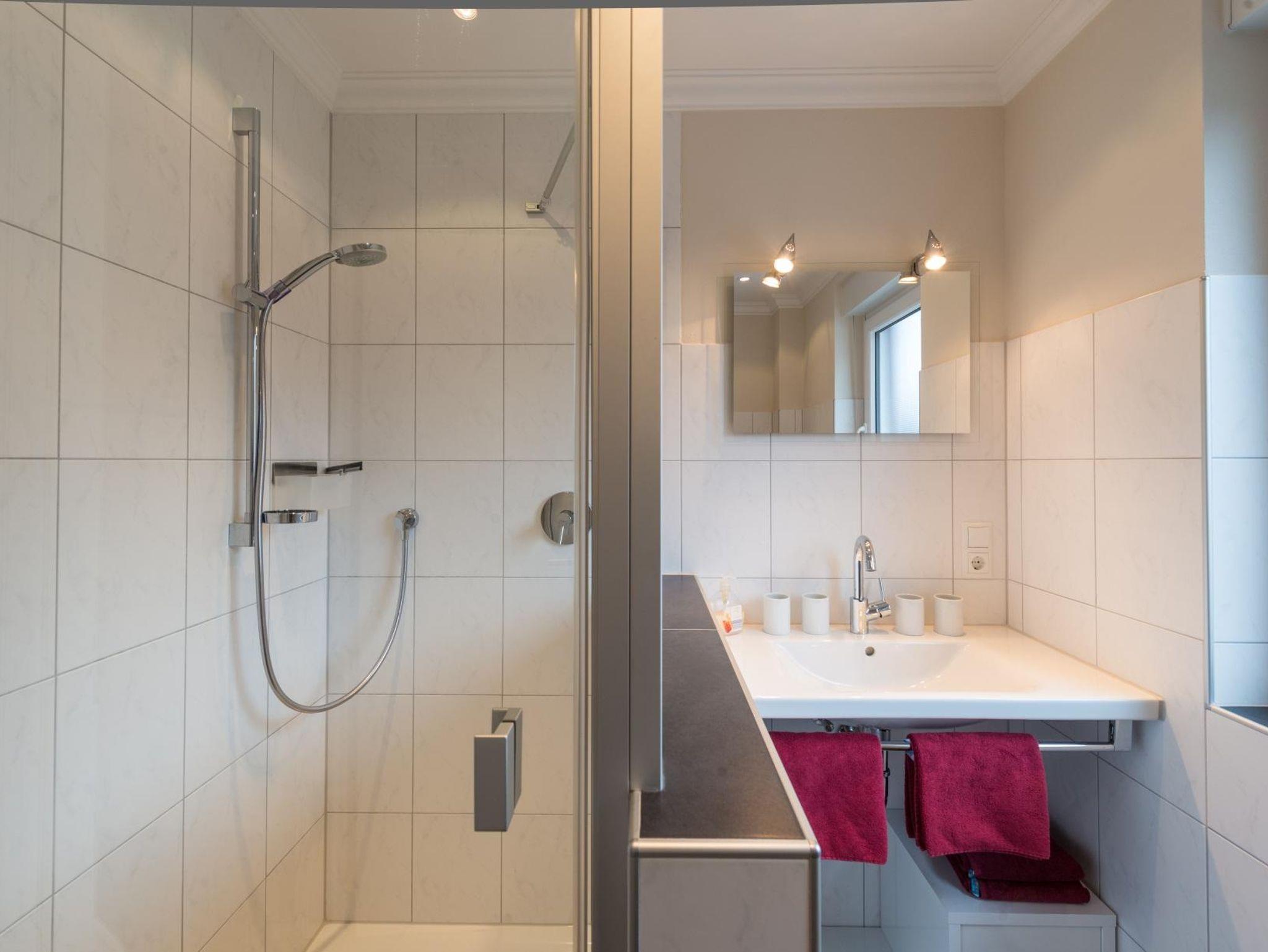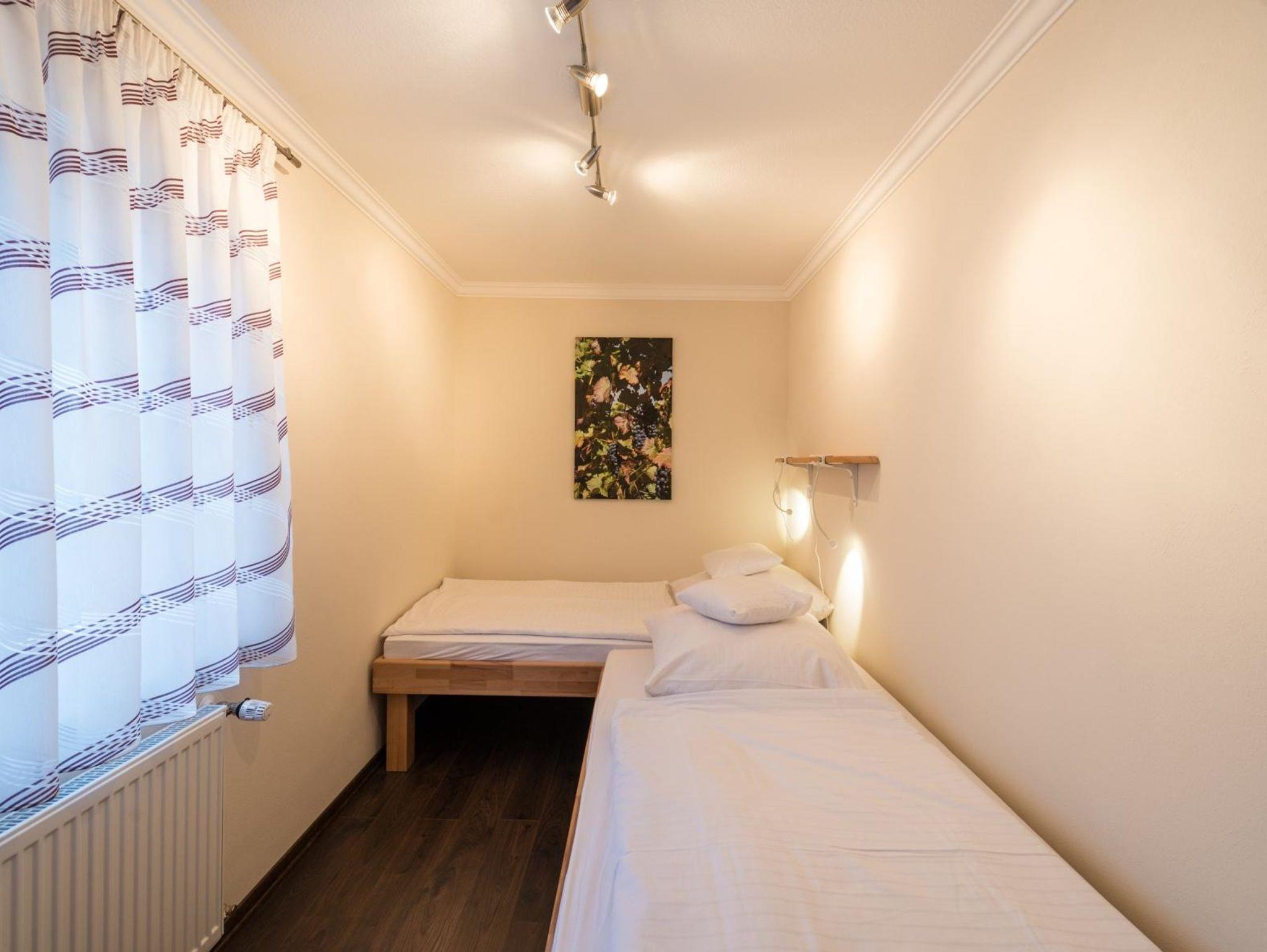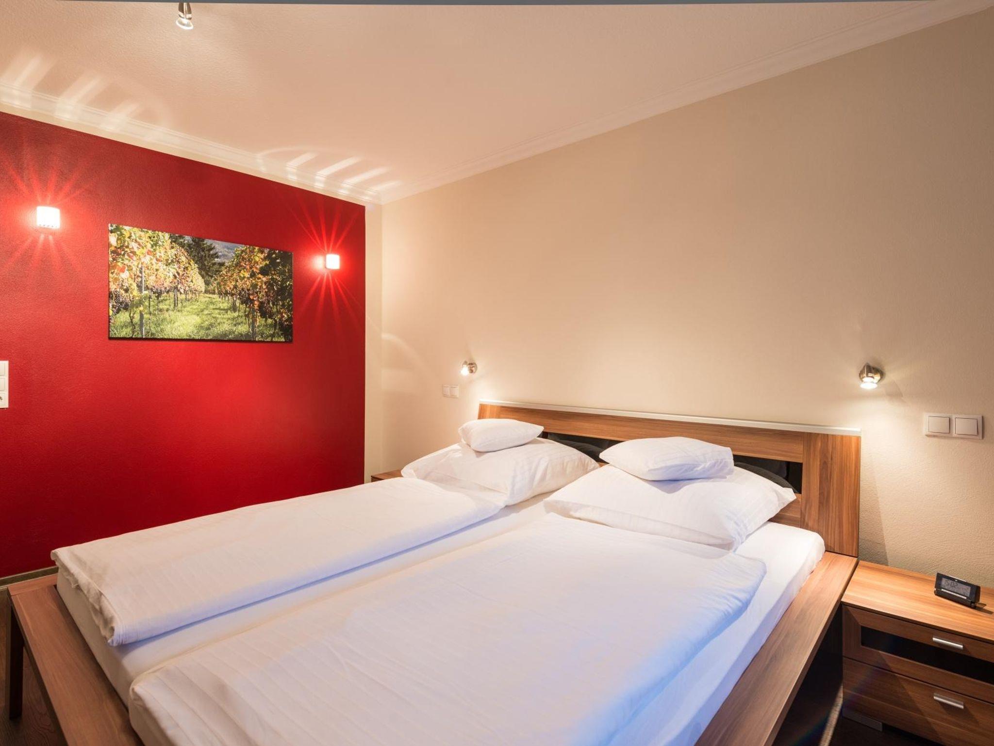 Die Wohnung ist in ansprechenden Weinrot- und Beigetönen gestaltet, was eine wohlige und warme Atmosphäre schafft. Sie finden zwei geräumige Schlafzimmer: Das erste Schlafzimmer ist mit einem komfortablen Doppelbett ausgestattet, während das zweite Schlafzimmer zwei Einzelbetten (100 x 200 cm) bietet. Große Schränke in beiden Schlafräumen sorgen für ausreichend Stauraum.