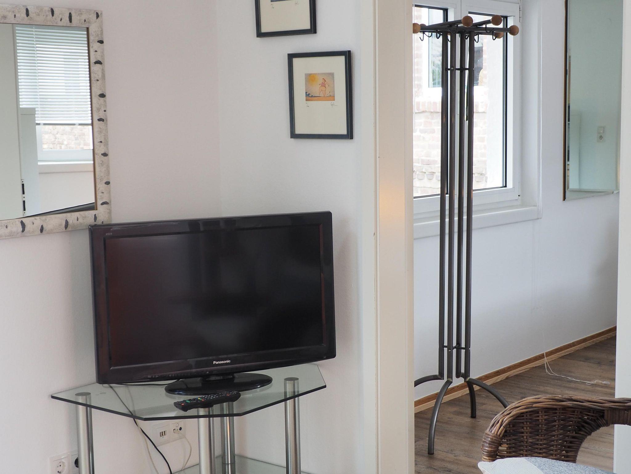 Wohnen überm Atelier ist eine helle und liebevoll eingerichtete Wohnung geeignet für 1-3 Personen.Sie bietet ein geräumiges helles Schlafzimmer mit Boxspring-Doppelbett 180 x 200 cm , Nachttische mit Beleuchtung , Steckdosen am Bett und einem Regal mit einigen gut erhaltenen spannenden Büchern. Über eine steile Treppe erreicht man den Raum mit einen Einzelbett.Die offene Wohnküche ist mit Mikrowelle, Herd mit Ceranfeld und Kühl-Gefrierschrank ausgestattet. Ebenso stehen viele Gewürze, Essig,Öl, Zucker, Süßstoff,Küchentücher und Spülmittel zur Benutzung bereit.Im Tageslicht-Bad befindet sich eine große Dusche , sowie Föhn , Badetücher sowie Besen und Staubsauger. Kabel-TV und freies WiFi sind ebenso vorhanden. Der Balko ist windgeschützt und auf ihm dürfte geraucht werden. Für den Hund stehen Näpfe bereit.