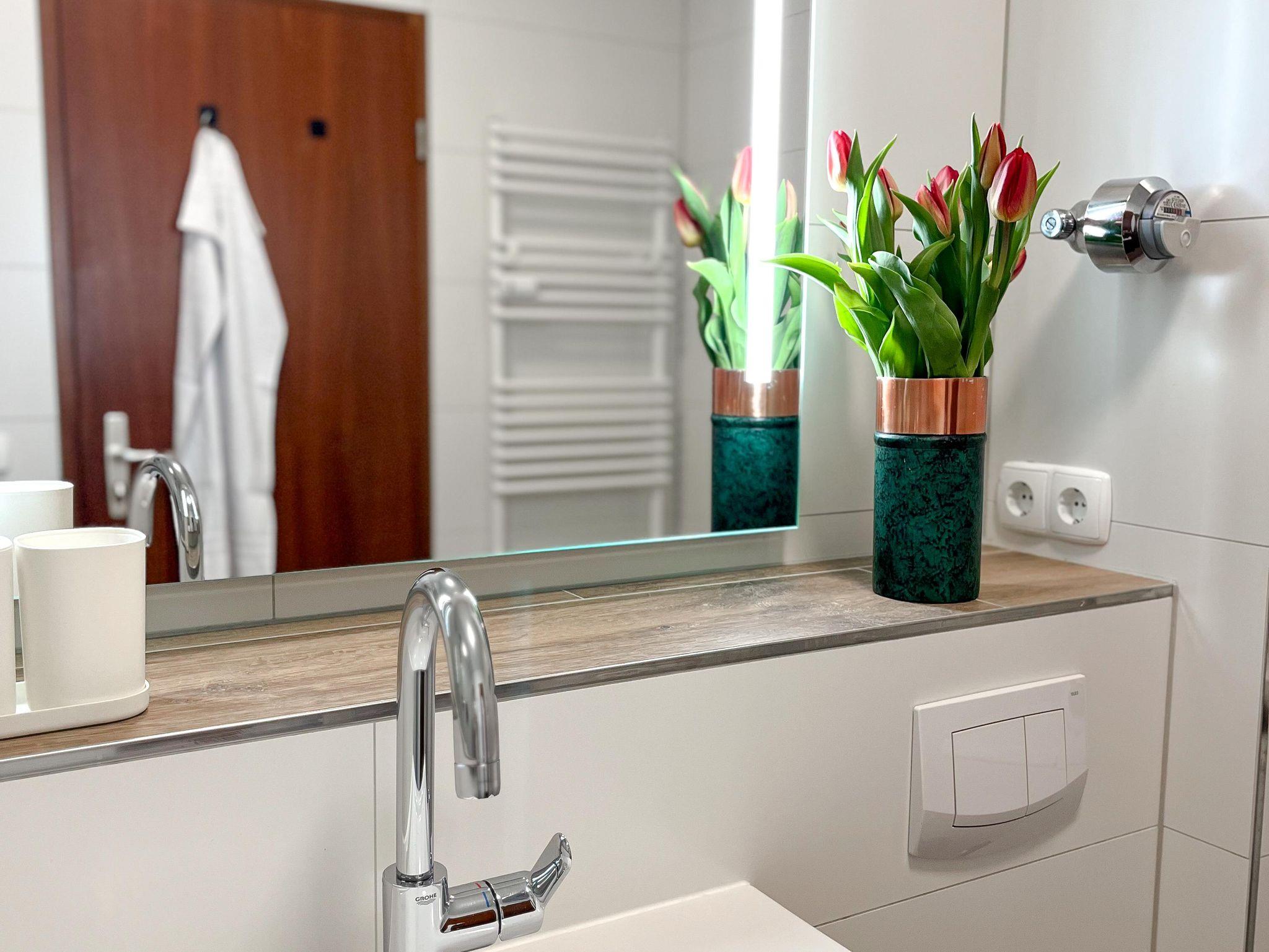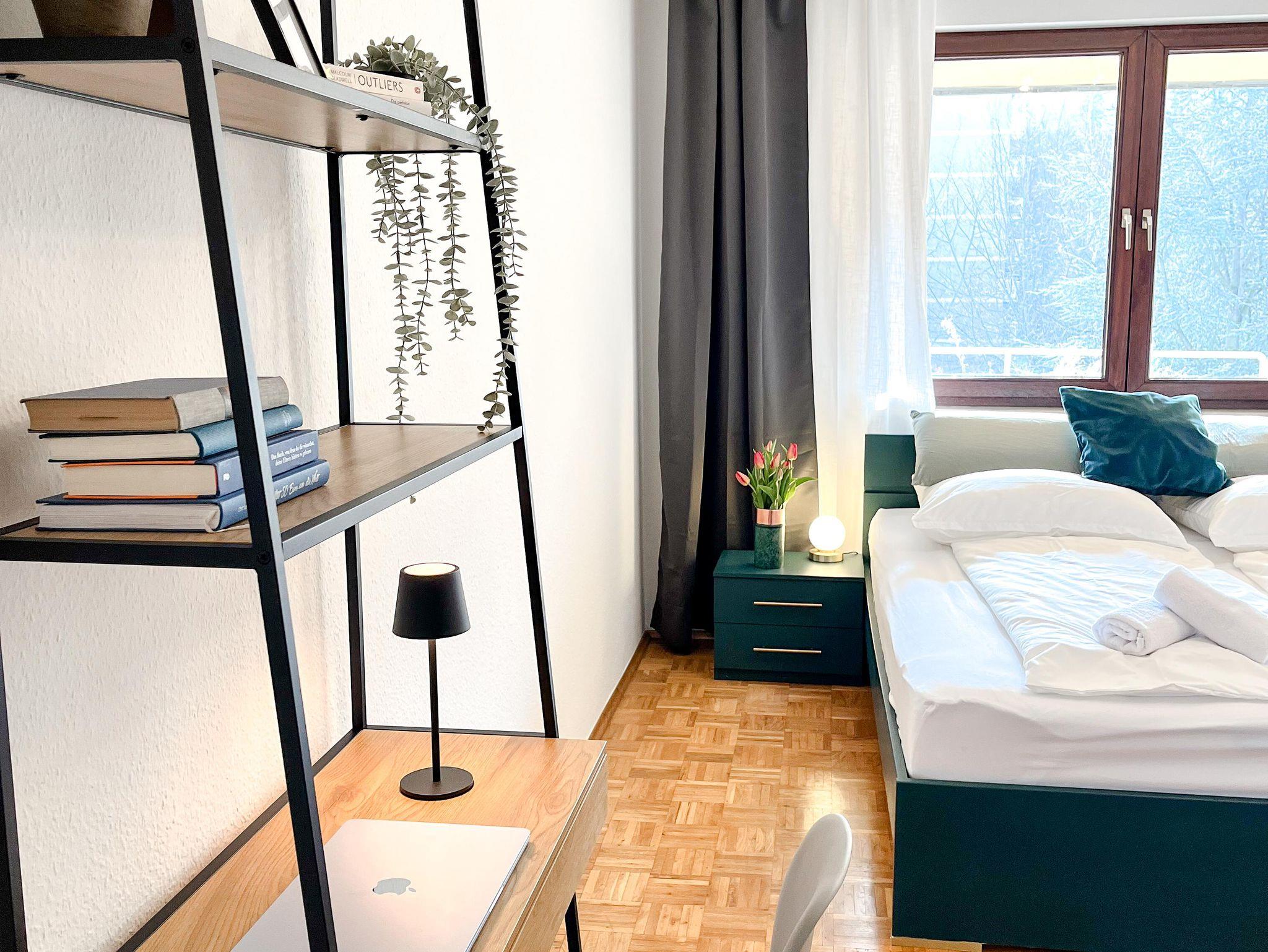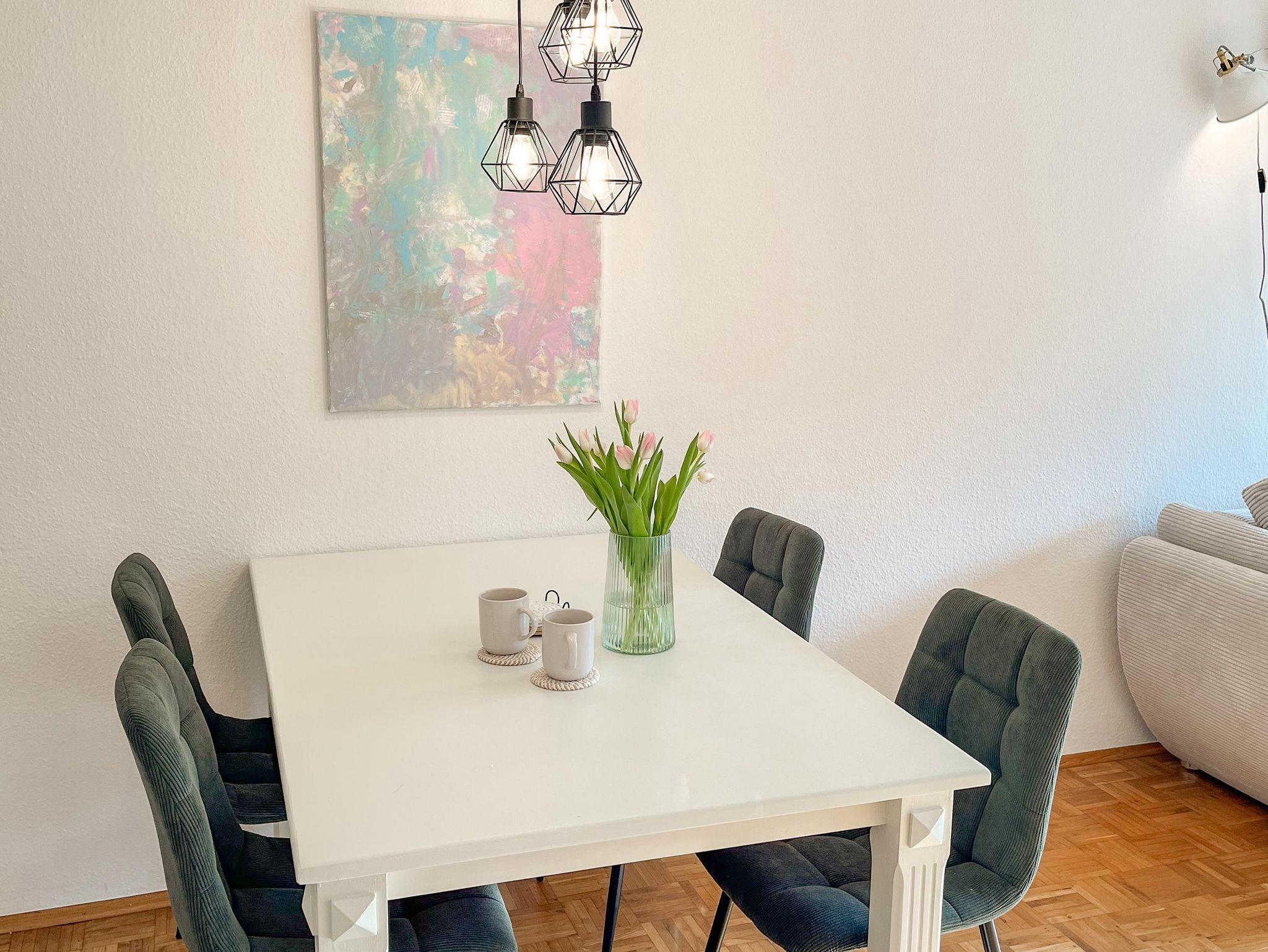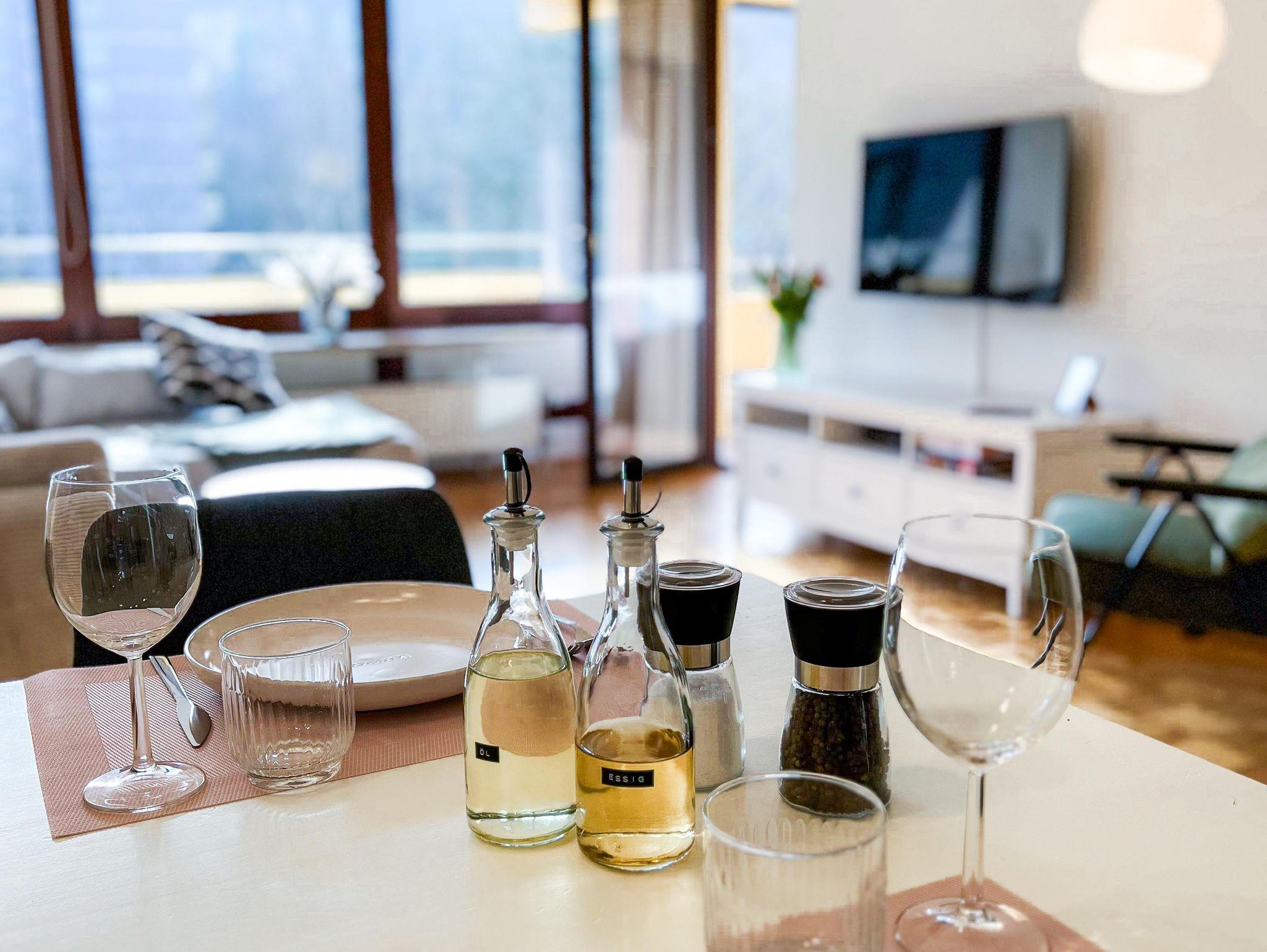 Das ca. 67 m² große, moderne Apartment im 3. Stock bietet eine komfortable und stilvolle Ausstattung für bis zu vier Personen. Es verfügt über ein separates Schlafzimmer mit Doppelbett sowie ein großzügiges Wohnzimmer mit gemütlicher Schlafcouch (1,30m) für 1-2 weitere Gäste, Sitzbereich und Smart-TV mit Streaming-Funktionen. Die voll ausgestattete Küche umfasst unter anderem Geschirrspüler, Kaffeemaschine, Wasserkocher, Gefrierschrank sowie alle notwendigen Kochutensilien und einen Esstisch. Ein besonderes Highlight ist die große, überdachte Loggia mit Süd-Ost-Ausrichtung und schönem Ausblick ins Grüne, die sich ideal für entspannte Stunden im Freien eignet. Das Badezimmer ist modern ausgestattet und bietet unter anderem eine Regendusche, Haartrockner sowie Pflegeprodukte. Zusätzlich stehen eine Waschmaschine, kostenfreies WLAN, ein Arbeitsplatz sowie eine kleine Bluetooth Soundbox zur Verfügung. Hochwertige Bettwäsche und Handtücher sind inklusive, ebenso ein praktisches Willkommens-Set mit Kaffee, Tee und Küchen-Basics. Die Wohnung ist barrierefrei zugänglich und bietet durchdachte Annehmlichkeiten für einen rundum angenehmen Aufenthalt. Rauchen ist im Apartment nicht gestattet.
