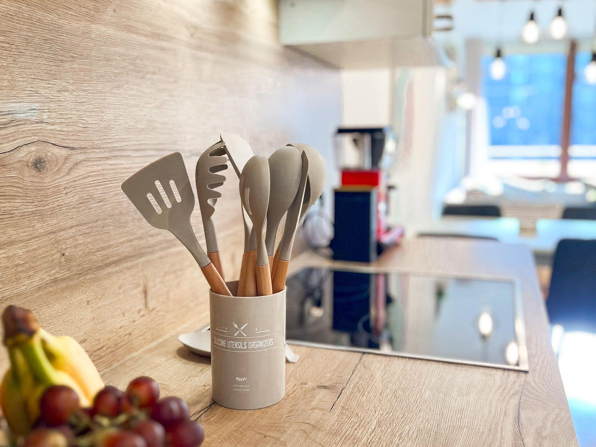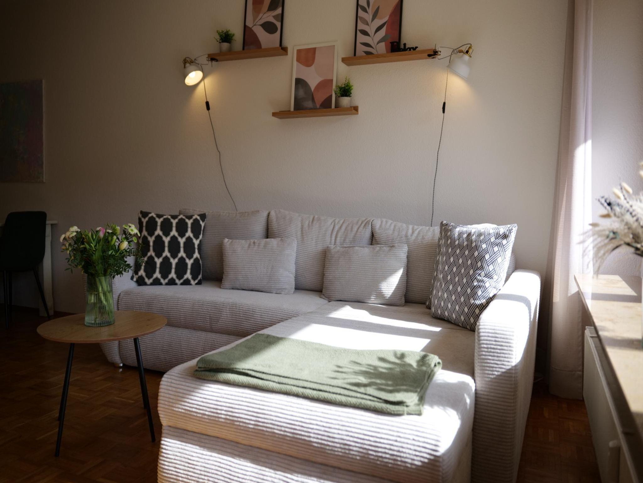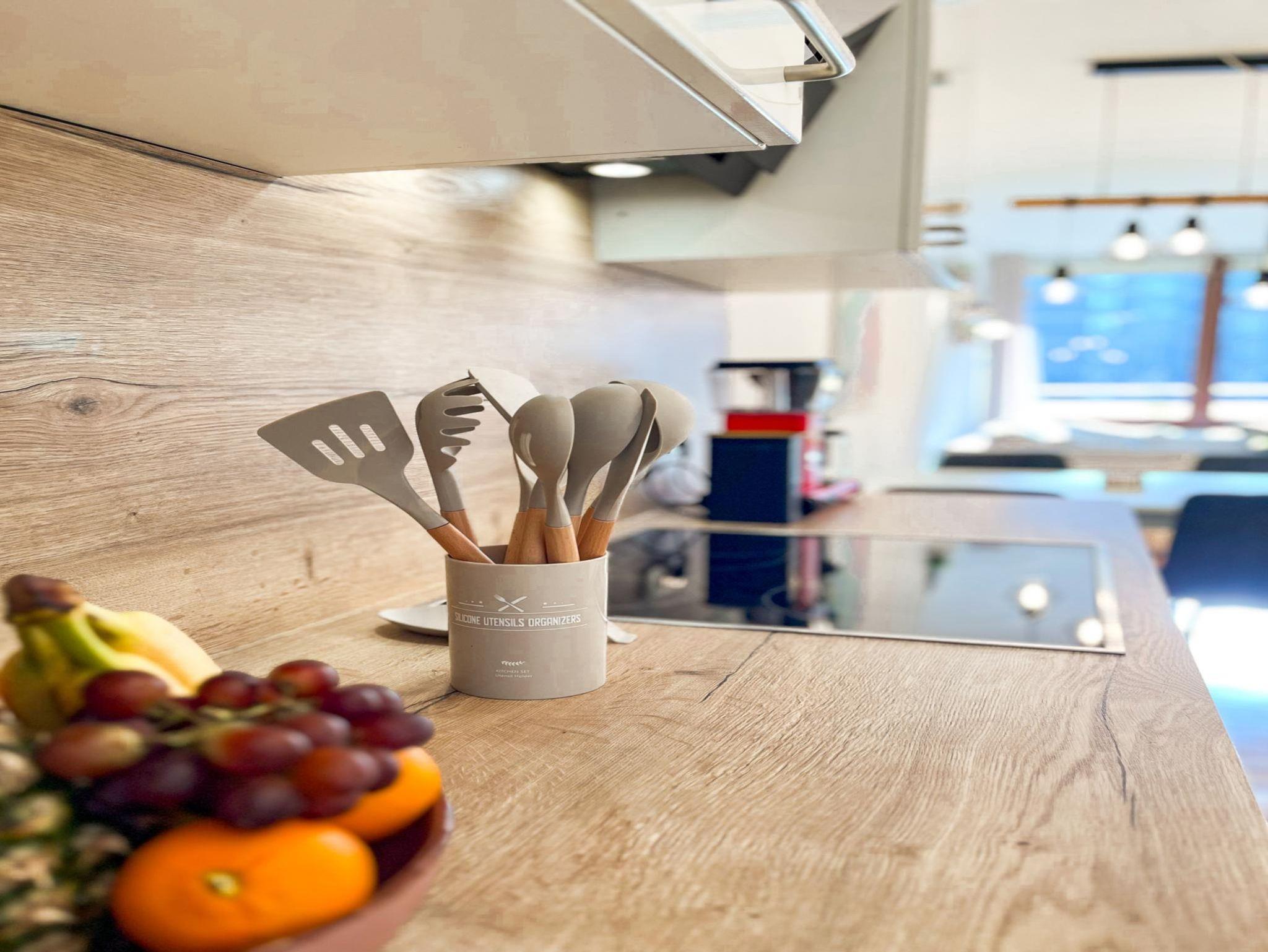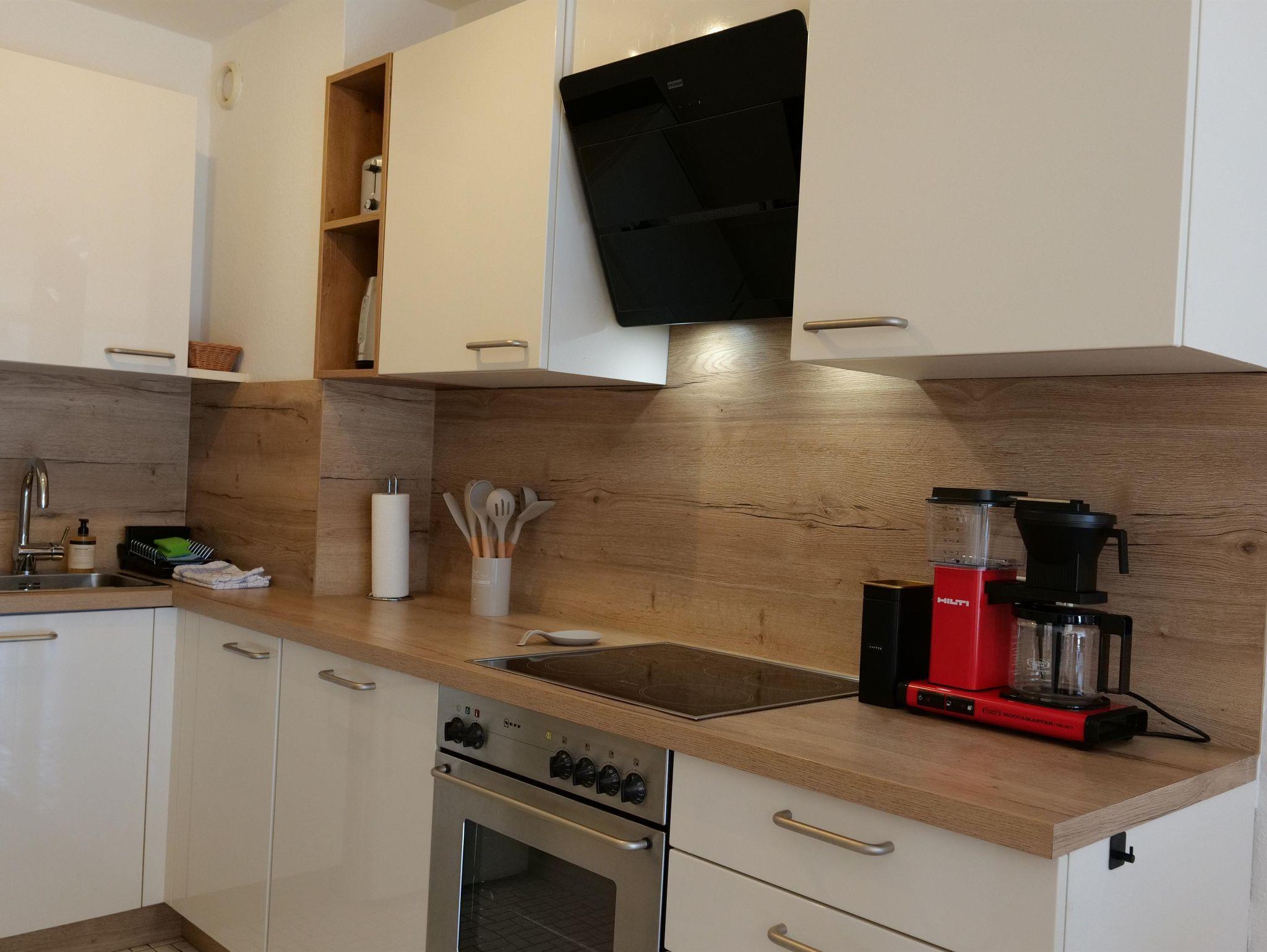 Das ca. 67 m² große, moderne Apartment im 3. Stock bietet eine komfortable und stilvolle Ausstattung für bis zu vier Personen. Es verfügt über ein separates Schlafzimmer mit Doppelbett sowie ein großzügiges Wohnzimmer mit gemütlicher Schlafcouch (1,30m) für 1-2 weitere Gäste, Sitzbereich und Smart-TV mit Streaming-Funktionen. Die voll ausgestattete Küche umfasst unter anderem Geschirrspüler, Kaffeemaschine, Wasserkocher, Gefrierschrank sowie alle notwendigen Kochutensilien und einen Esstisch. Ein besonderes Highlight ist die große, überdachte Loggia mit Süd-Ost-Ausrichtung und schönem Ausblick ins Grüne, die sich ideal für entspannte Stunden im Freien eignet. Das Badezimmer ist modern ausgestattet und bietet unter anderem eine Regendusche, Haartrockner sowie Pflegeprodukte. Zusätzlich stehen eine Waschmaschine, kostenfreies WLAN, ein Arbeitsplatz sowie eine kleine Bluetooth Soundbox zur Verfügung. Hochwertige Bettwäsche und Handtücher sind inklusive, ebenso ein praktisches Willkommens-Set mit Kaffee, Tee und Küchen-Basics. Die Wohnung ist barrierefrei zugänglich und bietet durchdachte Annehmlichkeiten für einen rundum angenehmen Aufenthalt. Rauchen ist im Apartment nicht gestattet.