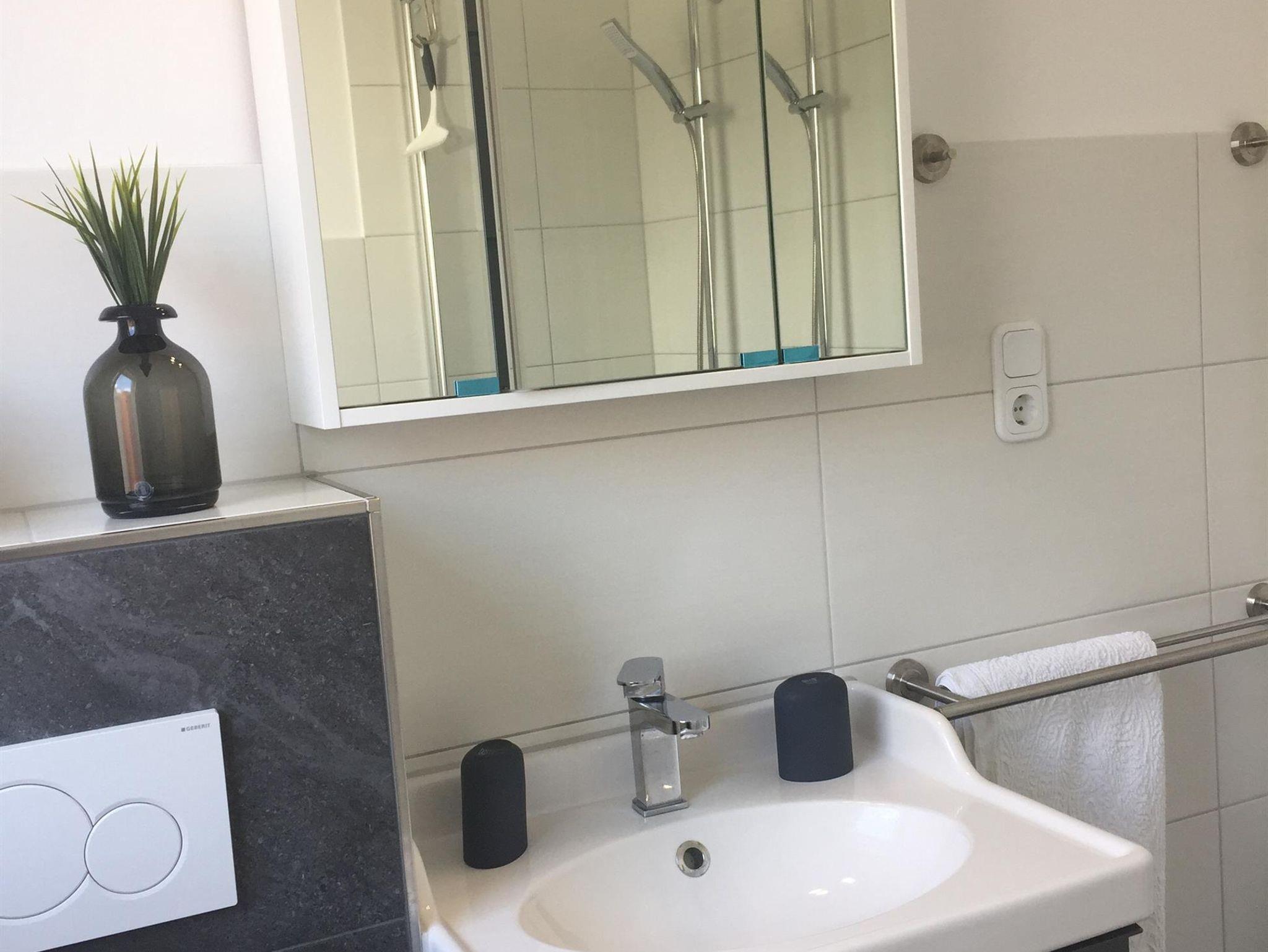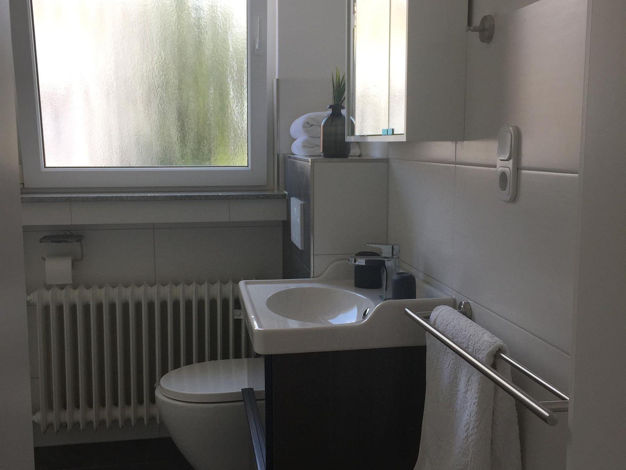 Das Badezimmer mit Tageslicht bietet neben WC und Waschbecken selbstverständlich auch eine Dusche, um sich den Staub von Anreise und Ausflügen bei ihrem Aufenthalt in Bad Neuenahr abzuwaschen und sich für den kommenden Tag wieder frisch zu machen. Alle sanitären Elemente in unserer Ferienwohnung in Bad Neuenahr sind neu inklusive einer Regendusche.