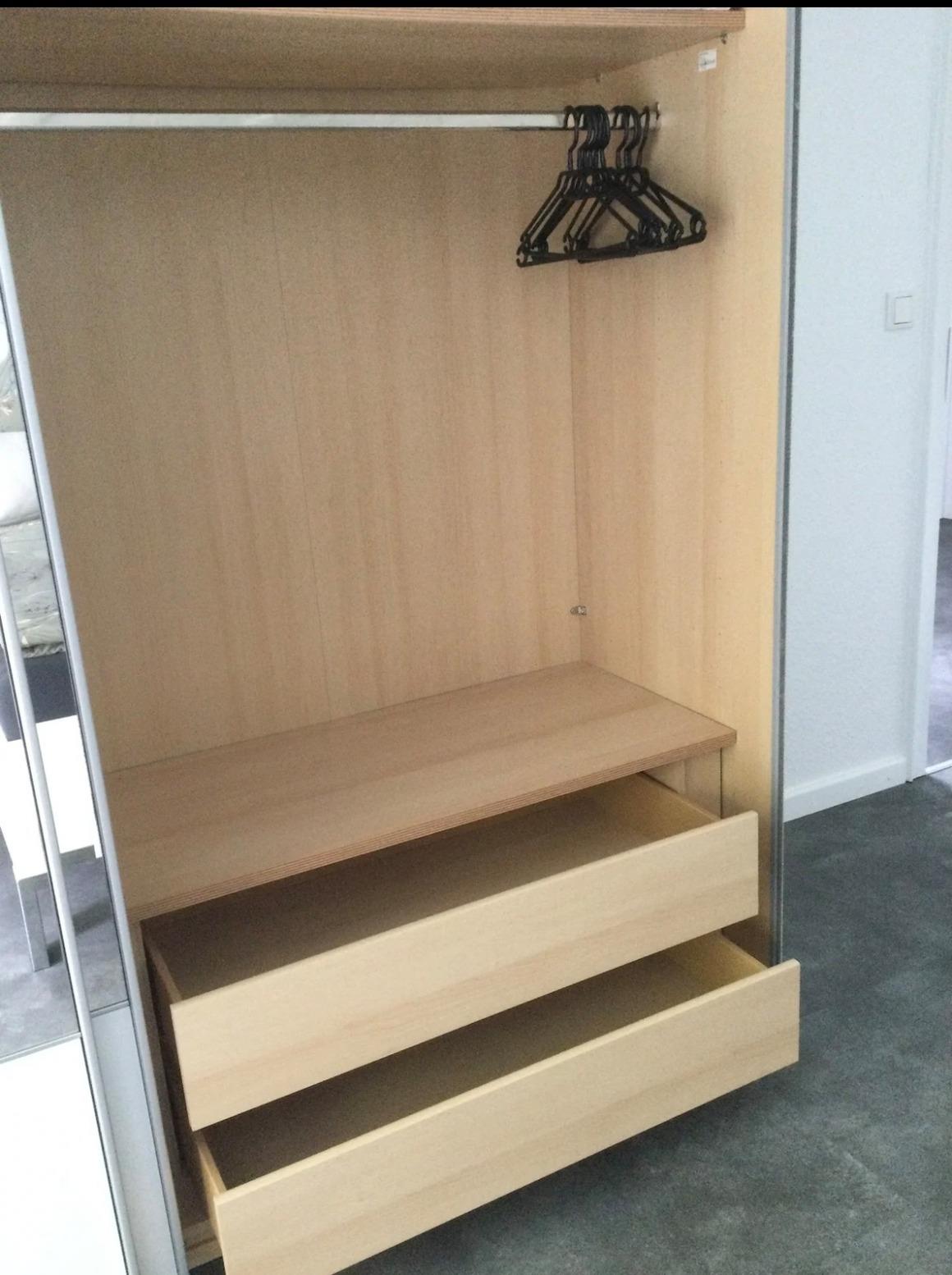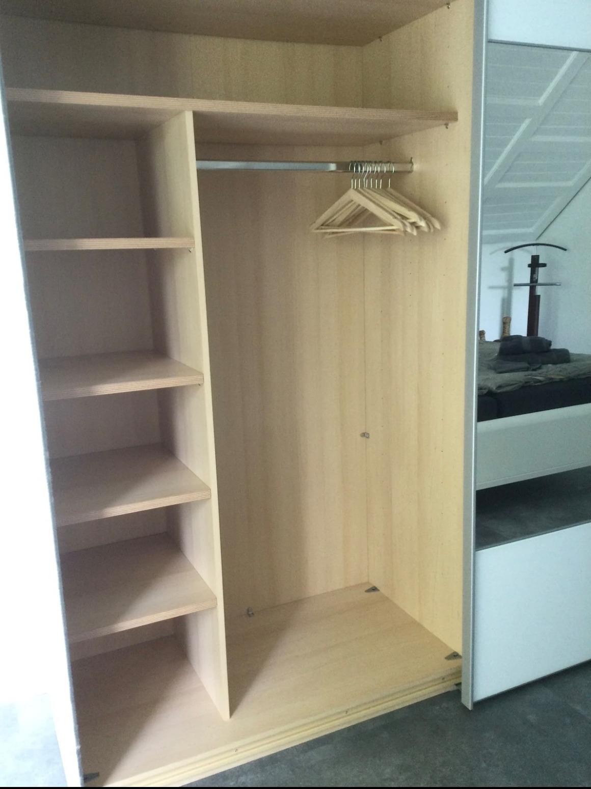 Für eine erholsame Nachtruhe erwartet dich ein komfortables Bett (180 cm x 200 cm) mit kuscheliger Bettwäsche (155 cm x 220 cm). Ein geräumiger Kleiderschrank vervollständigt das Ambiente und bietet ausreichend Platz für deine Sachen.