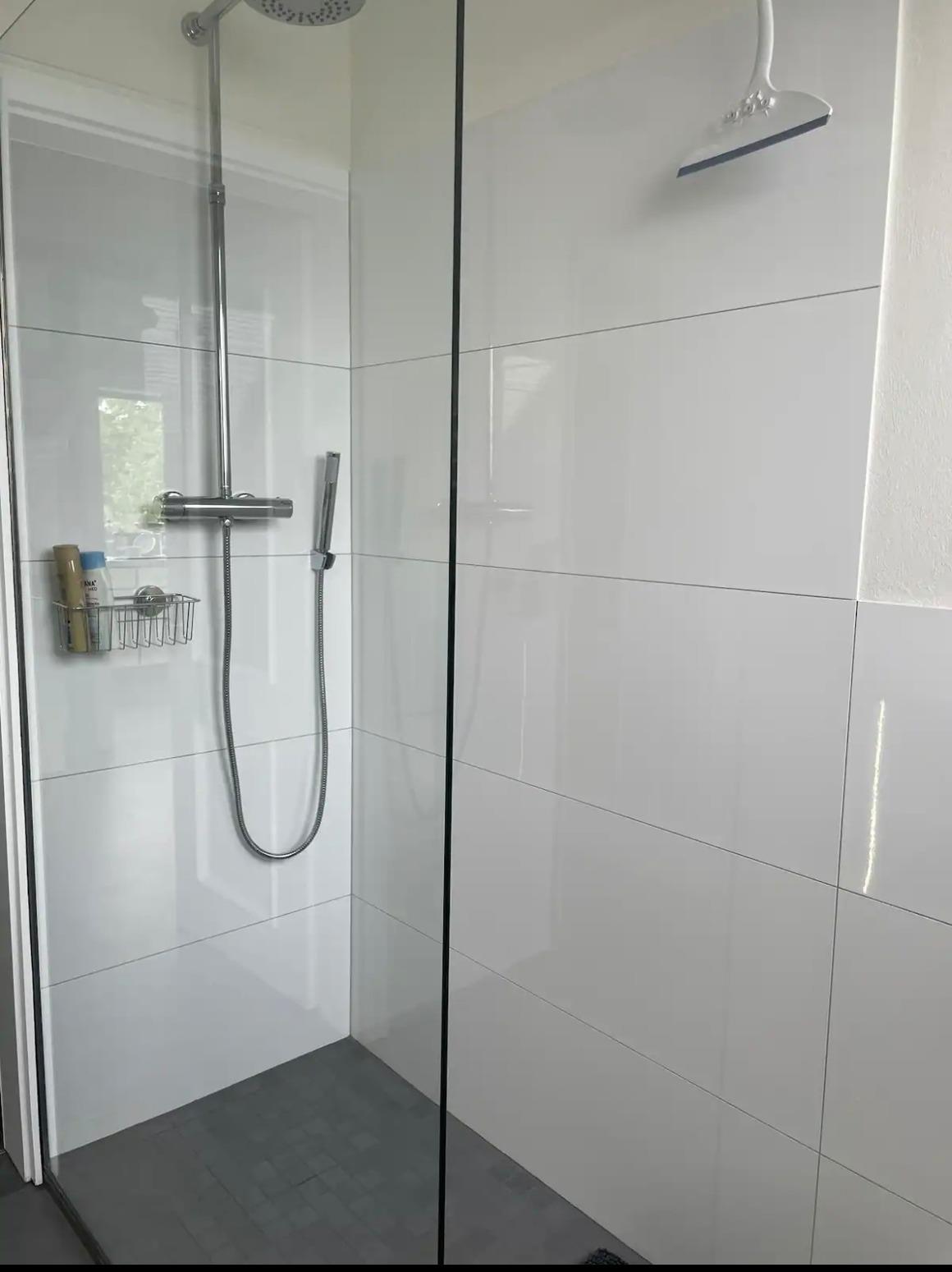 Unser Badezimmer ist mit einer ebenerdigen Dusche ausgestattet und bietet alle notwendigen Hygieneartikel, um deinen Aufenthalt angenehm zu gestalten. Elektronische Jalousien an allen Fenstern sorgen für Privatsphäre und Komfort.