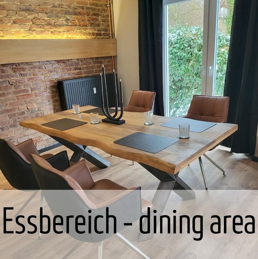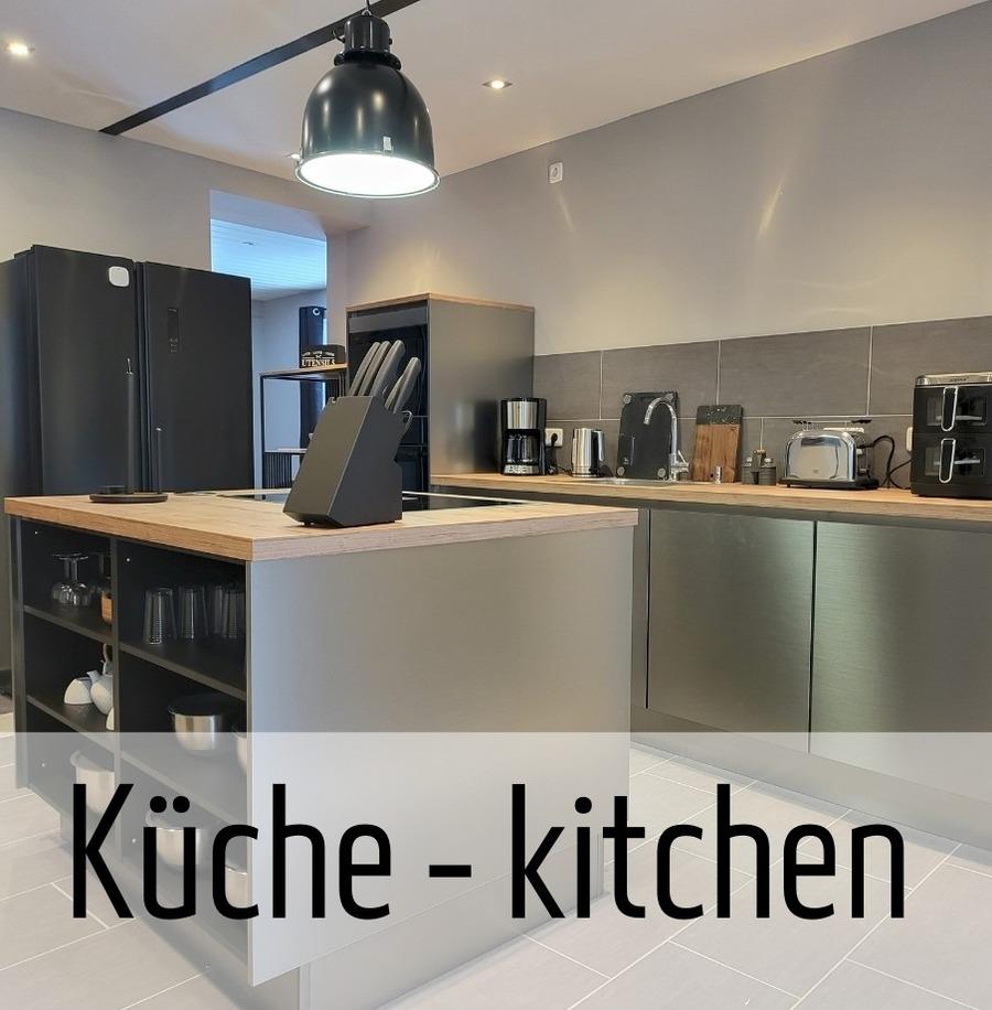 Ein besonderes Highlight ist die offene Edelstahl Küche mit Kochinsel. Die Küche ist vollausgestattetet mit Mikrowelle, Geschirrspüler, Kaffeemaschine, Heißluftfriteuse, Toaster und Wasserkocher.