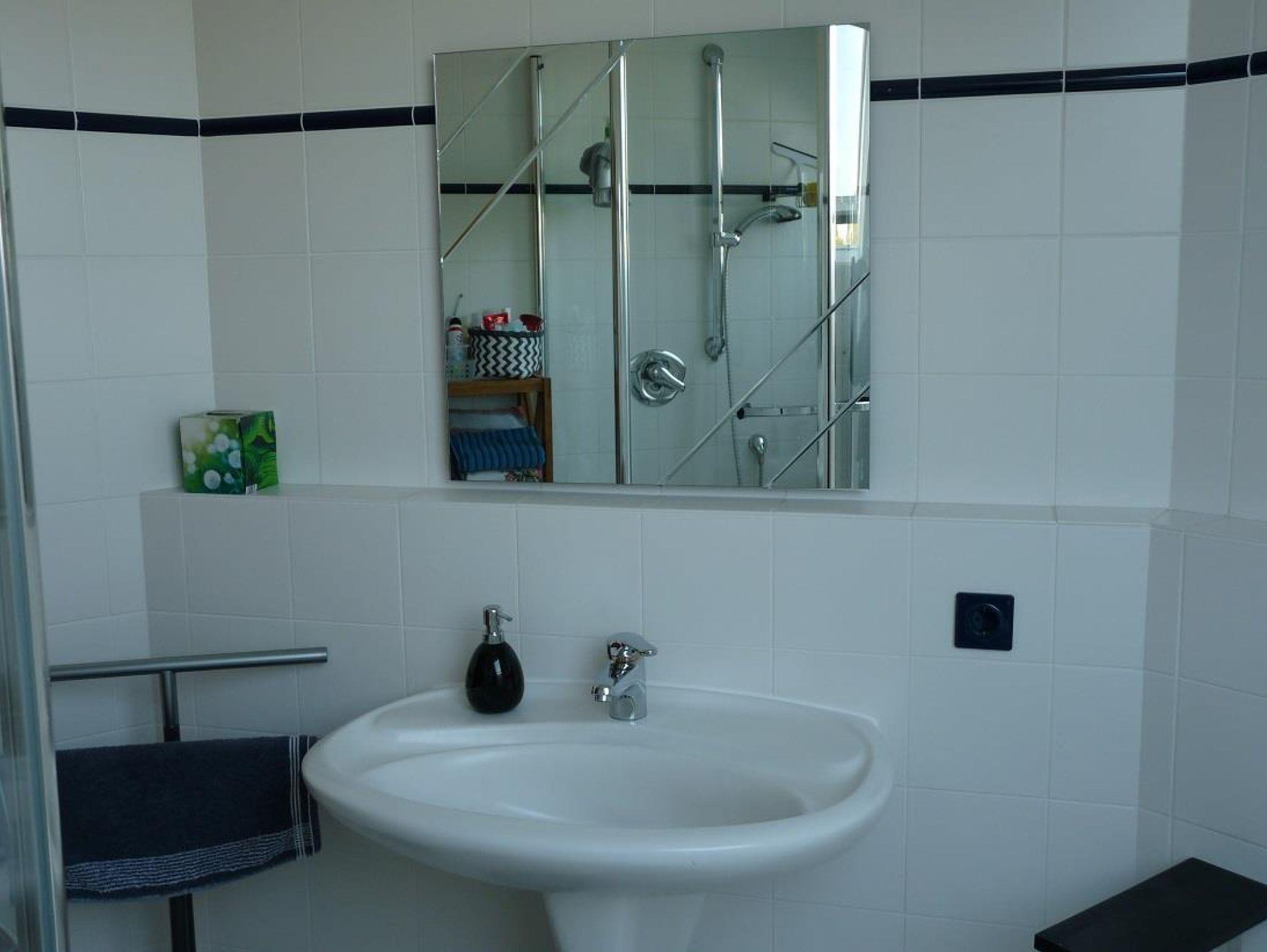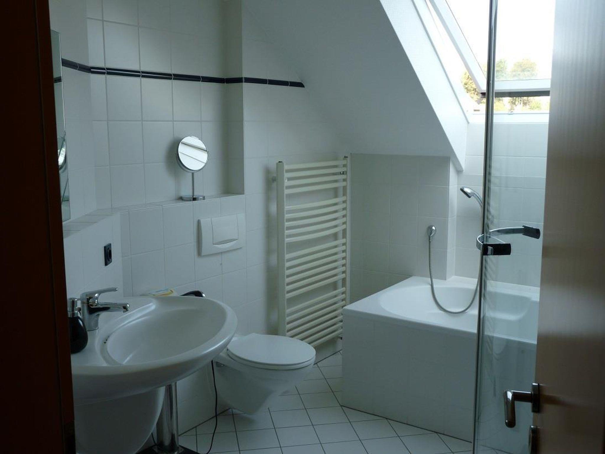 Das helle Tageslichtbadezimmer verfügt neben einer Badewanne - mit Ausblick in den Himmel- über eine Halbrunddusche mit tiefen Einstieg sowie einem WC.