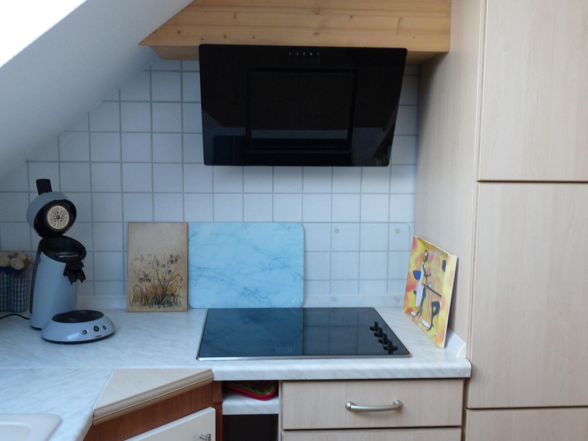 Die angrenzende Küche ist mit Elektroherd (Ceran), Kühlschrank, Mikrowelle, Kaffeemaschine (Pad), Wasserkocher, Eierkocher und Toaster ausgestattet. Für die Selbstversorgung zum Kochen und Essen sind reichlich Geschirr und Töpfe vorhanden.