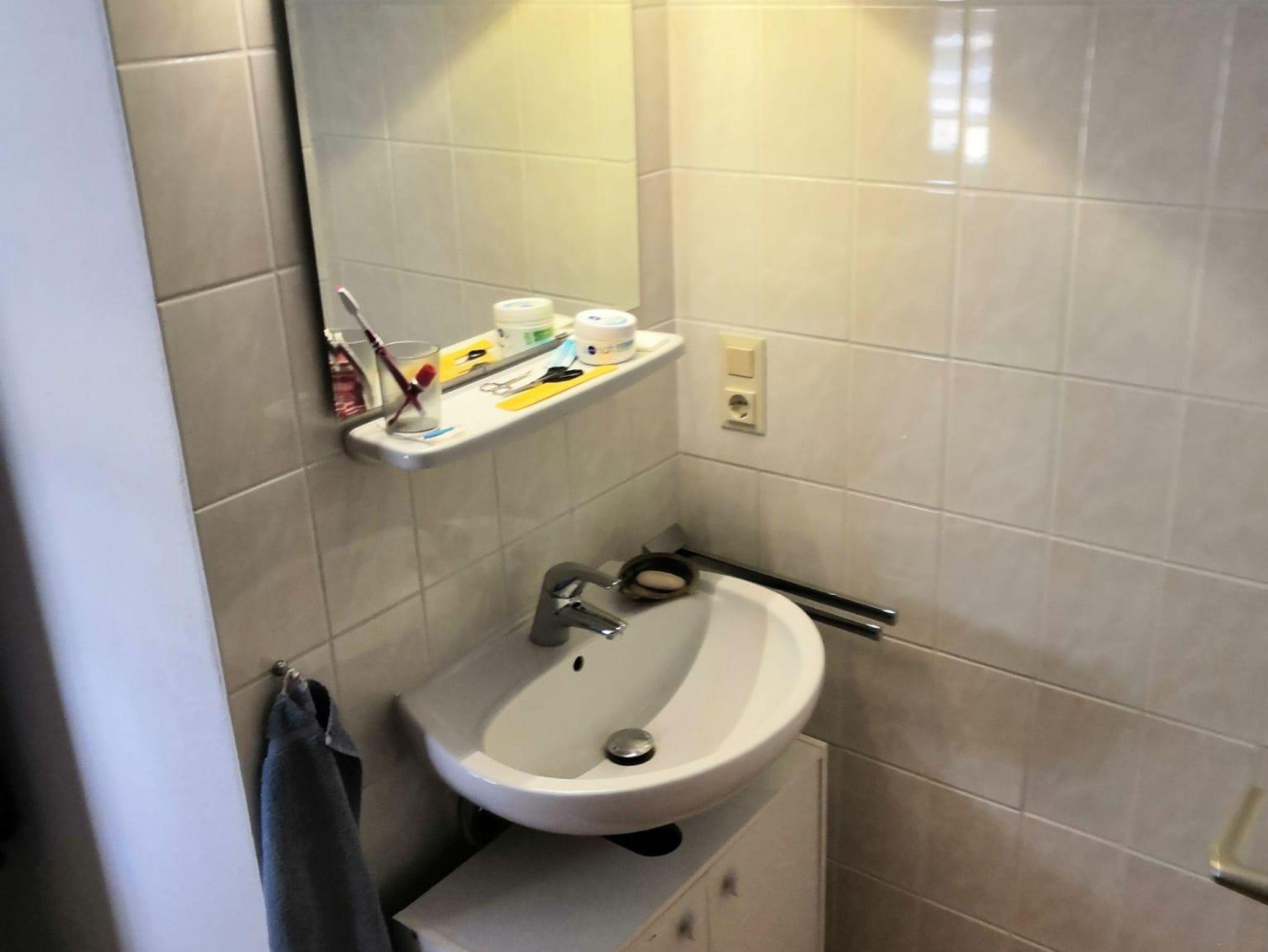 Der Eingang in das kleine Dusch-Bad/WC und das Waschbecken liegt in dem angrenzendem Schlafzimmer.