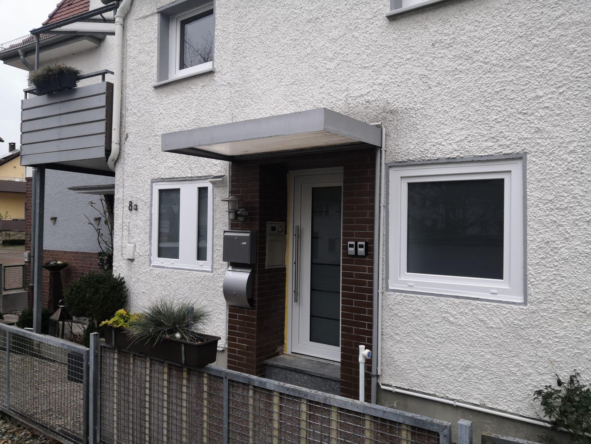 Neben dem Hauseingang liegende Terrasse mit einem Blick auf die ruhige Spielstrasse und die Sitzmöglichkeit im Innenhof laden zum Verweilen ein.