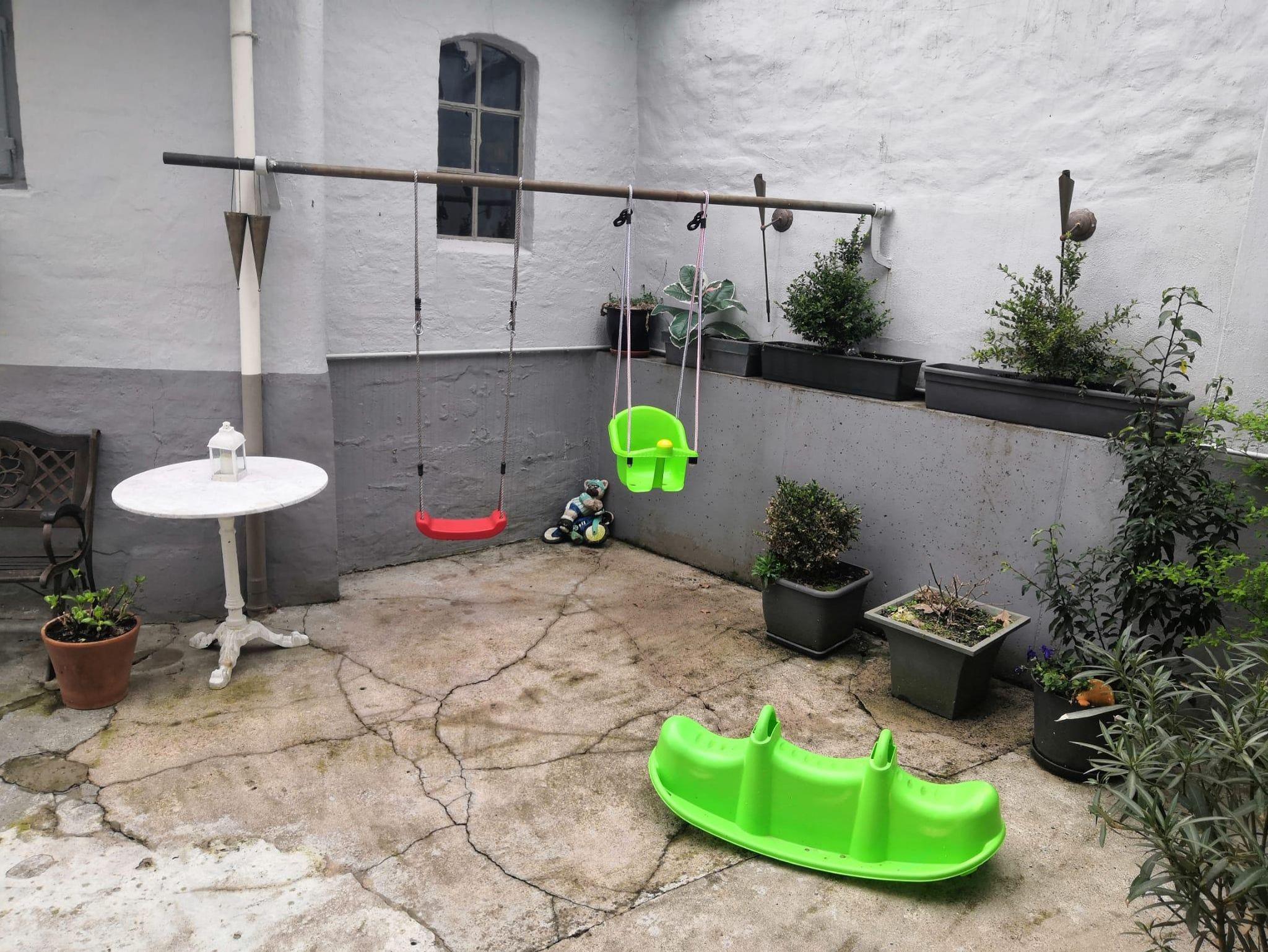 Ausstattung, Balkone in oberen Etagen, idyllischer Hof mit Grillmöglichkeiten und schöne Terrasse vor dem Haus sind sehr beliebt. Baby-Reisebett mit Bettwäsche und ein