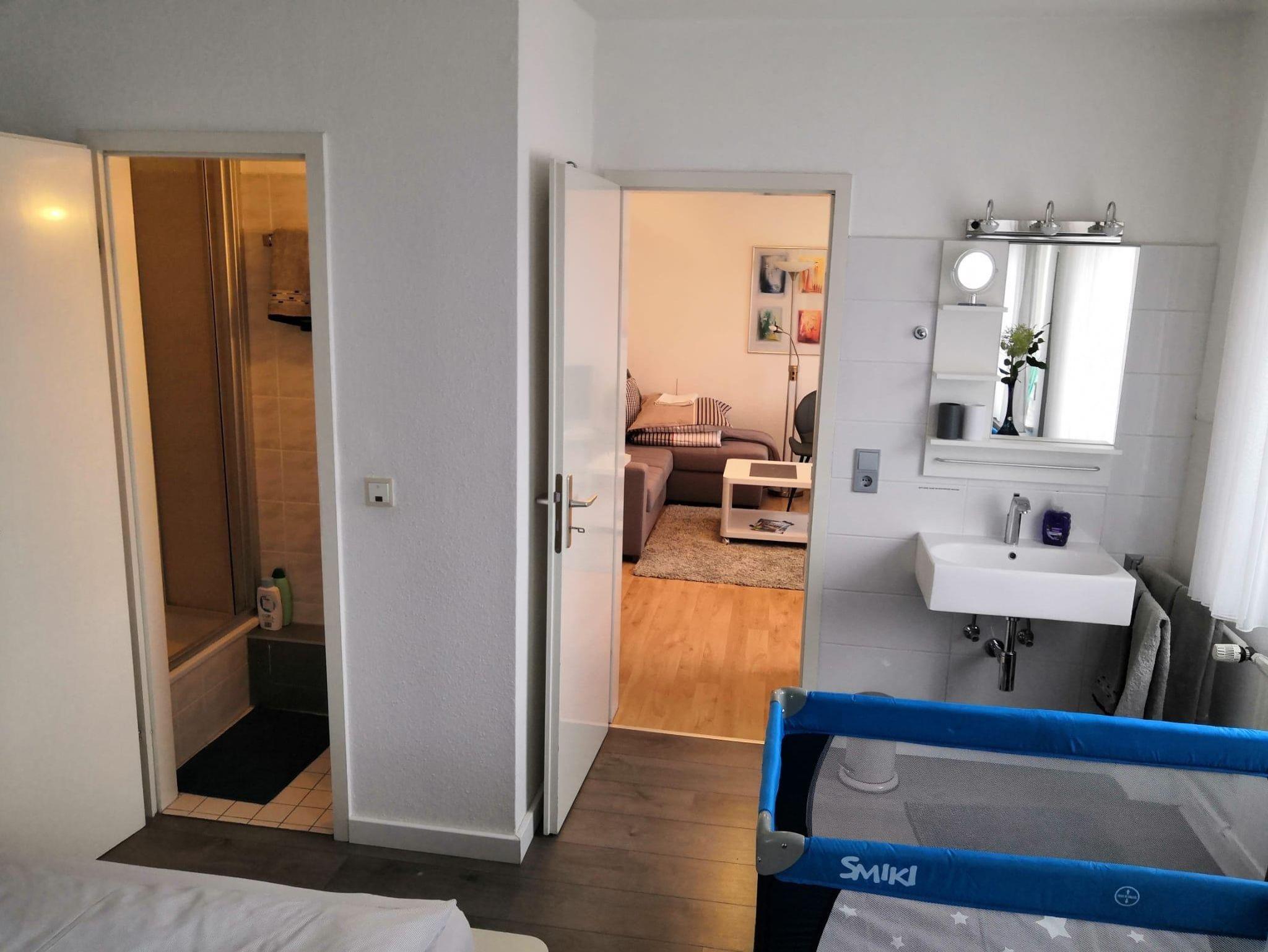 Betten für 3 Personen: ein Doppelbett im Schlafzimmer und ein Schlafsofa (140x200) im Wohnzimmer. Beim Bedarf kann auf Nachfrage 1 Babyreisebett mit Decke, Kissen und Bettwäsche (0-3 Jahre) mit einmaligem Aufpreis von 15€ zur Verfügung gestellt werden.