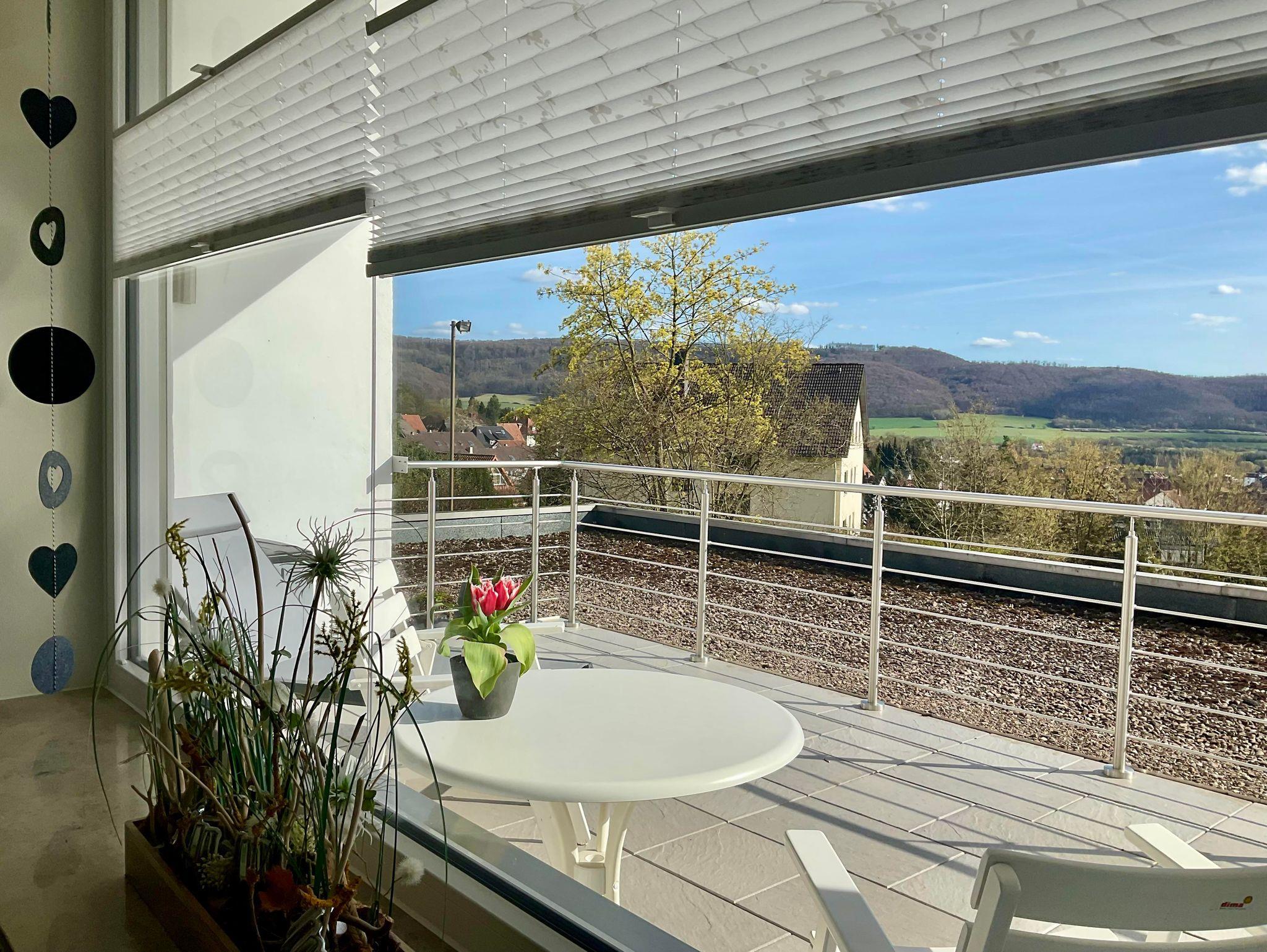 Ferienwohnung Aussichtsreich: Entspannung Pur! Das stilvolle, helle und moderne Appartement, 43qm, befindet sich in erster Etage,mit großer Terasse/Balkon, direkt am Dunsthöhlenpark.