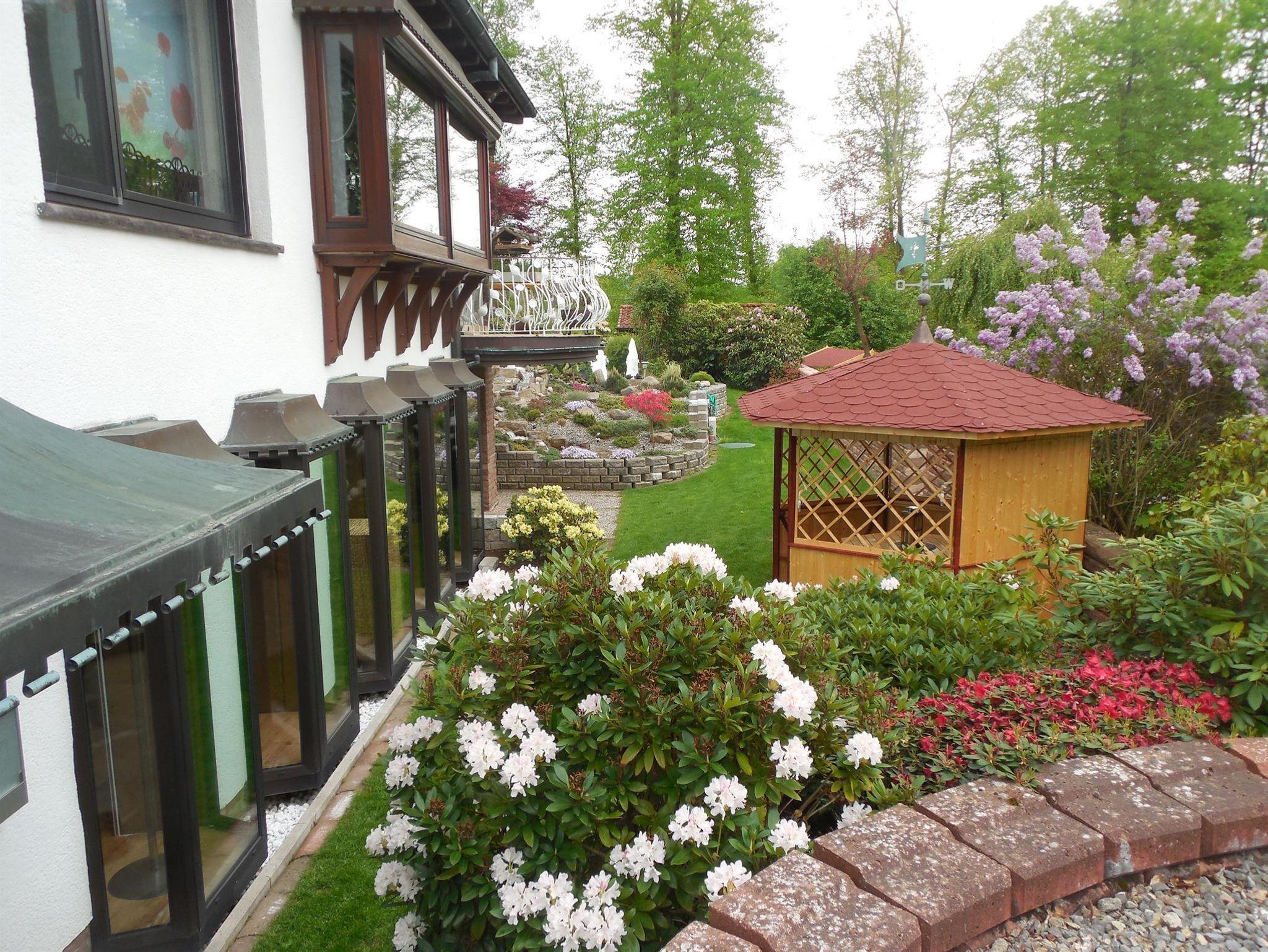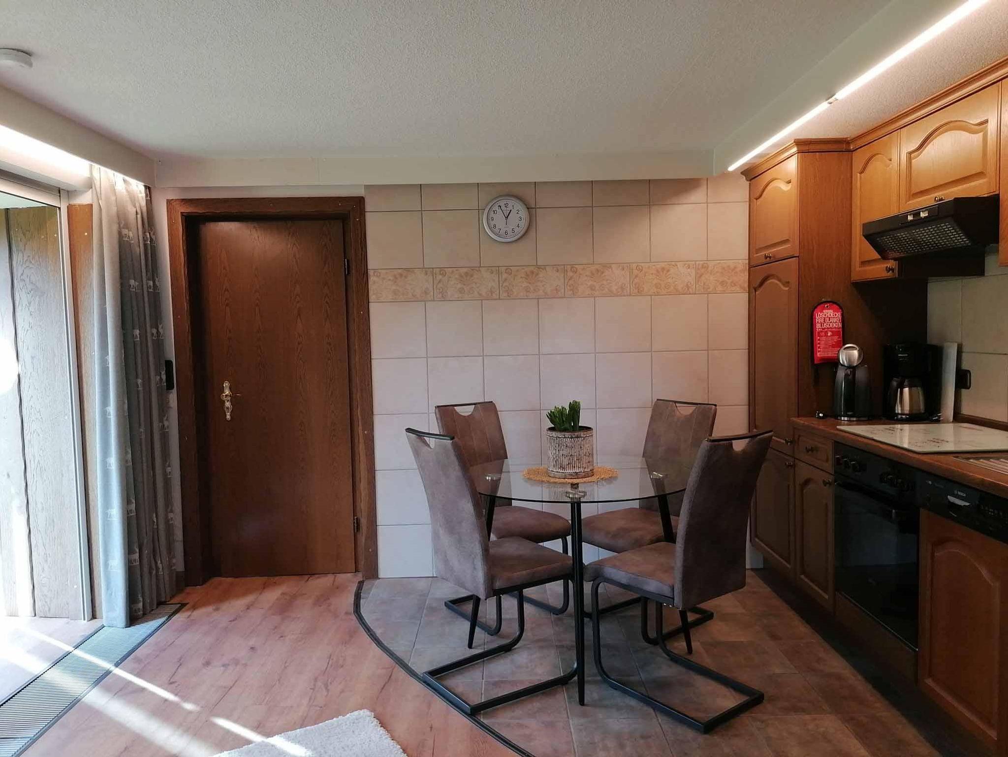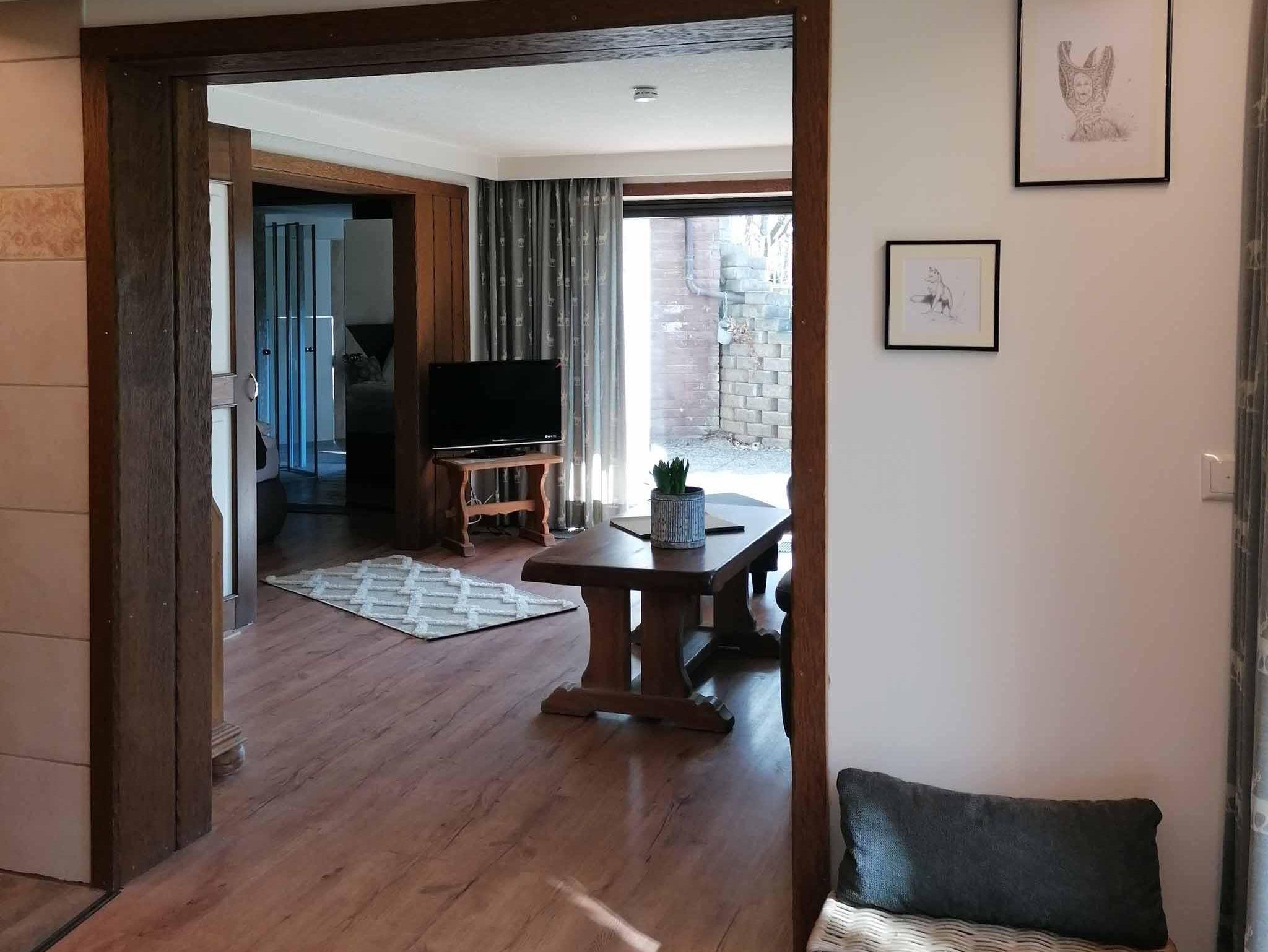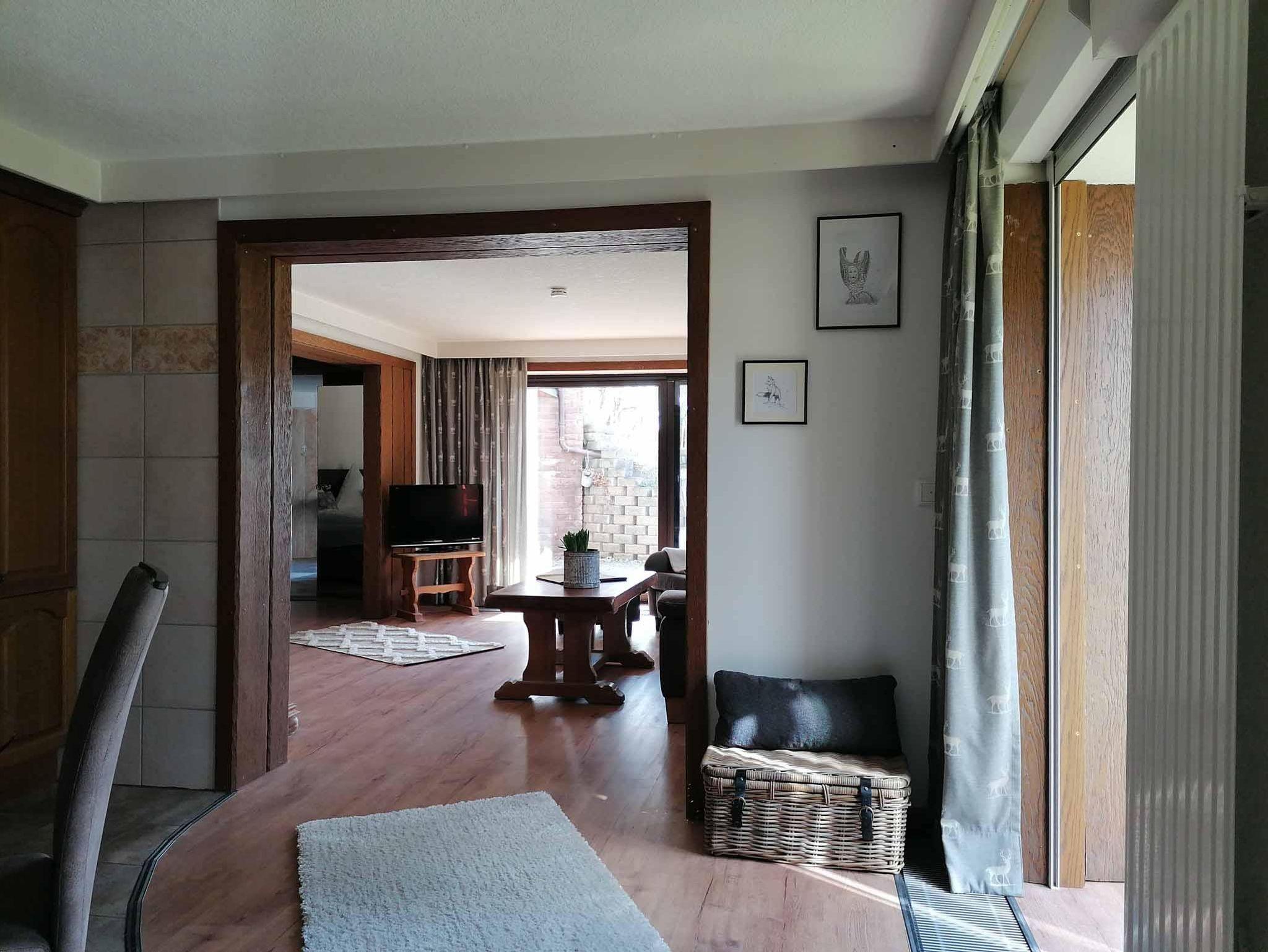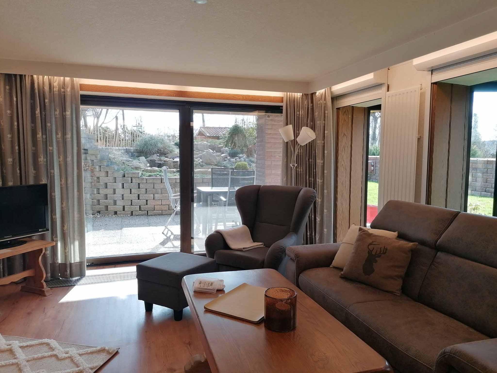 die ca. 60 qm große Ferienwohnung im Erdgeschoss ist im Landhausstil eingerichtet. Sie liegt auf Gartenhöhe und ist vom zugehörigen Stellplatz über eine breite Treppe direkt zu erreichen. Hinter dem Eingang befindet sich ein kleiner Windfang, von dem man zur Ferienwohnung sowie zum zusätzlich buchbaren Schlafzimmer inkl. Dusch-WC für eine weitere Person gelangt. Im Eingangsbereich der Ferienwohnung liegt die gut ausgestattete Küche mit einem Esstischbereich für 2-3 Personen. Der Raum geht offen in das Wohnzimmer mit bequemer Couch und einem komfortablen Fernsehsessel zum Lesen und Relaxen über. Direkt an das Wohnzimmer schließt sich der Schlafraum mit einem hochwertigen Boxspringbett (Größe:180x200cm und Höhe 60cm) an. Die beiden Räume lassen sich durch eine Schiebetür trennen. Das am Schlafzimmer anliegende Bad ist mit bodengleicher großer Dusche und 2 Waschbecken ausgestattet. Ein WC mit Handwaschbecken ist separat neben dem Bad. Vom Wohnzimmer aus kommt man auf eine überdachte, ca 20qm große Terrasse, gelegen an einem Bachlauf, der am Abend dezent beleuchtet wird. Auf der Terrasse haben Sie Sitzmöglichkeiten, einen Tisch und Gartenliegen zum Aufenthalt im Freien. Zur Wohnung gehört auch ein separater Gartenanteil Süd-Westausrichtung mit einem Pavillon und einer Liegewiese für sonnige Momente.