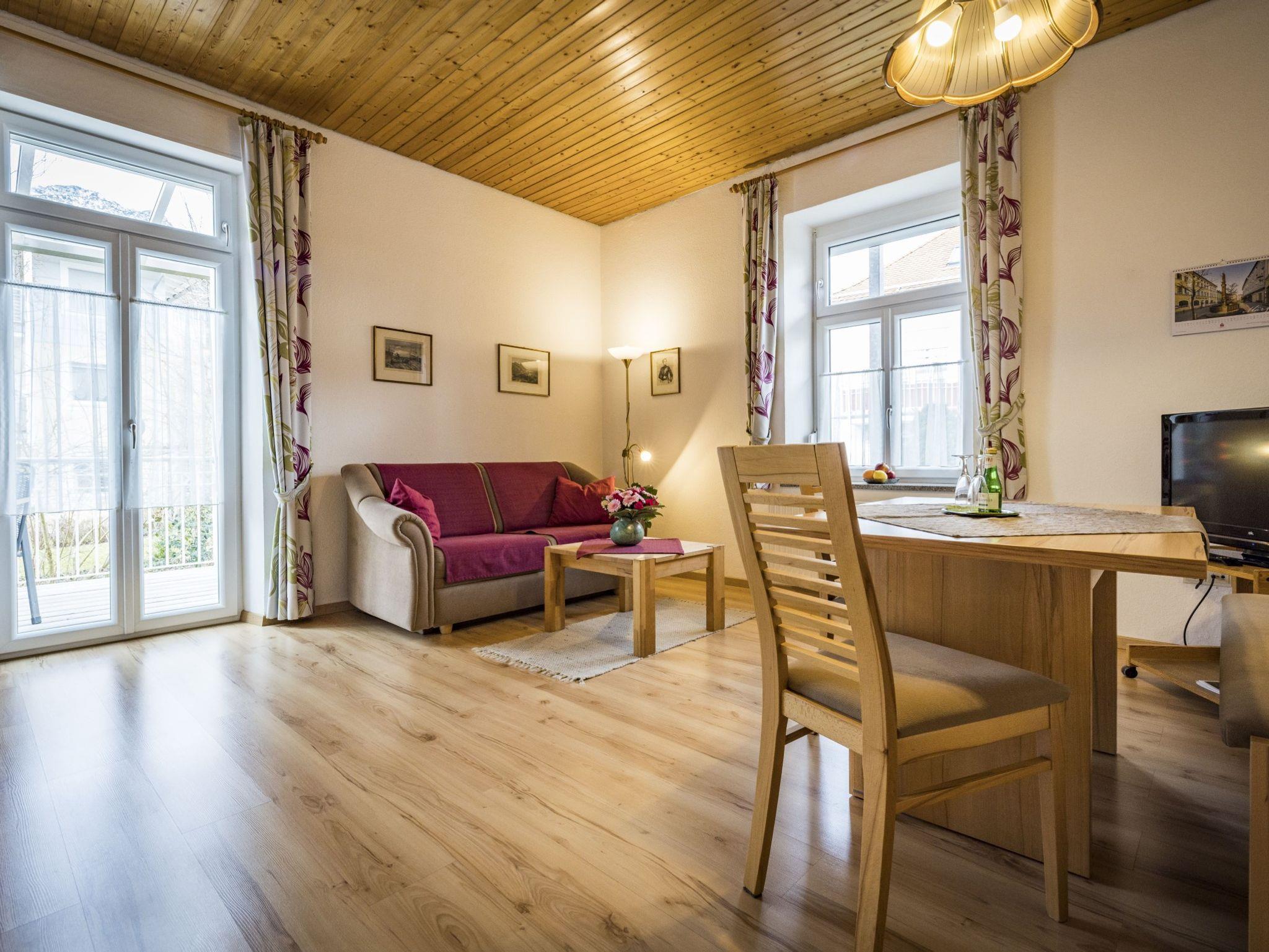 Zwei-Zimmer-Nichtraucher-Wohnung für 1 - 2 Personen mit großem, glasüberdachtem Balkon. Die Wohnung mit 47qm verfügt über ein Wohnzimmer mit Essplatz (Tisch mit Bank und 2 Stühlen), eine Couch mit Couchtisch (ausziehbar als Schlafplatz falls 2 Personen getrennt schlafen wollen), großem Einbauschrank, Balkon, TV, Radio, W-Lan, eine abgeschlossene Küche mit Spülmaschine, Backofen, 4-Platten-Ceran-Kochfeld, Kühlschrank mit Gefrierfach, Kaffeemaschine, Wasserkocher und Toaster. Das Schlafzimmer ist mit einem Doppelbett (Lattenroste höhenverstellbar) ausgestattet. Das Badezimmer hat Dusche/WC, Fön und Fenster, die Garderobe finden Sie im Flur. Lage: Hochparterre (5 Stufen). Das Rauchen am Balkon ist erlaubt. Wir bieten Ihnen kostenlosen wöchentlichen Hand-, Dusch- und Küchentücherwechsel.