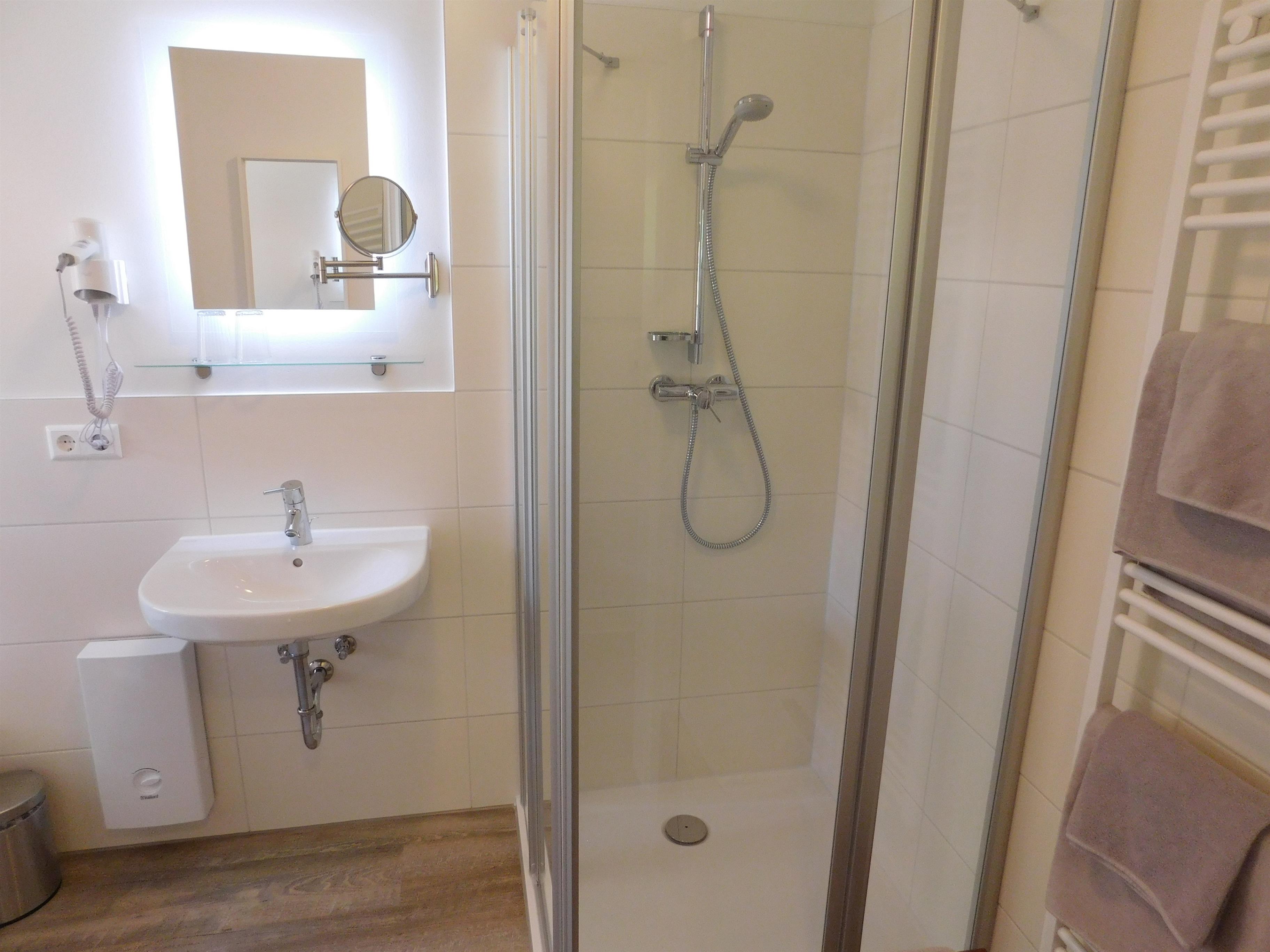 Das Bad ist mit einer ebenerdigen Dusche ausgestattet. Über eine bequeme kleine Treppe kommen Sie in das gemütliche Schlafzimmer im Dachgeschoss.