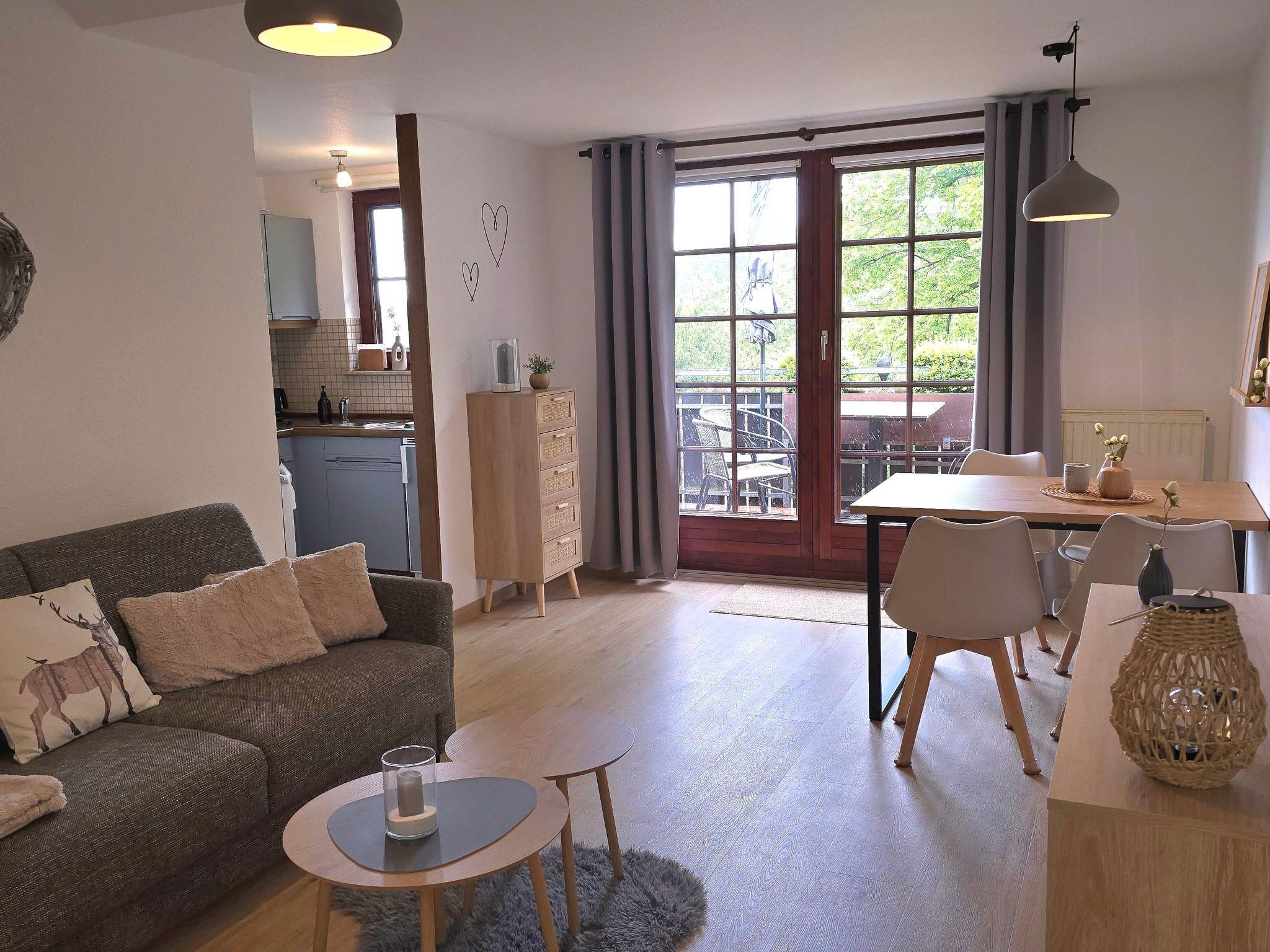Inside, the flat will spoil you with its attractive furnishings. The living area is inviting with a large, comfortable sofa bed, which can be used both for relaxing and as additional sleeping accommodation. In the separate bedroom, a comfortable double bed (1.80 m) ensures a restful night's sleep. The well-equipped, compact kitchen has everything you need to prepare your meals, including the option of having breakfast on the balcony with a wonderful view of the greenery. The bathroom is equipped with a shower and offers storage space for personal belongings.