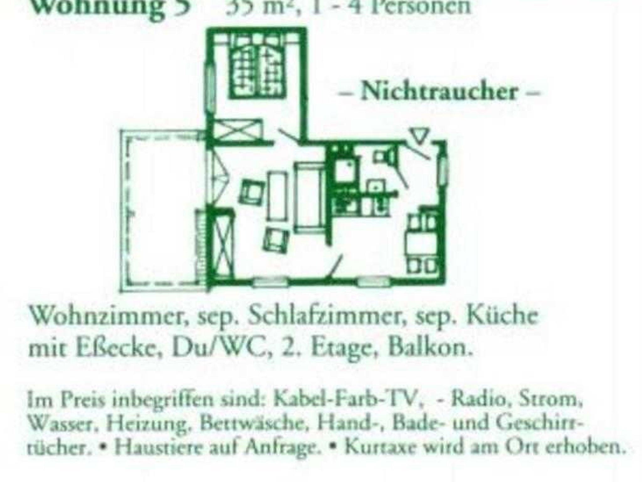 Die Wohnung liegt in der 2. Etage( Dachgeschoss) und besteht aus Wohnraum, Schlafraum, Küche und Du/WC. Sie ist ausgestattet mit Couchgarnitur (ausziehbar), Radio und Kabel-TV. Die Küche ist ausgestattet mit einem Eßtisch mit 4 Stühlen, Mikrowelle, 2 Kochplatten, Toaster, Kaffeemaschine, Geschirr und Besteck für mindestens 6 Personen.