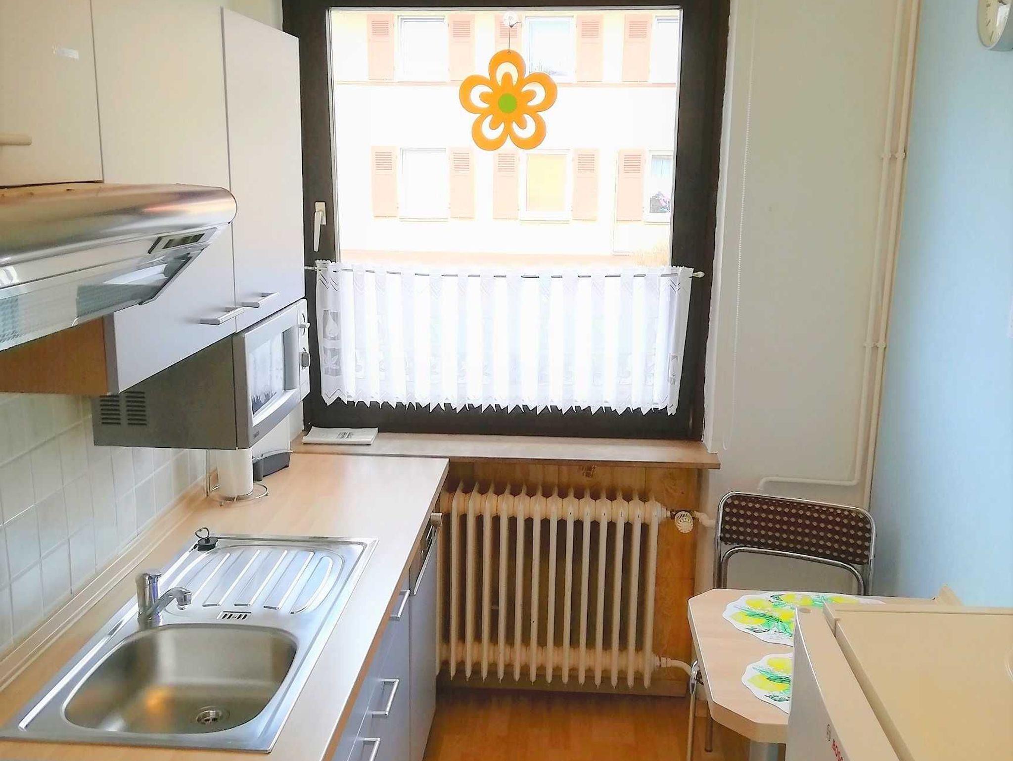 2-Raum Ferienwohnung im 1. OG, Schlafzimmer mit Doppel- und Einzelbett, Wohnzimmer, Einbauküche, Dusche/WC
