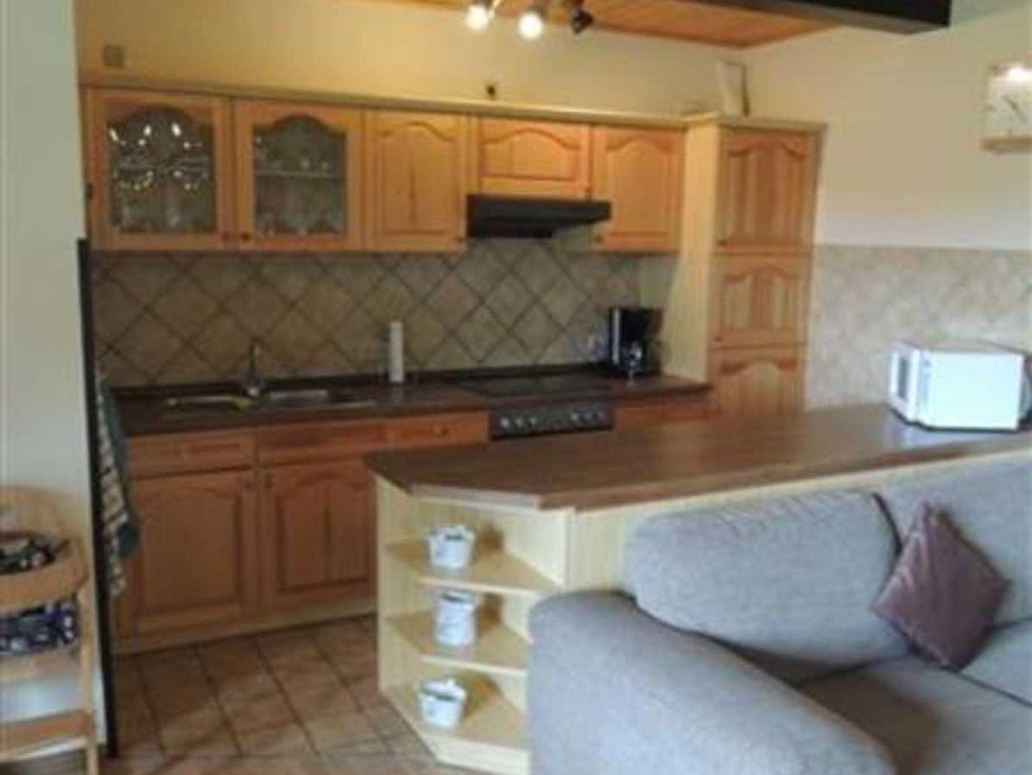 Die Küche ist durch einen Tresen abgetrennt und mit Elektroherd/Backofen, Toaster, Kühlschrank mit Gefrierfach, Kaffeemaschine und Geschirr ausgestattet.
