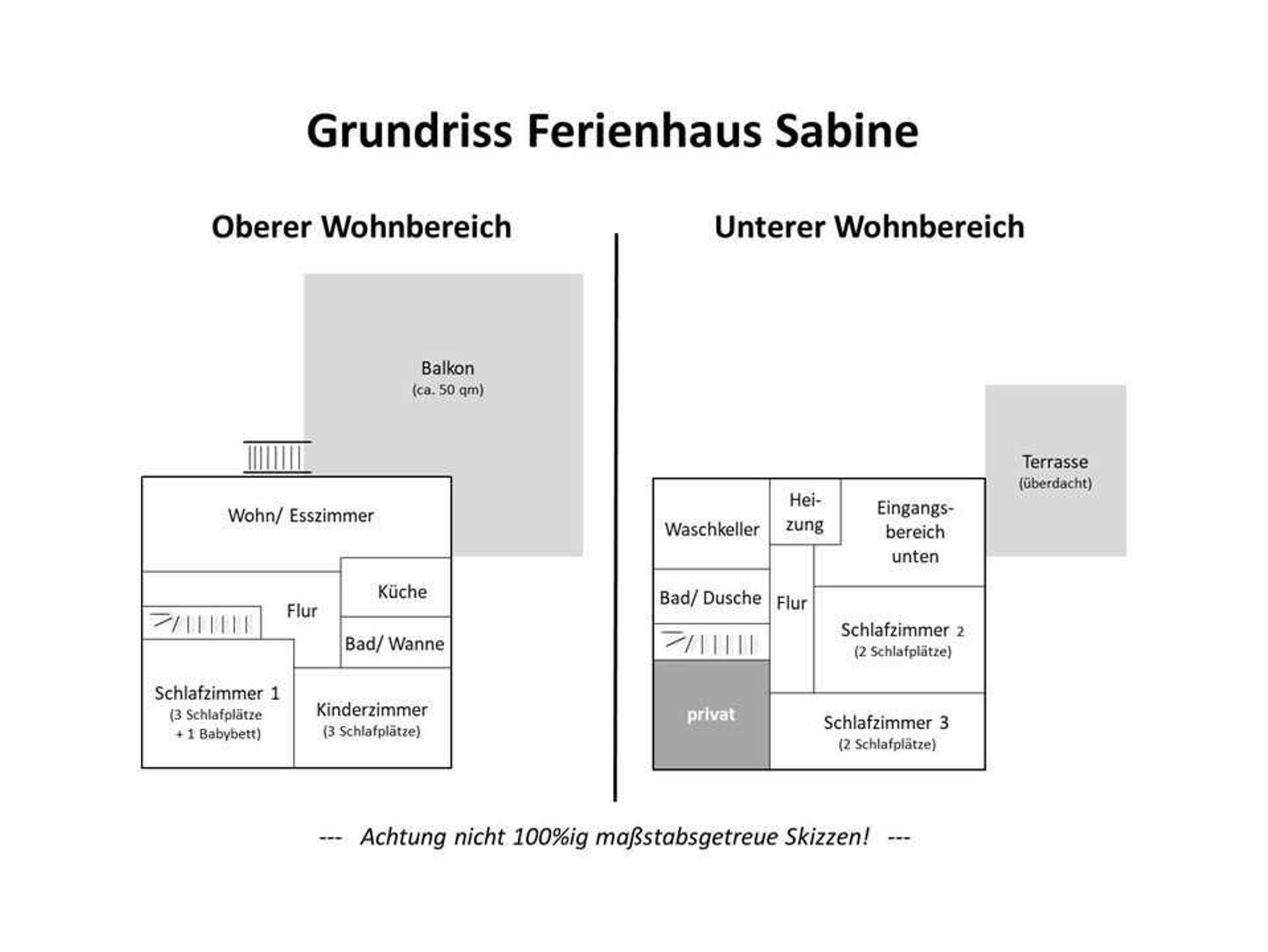 Das Ferienhaus Sabine ist ein großzügiges, voll ausgestattetes Ferienhaus (ca. 140 m²) mit 4 Schlafzimmern, Wohnzimmer, Küche und 2 Badezimmern (Badewanne/WC sowie Dusche/WC). Das Haus liegt in leichter Hanglage und ist über jeweils einen Eingang je Etage erreichbar.
