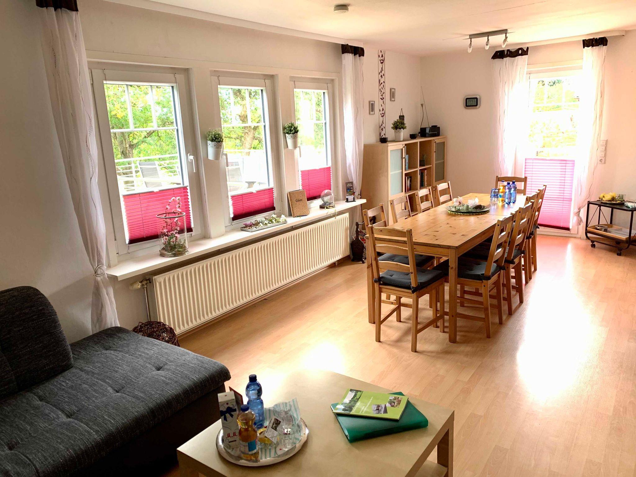 Der schöne großzügige Essbereich ist für 10 Personen eingerichtet und bietet zusätzlich zwei Kinderhochstühle. Vom Essbereich führt der Weg direkt auf den großen Balkon ( > 50 m²) und in den Garten.