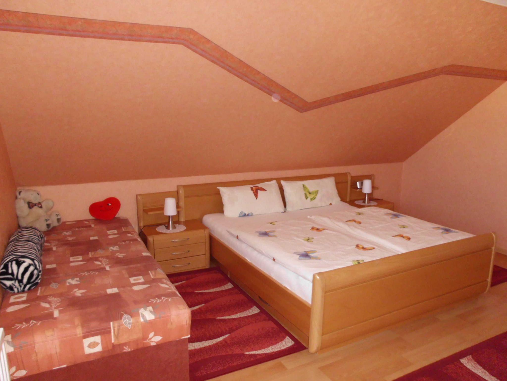 Unsere Ferienwohnung befindet sich in der 2. Etage, ist komplett eingerichtet und hat ein großes Wohnzimmer mit Essbereich. Außerdem gibt es eine große Loggia, zwei Schlafzimmer, davon eines mit Doppelbett und einem Zustellbett. Das zweite Schlafzimmer ist ein Jugendzimmer mit einem Einzelbett. Die Küche ist komplett ausgestattet, mit E-Herd mit Ceranfeld und Backofen, Mikrowelle, Kühlschrank, Geschirrspüler und alles was zur Küche gehört.
