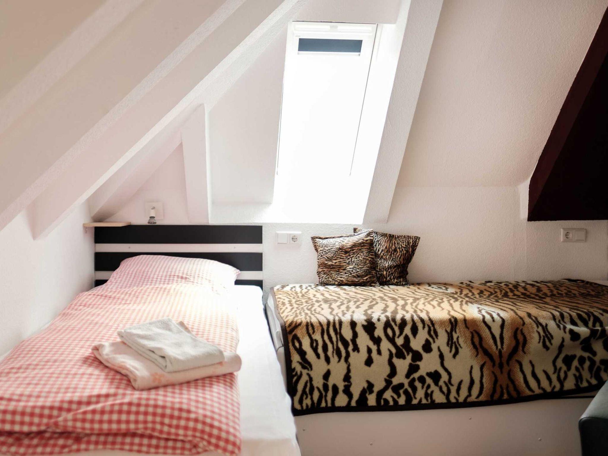 Die Ferienwohnung Balance( 95 qm) verfügt über einen Balkon, ist geeignet für bis zu 8 Personen und nimmt die gesamte zweite Etage eines alten Mehrfamilienhauses ein.