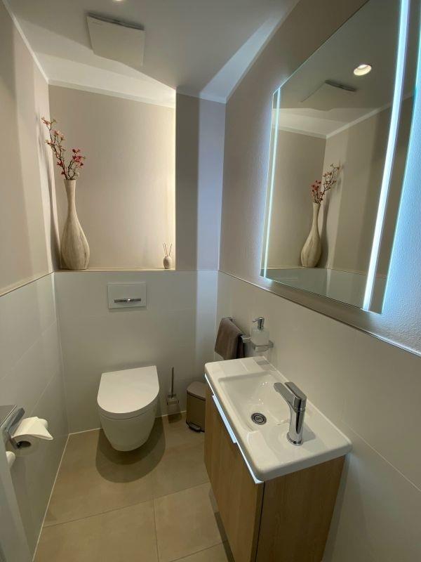 Sowohl das im Erdgeschoss befindliche Gäste-WC als auch das Badezimmer mit Dusche und WC im Obergeschoss sind modern und luxuriös ausgestattet. Entspannen Sie sich bei einer heißen Regen-Dusche nach einem langen Wandertag oder genießen Sie einfach die Ruhe des Hauses und seiner Umgebung.
