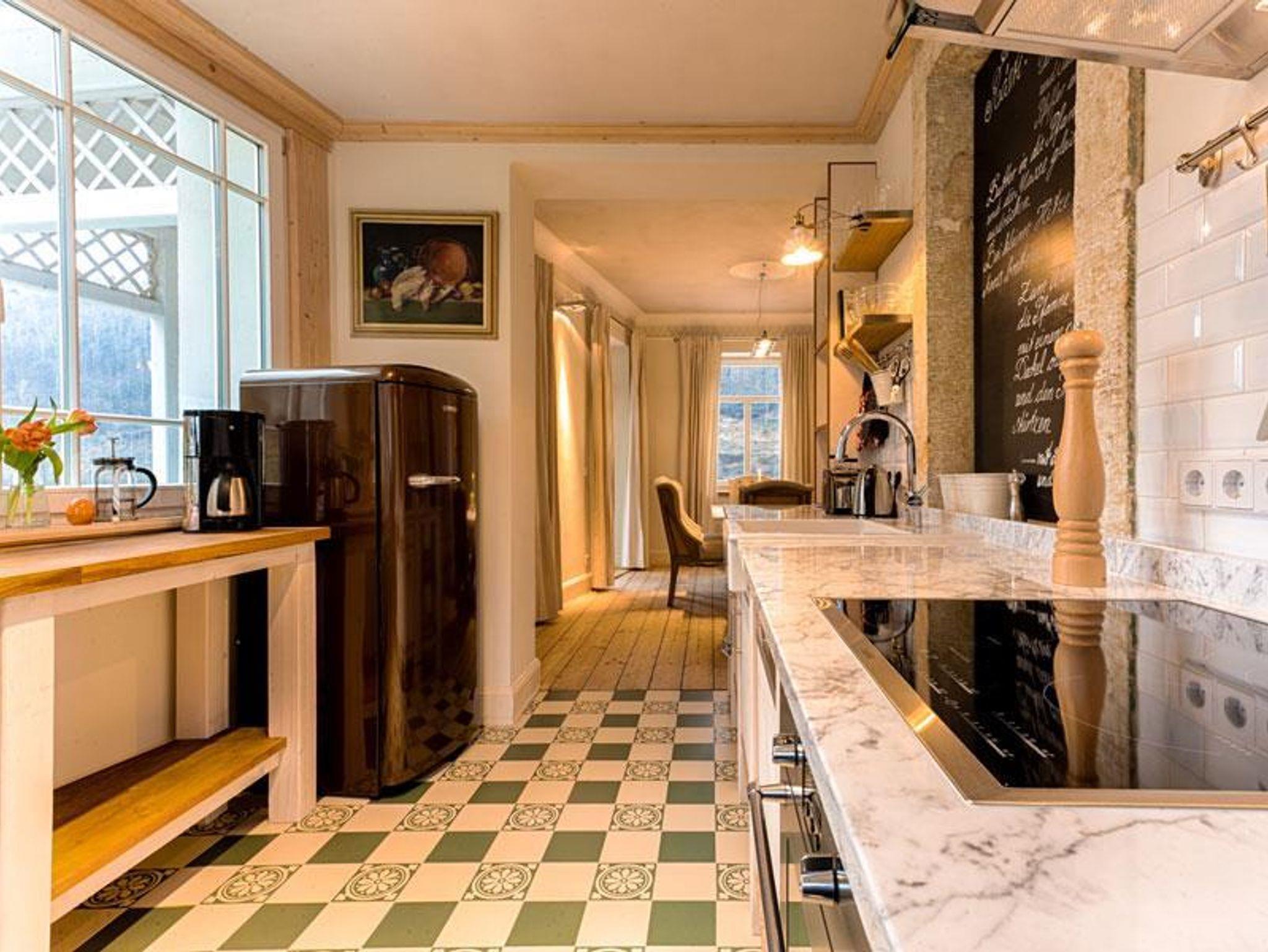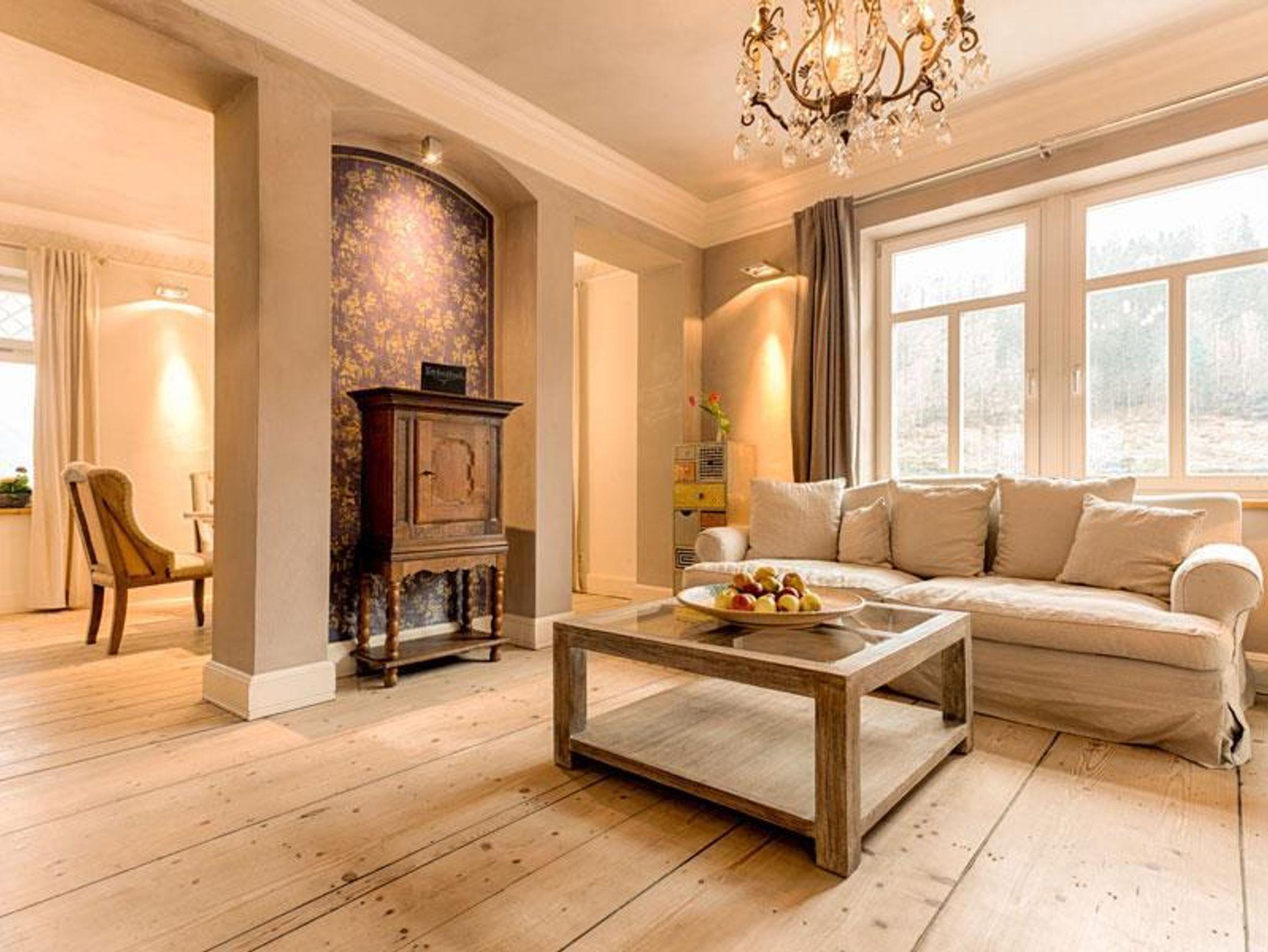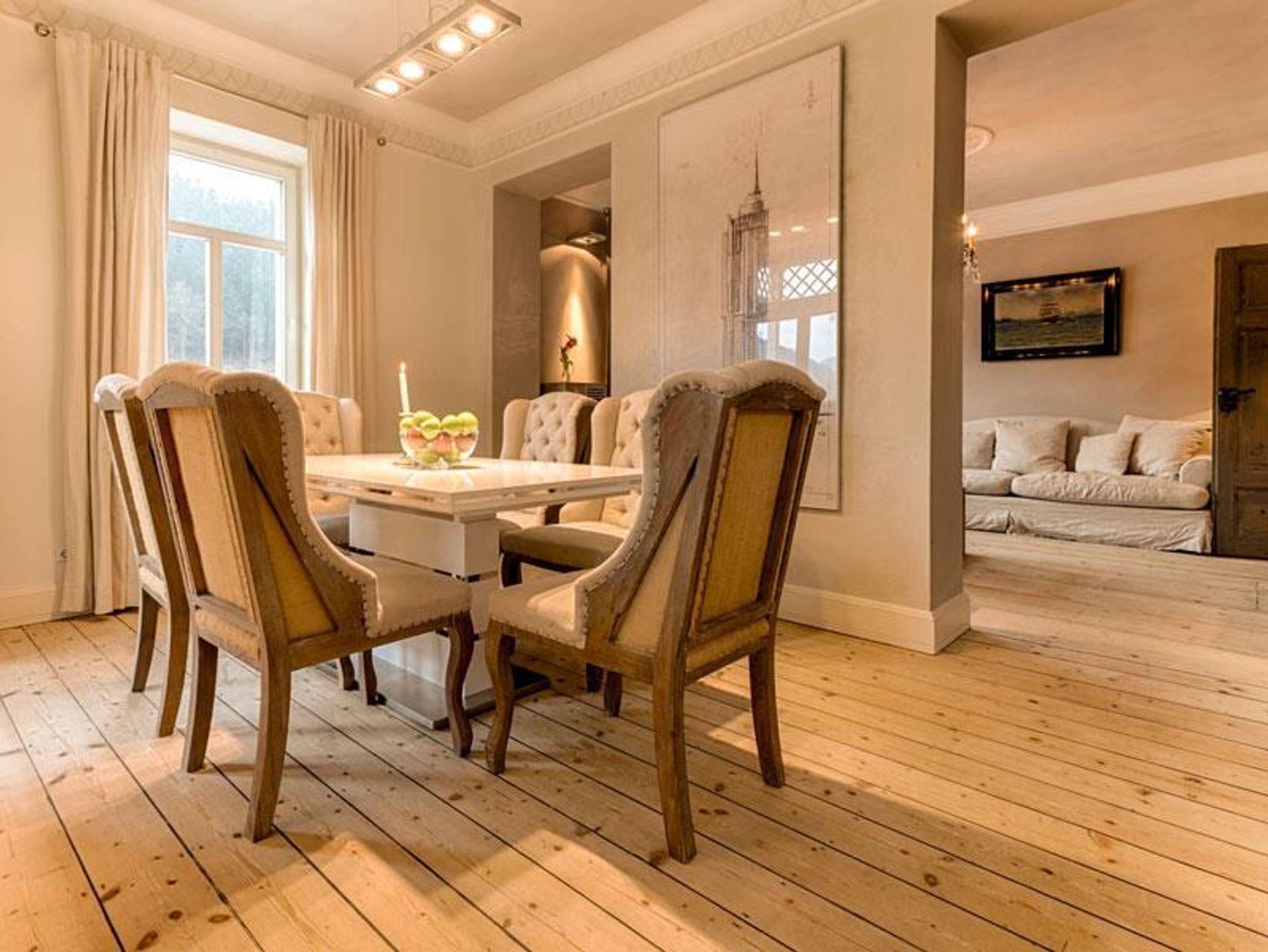 Stilvolle Möbel, erlesene Stoffe und individueller Wohnkomfort höchsten Ranges erwartet Sie auf 106 qm im Apartment Bel Etage. Der Wohnbereich bietet viel Platz zum gemütlichen Lesen, einen gemütliche Essbereich Platz für sechs Personen, ein großer Full HD LCD-TV ergänzt die exklusive Ausstattung. In der vollausgestatten Küchenzeile können Sie beim Kochen die Aussicht auf die Elbe genießen. Zusätzlich gibt es einen großen möblierten Balkon und einen behaglichen Wintergarten mit Blick zu den Schrammsteinen. Ferner verfügt das Apartment über zwei getrennte Schlafräume. Eines ist ausgestattet mit einem exklusivem Doppelbett mit Zugang zum Wintergarten, der zweite Raum bietet zwei Einzelbetten und eine Schlafcouch auf der eine weitere Person Platz zum Schlafen finden kann.