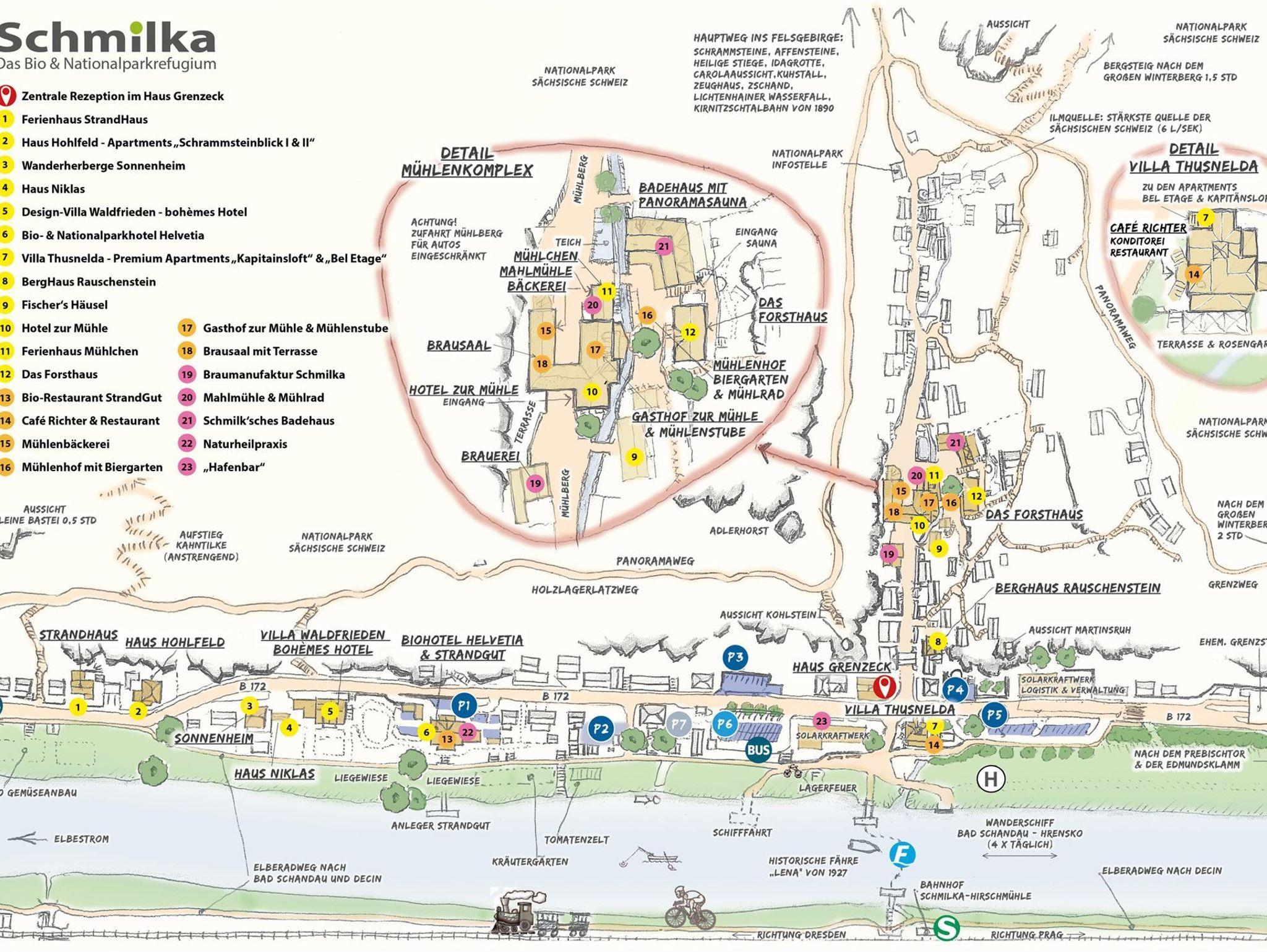 In der kalten Jahreszeit verwandelt sich Schmilka in einen Traum aus Eis und Schnee: das Winterdorf. Dann steigen Gäste in die beheizten Badezuber, lassen die Seele in der Panoramasauna baumeln oder genießen Glühwein am Kaminfeuer im Mühlenhof. Das Bio- und Nationalpark Refugium Schmilka ist bio-zertifiziert (DE-ÖKO 006). Sie erreichen Schmilka bequem mit der S-Bahn S1 aus Richtung Dresden, Haltepunkt Schmilka-Hirschmühle. Mit der historischen Fähre „Lena“ von 1924 übersetzen und schon kann der Urlaub beginnen.