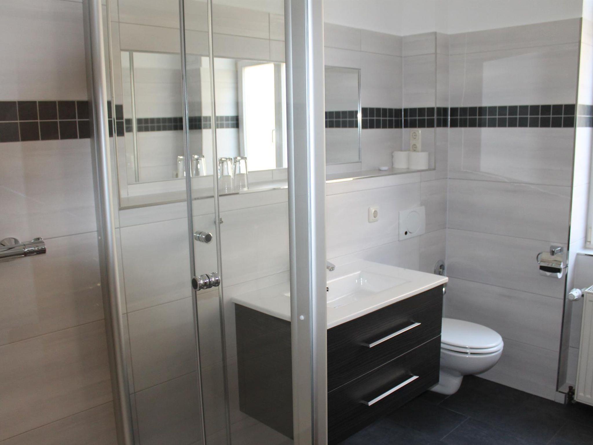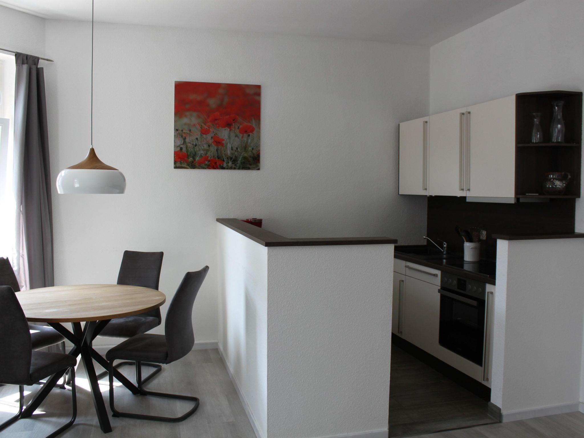 Apartment mit einem Schlafzimmer für 2 Personen, Wohn-Esszimmer mit moderner Einbauküche (Cerankochfeld, Backofen, Spülmaschine, Mikrowelle, Kaffeemaschine, Wasserkocher, Toaster, Kühlschrank), Esstisch, Couch, Sessel, Bad mit DU/WC