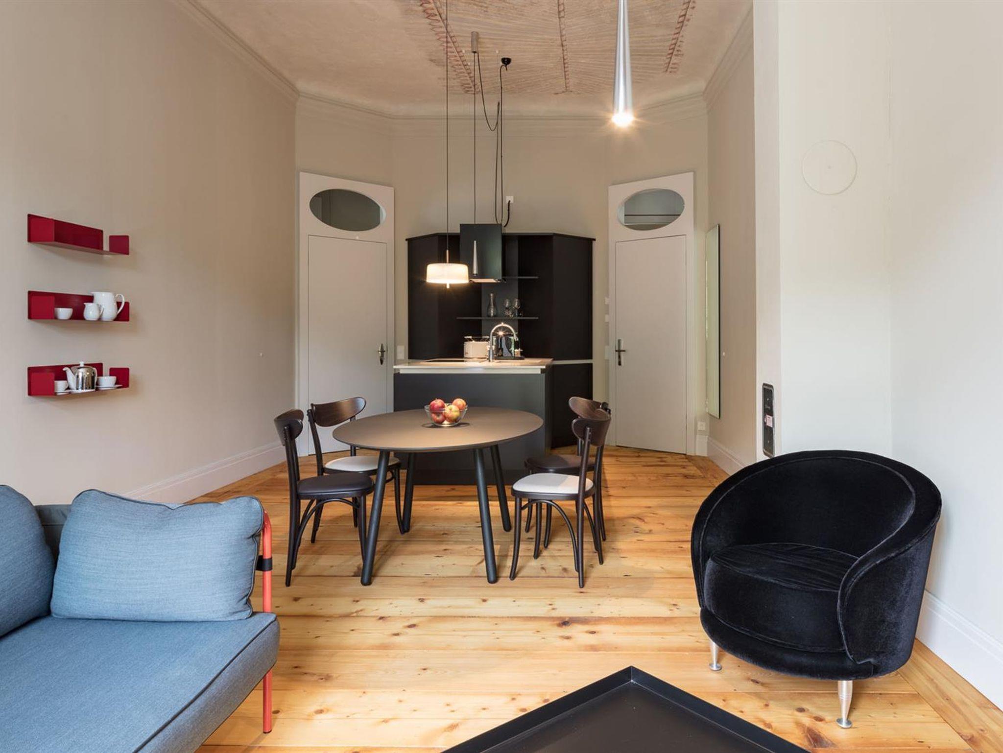Das Appartement steht im engen Dialog mit den benachbarten bewaldeten Hängen, die in Richtung Lilienstein emporsteigen. Hier lässt es sich gemütlich und großzügig zu viert wohnen und entspannen. Unter historischem Deckenschmuck lädt der zentrale Salon zum gemeinsamen Kochen, Essen und Relaxen ein. Auf dem Balkon tauchen Sie ins Grün der Umgebung ein. Die zwei separaten Schlafzimmer mit je eigener Dusche und WC garantieren behagliche Privatheit und genüsslichen Schlaf.