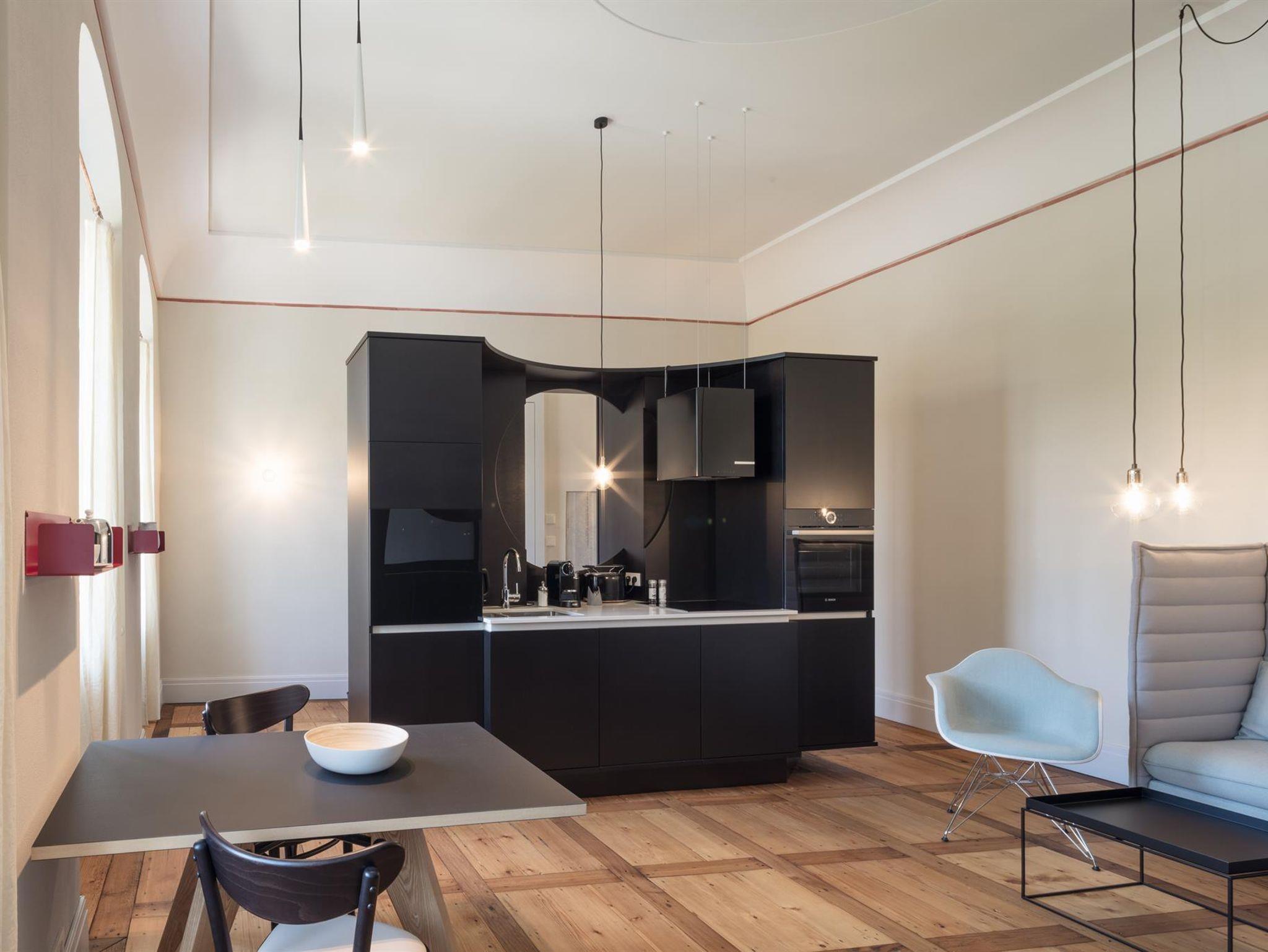 Einen der drei ehemaligen Salons im Obergeschoss nutzend, bietet dieses Appartement großzügigen Raum für ein zeitgemäßes Wohnerlebnis zu zweit. Durch die große Fensterfront öffnet sich der Blick gen Osten über den weitestgehend unbefahrenen Dorfplatz hinweg ins Tal hinein. Auf dem prominent gelegenen Balkon begrüßen Sie die Morgensonne und beobachten das gemächliche Dorfleben. Die frei im Raum stehende Kücheninsel und das Himmelbett sind maßgeschneidert. Beide Möbel gliedern das Appartement in Ess-, Wohn- und Schlafbereich, ohne die Räume komplett voneinander zu trennen. Reste erhaltener Wandmalerei und historischer Fußboden erinnern an die lange Geschichte dieses Raums.