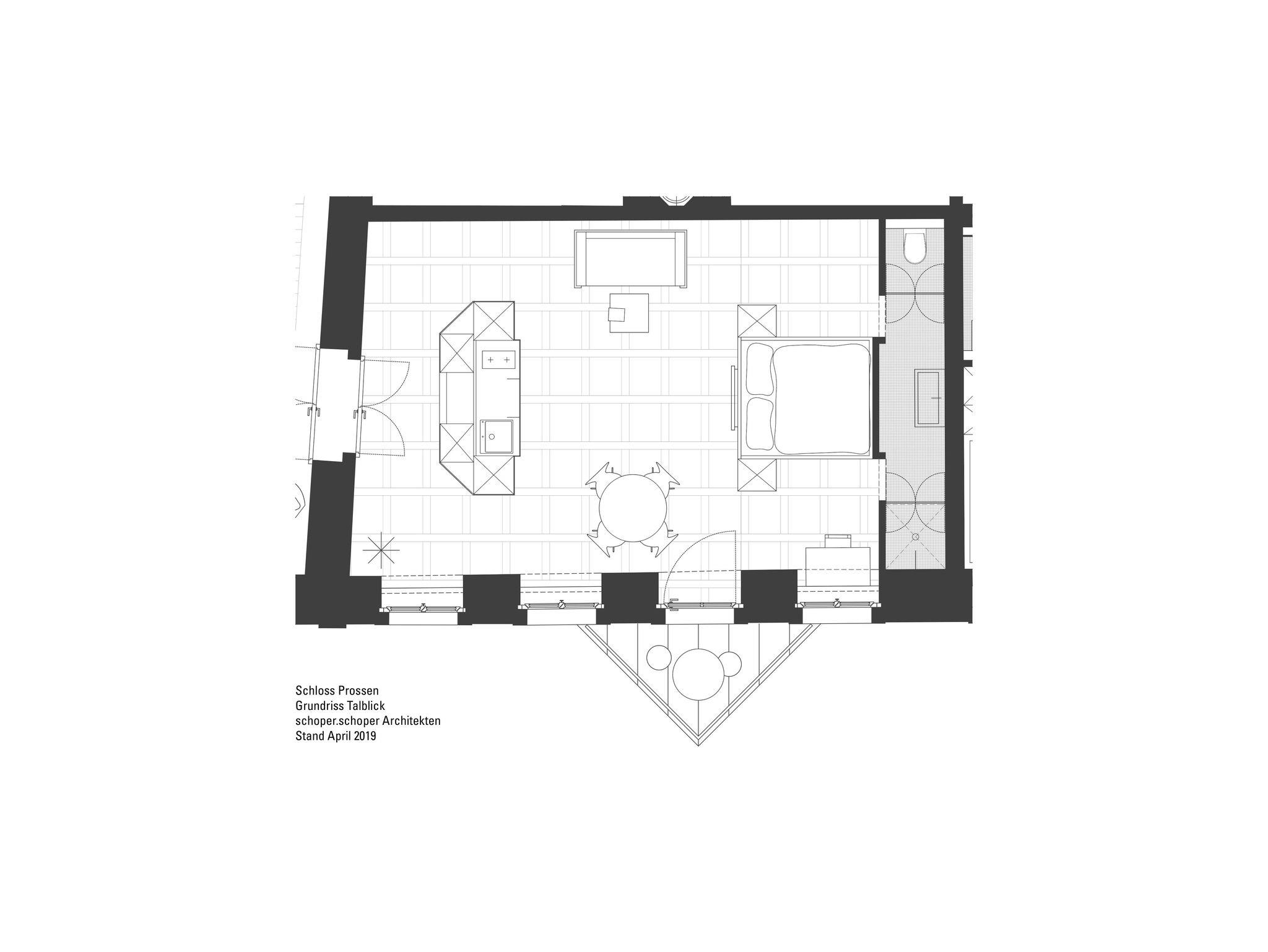Schloss Prossen, Apartment Talblick, offener Wohn- und Schlafraum
