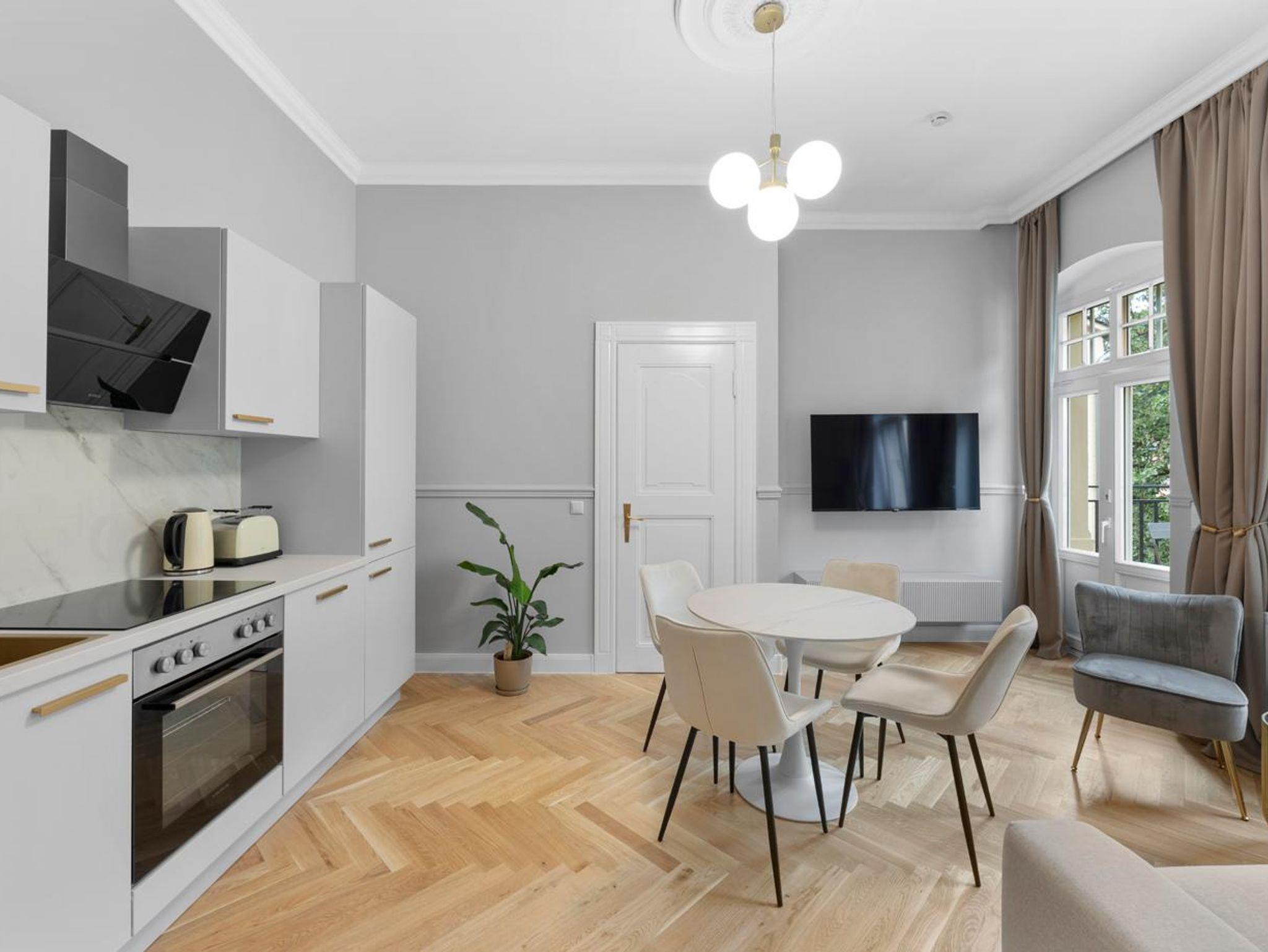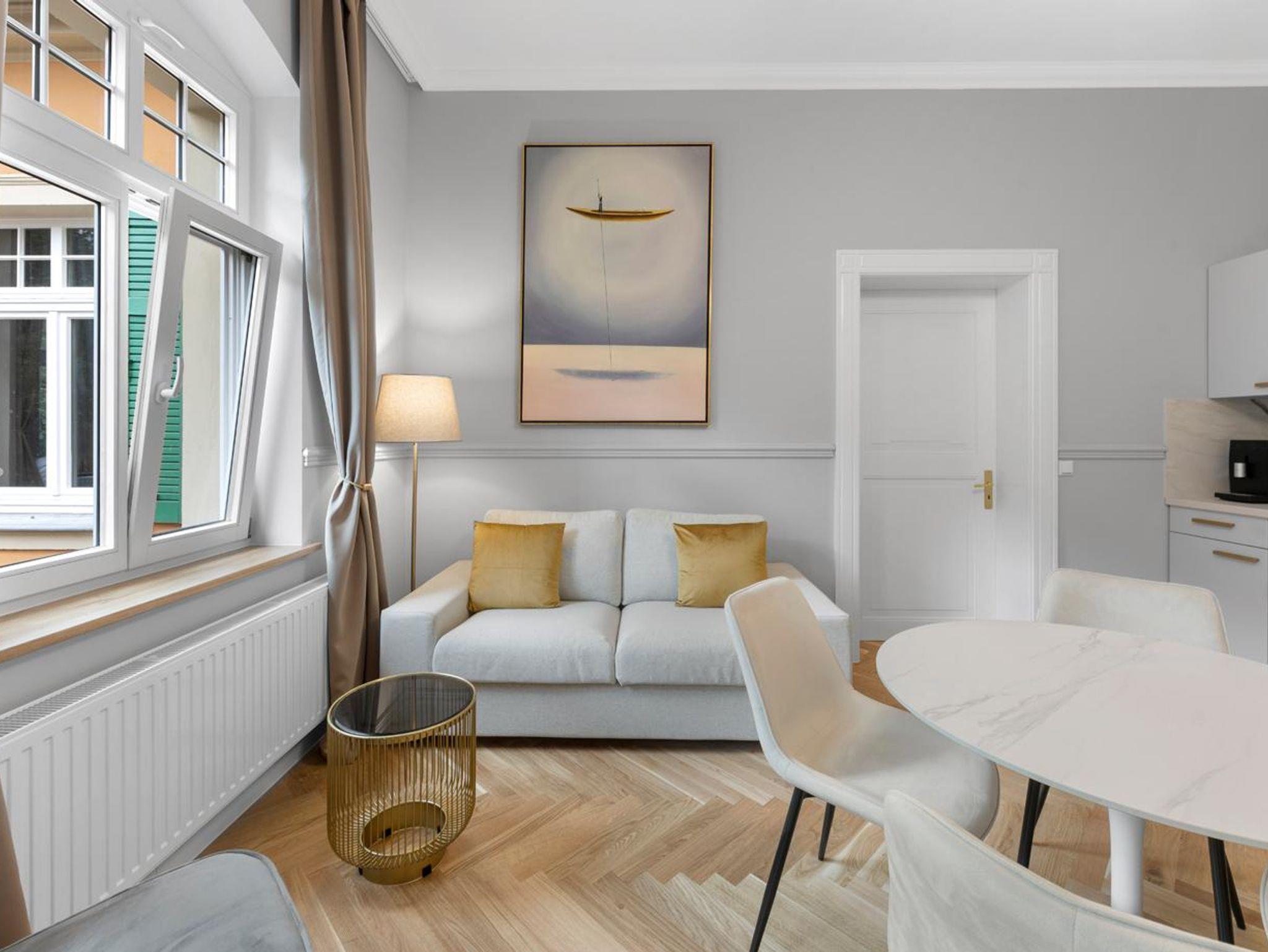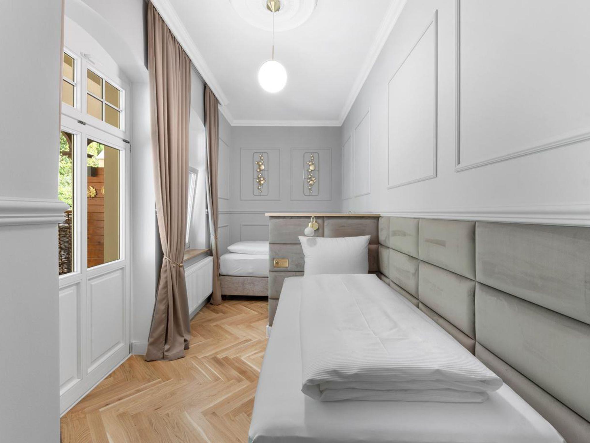 Genießen Sie hochwertige Boxspringbetten, luxuriöse Bettwäsche, elegantes Fischgrätenparkett und eine private Sauna. Entspannen Sie auf Ihrem Balkon. Historischer Charme trifft modernen Luxus - Ihr neues Zuhause fernab von Zuhause.
