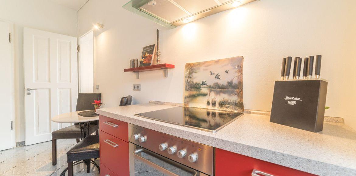 Kochnische mit Backofen, Geschirrspüler, Kühlschrank, Wasserkocher sowie Gas- oder Elektroherd