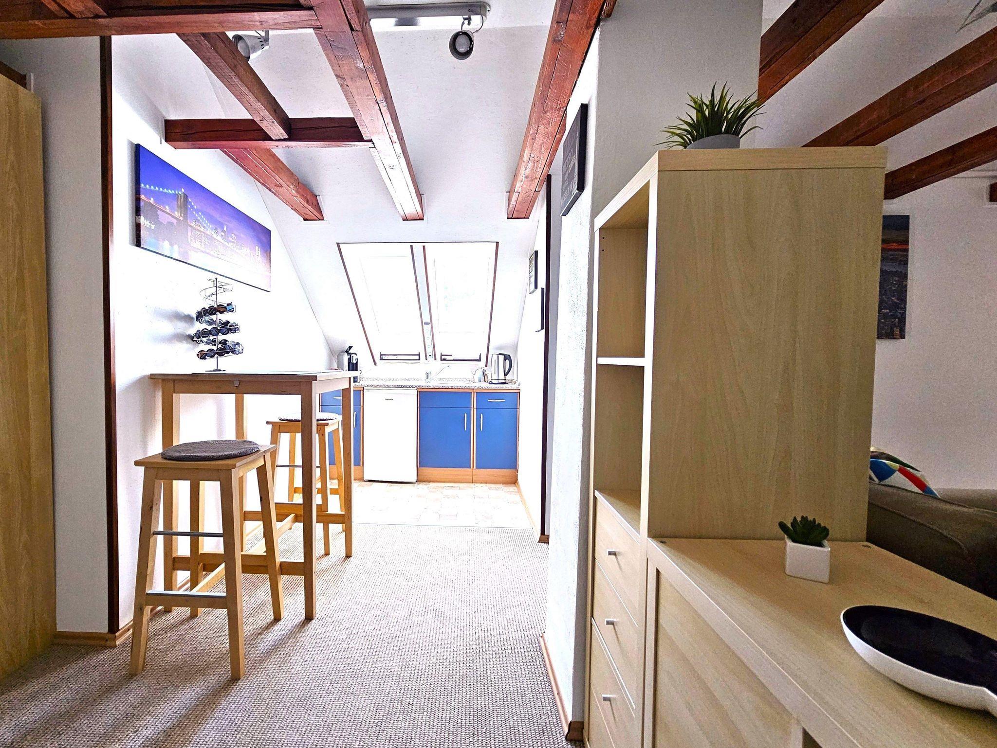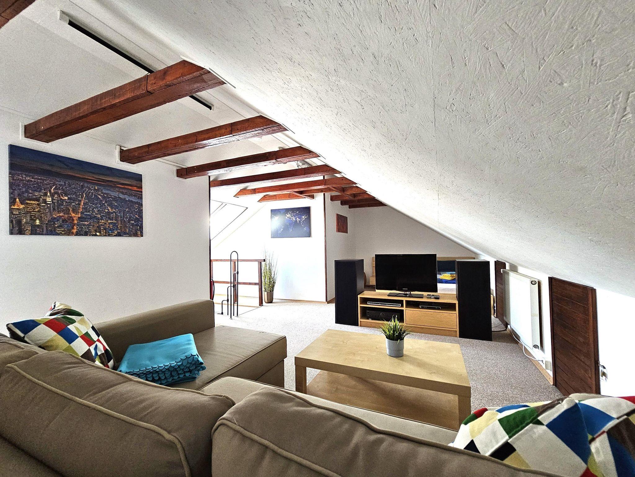 Bei einer Buchung mit mehr als 4 Personen bietet die Wohneinheit 2 mit insgesamt ca. 50 m² ein Bad mit Dusche und WC im OG. Im DG befinden sich ein offener Wohn-/Schlafbereich mit Queensize-Bett und Ausziehcouch, eine kleine Küchenzeile mit Essplatz und ein Arbeitsbereich mit Schreibtisch.