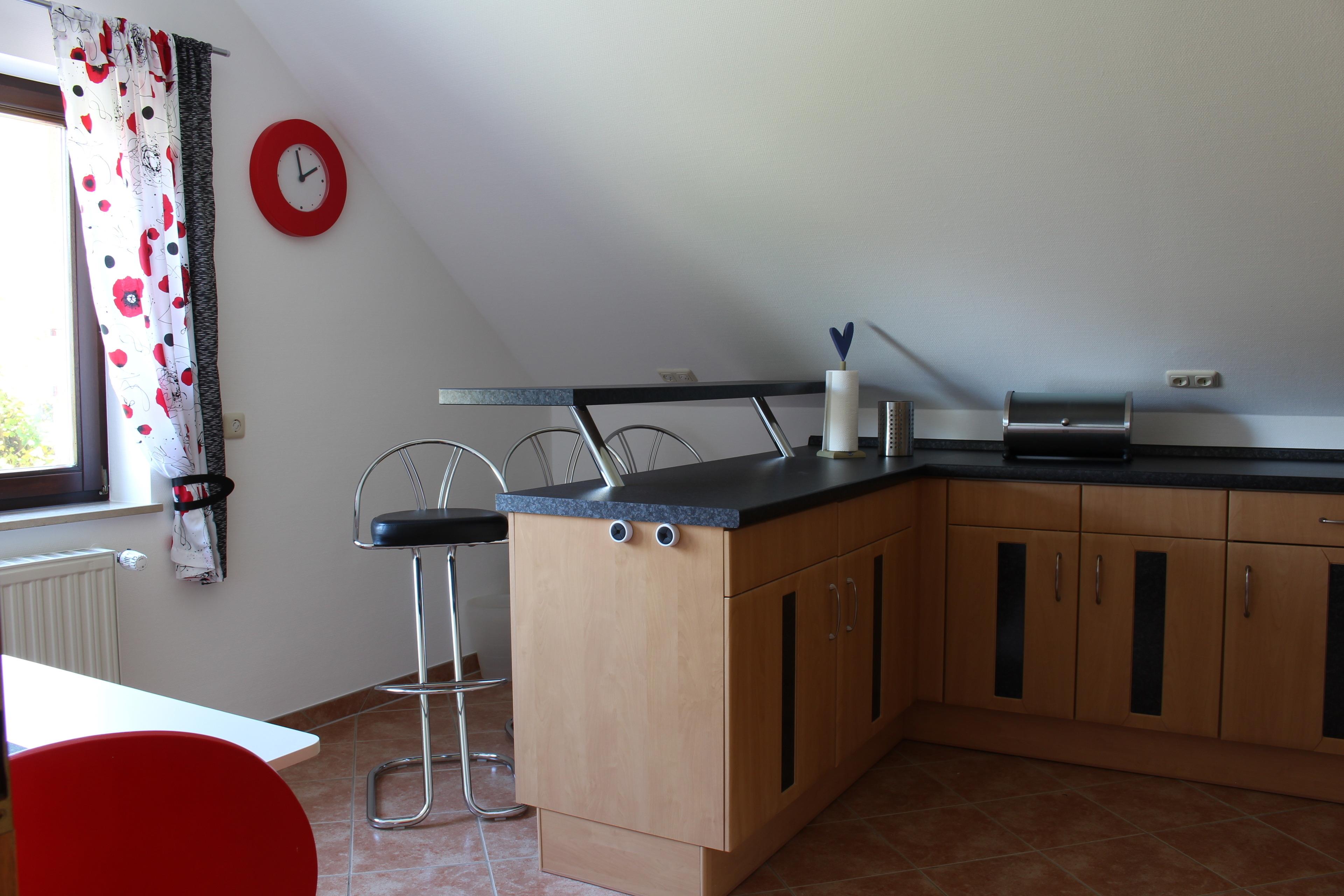 Die Ferienwohnung verfügt über eine gut ausgestattete Küche (Kühlschrank, Wasserkocher, Kaffeemaschine, Toaster, Ceran-Kochfeld, Backofen, Spülmaschine, Töpfe, Bratpfanne, Salz, Pfeffer, Essig, Öl, Backform, Backpapier, Zucker und Mehl) mit Essbereich für 3 Personen und kleiner Theke mit Barhockern.