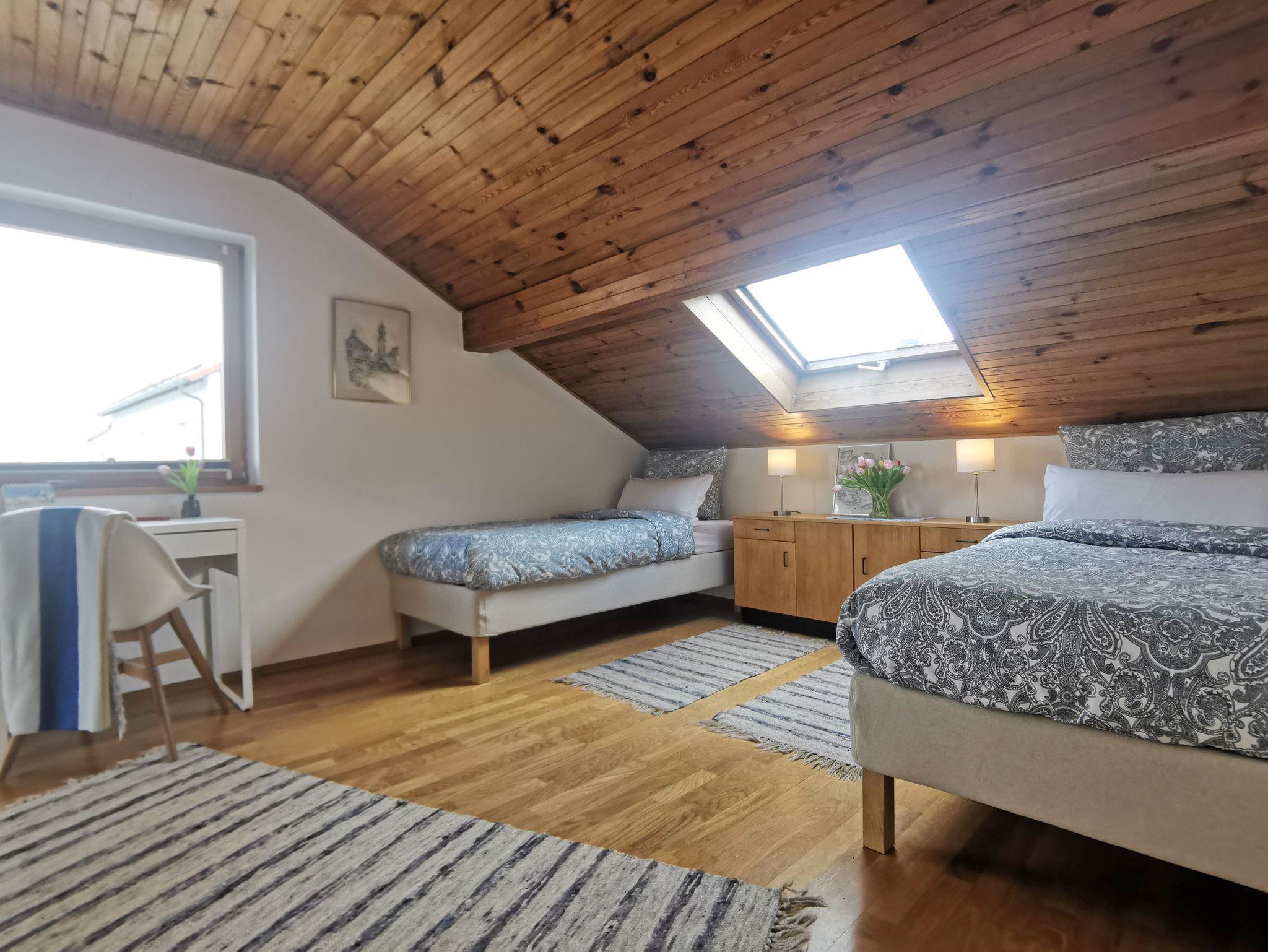 Wenn Sie einen Ort suchen, an dem Sie und Ihre Familie Urlaub im Grünen verbringen können, sind Sie in unserem Haus in Bobengrün richtig. Mit Platz für bis zu 9 Personen können Sie in unserem Haus Urlaub machen, den großen Garten genießen und den Abend an dem Kamin ausklingen lassen. Mit vier Bädern für fünf Doppelzimmer wird es auch für größere Gruppen nicht eng. Die frisch renovierte Küche und der großzügige Aufenthaltsbereich mit Wohn- und Esszimmer ausgestattet mit einem Kachelofen und Musikinstrumenten laden zum Verweilen ein. Das separate Lese- und Arbeitszimmer bietet Raum für Ruhe und Konzentration.