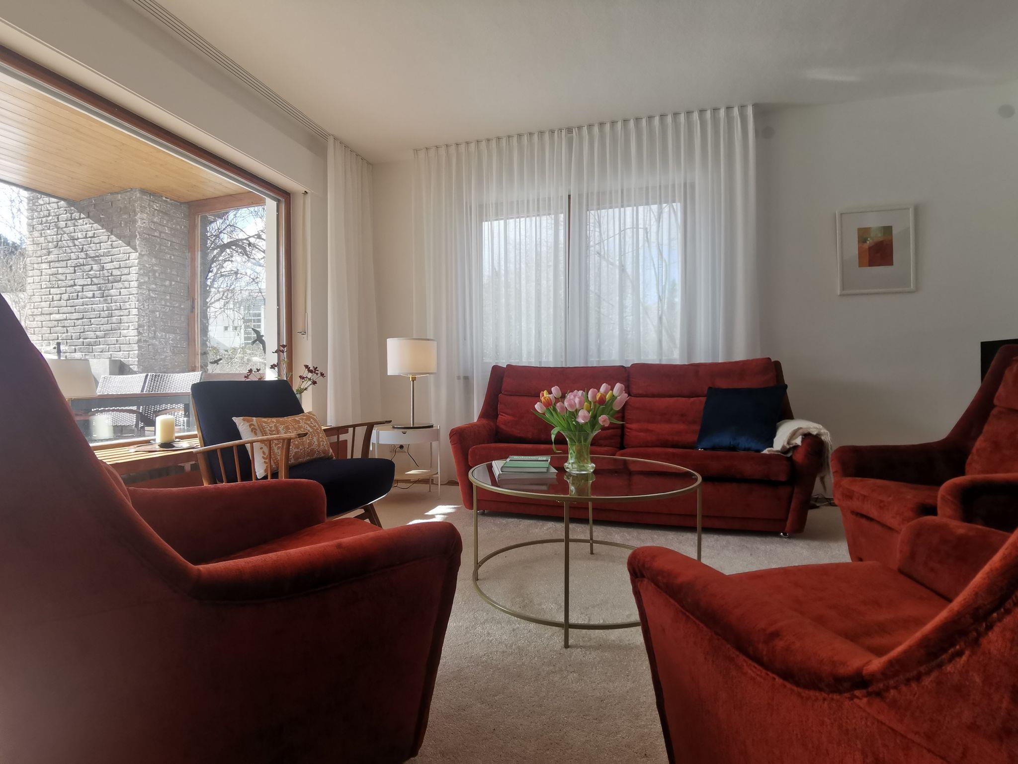 Das Esszimmer ist mit dem Wohnzimmer verbunden, in dem man über eine große Glaswand Blick auf den Garten und Terrasse hat. Besonderes Highlight ist hier der originale Kachelofen, den Sie über bereitgestelltes Holz gerne befeuern dürfen.