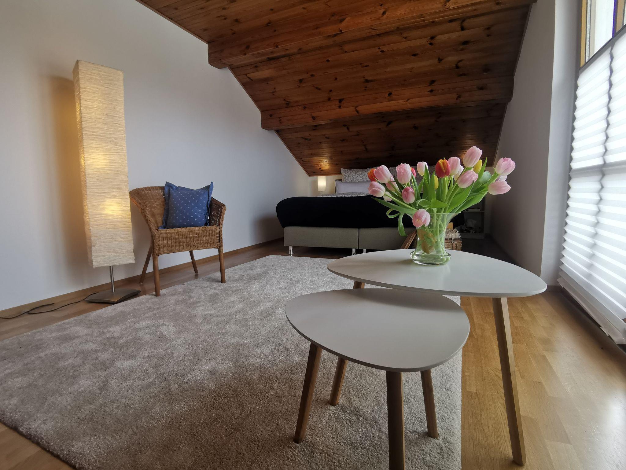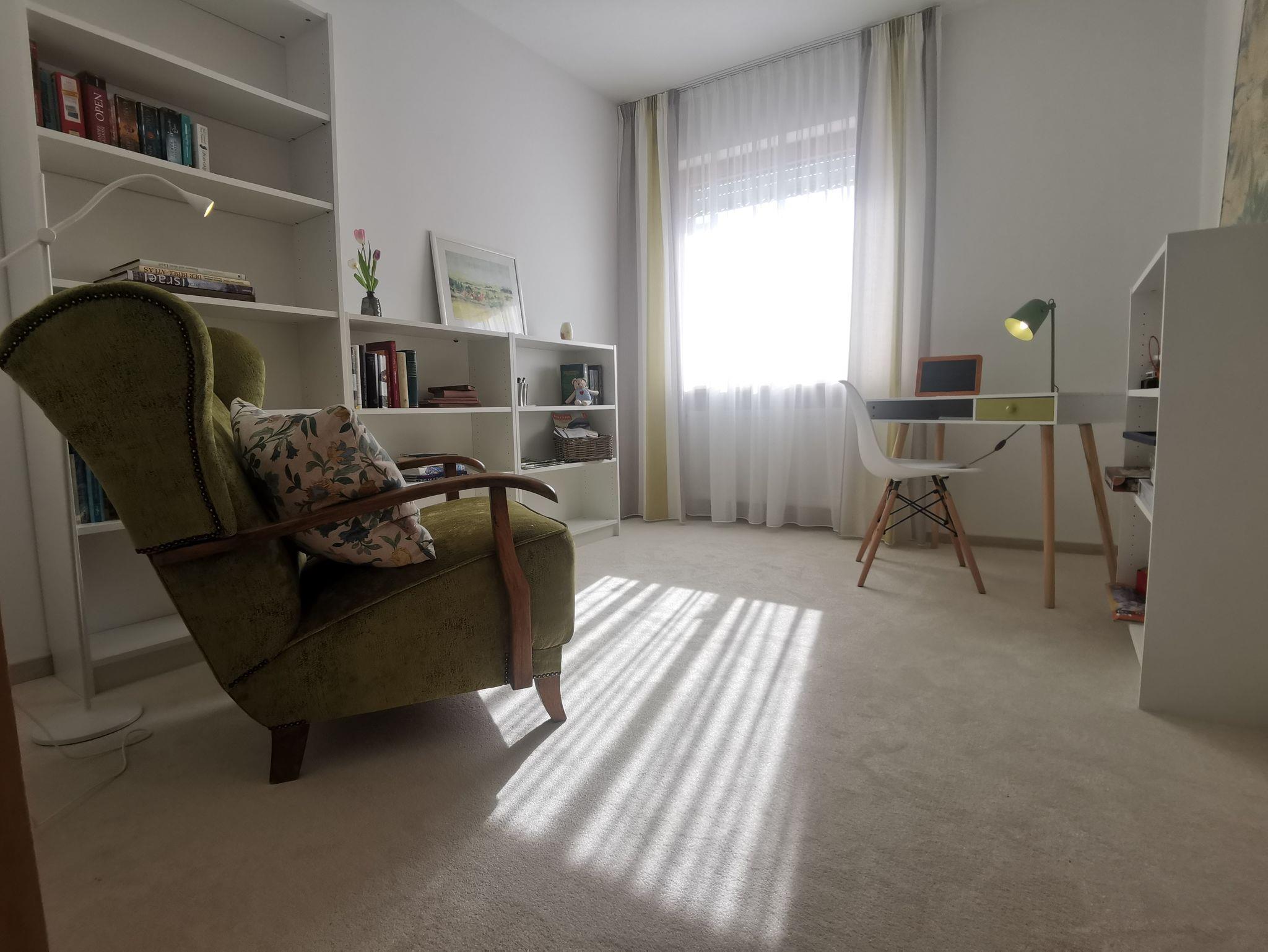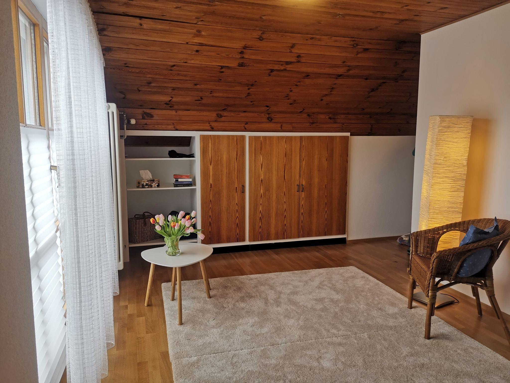 Im Erdgeschoss befindet sich ein weiterer Aufenthaltsraum, unser Lese-und Arbeitszimmer. Ebenfalls mit Blick auf den Rosengarten finden Sie hier alles um konzentriert Arbeit nachzugehen oder entspannt einige Stunden zu schmökern. Durch den Teppichboden ist der Raum sowohl im Winter als auch im Sommer sehr angenehm.