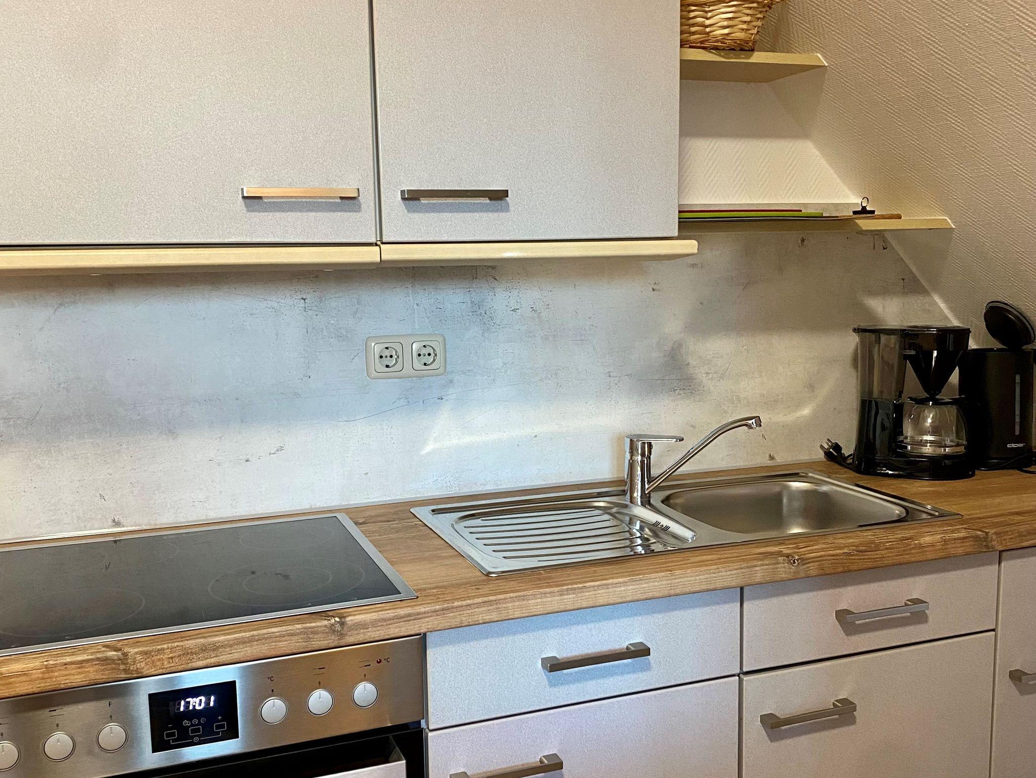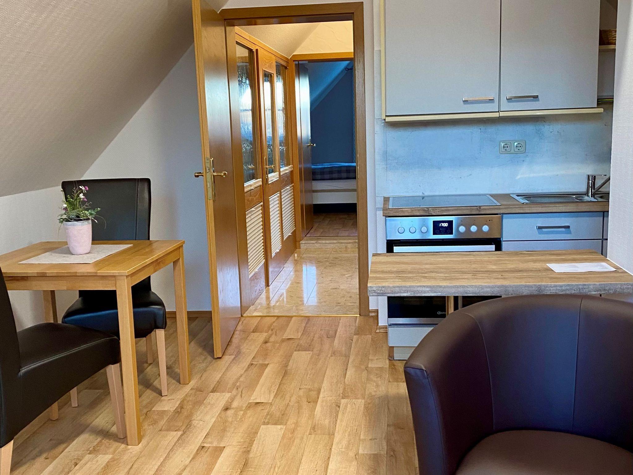 Herrliche Dachwohnung mit Blick über die Flur !Die Ferienwohnung HIMMELBLICK mit 40 qm Wohnfläche bietet Gemütlichkeit für bis zu zwei Personen. Die Küchenzeile ist kombiniert mit Wohnraum und Essplatz und beinhaltet einen E-Herd mit Cerankochfeld und Backofen, einen Kühlschrank mit Gefrierfach, Kaffeemaschine , Eierkocher, Wasserkocher und Toaster sowie Koch und Essgeschirr für 2 Personen Über einen kleinen Flur geht es zum romantischen Schlafzimmer mit Doppelbett. Das Badezimmer ist mit Dusche, WC ausgestattet. Die komplette Wäsche Ausstattung, Bettwäsche, Dusch Tücher, Handtücher sowie Geschirrtücher werden gestellt. Gerne können Sie auch einen Bademantel haben.