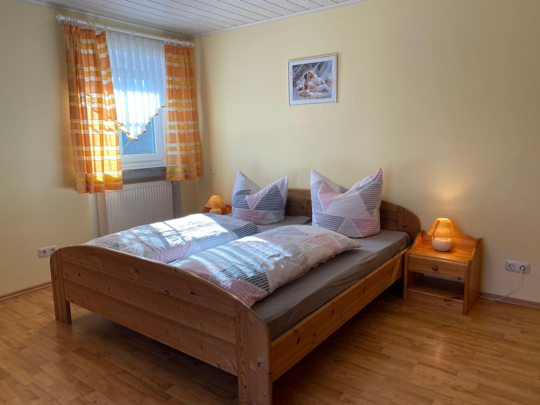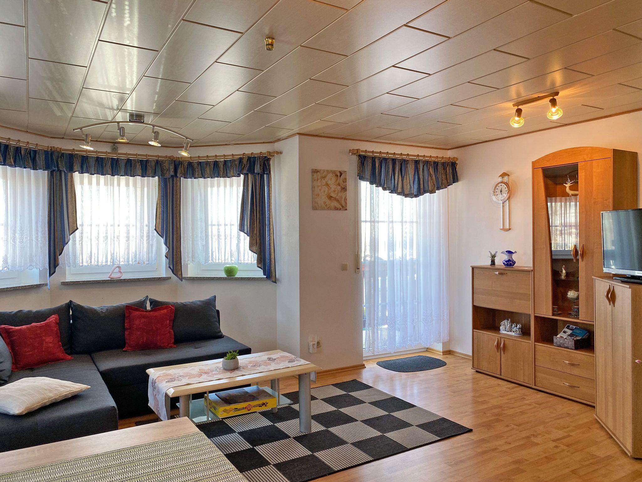 Die Ferienwohnung bietet Ihnen auf 57m² viel Platz zum Wohlfühlen. Der offene Wohnbereich besitzt eine bequeme, ausziehbare Schlafcouch. Für gemütliche Abende stehen Gesellschaftsspiele und ein Fernseher zur Verfügung. An den Wohnbereich angeschlossen ist eine voll ausgestattete Küchenzeile mit 4-Platten-Herd, Backofen, Kühlschrank und Kaffeemaschine. Außerdem besitzt die Wohnung ein großzügiges, helles Tageslicht-Bad mit WC und Dusche. Das Schlafzimmer ist mit einem Doppelbett, einem großen Kleiderschrank für Ihre Urlaubsgarderobe und einem Fernseher eingerichtet. Ein geräumiger Balkon, der sowohl vom Schlafzimmer als auch vom Wohnzimmer aus zugänglich ist, ist das Highlight der Wohnung. Hier haben Sie einen wunderschönen Ausblick auf grüne Wiesen und Felder. Tisch- und Küchenwäsche sowie Handtücher und ein Föhn werden Ihnen gerne zur Verfügung gestellt.