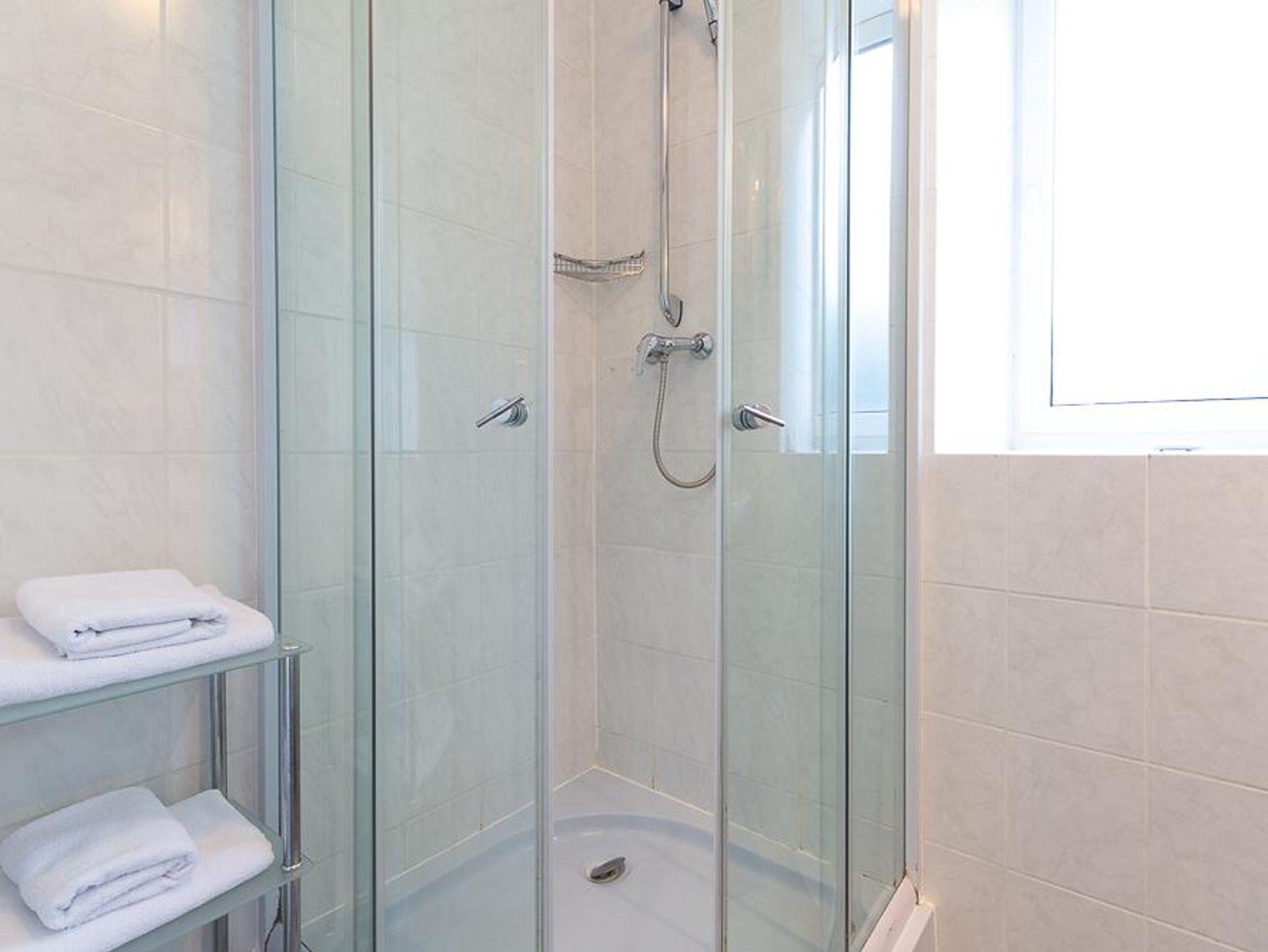Das Badezimmer ist mit einer Dusche, großzügigem Waschbecken, beleuchtetem Spiegel und Toilette ausgestattet.