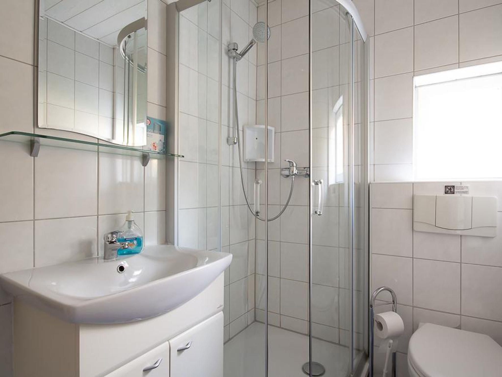 Das Badezimmer ist mit einer Dusche, großzügigem Waschbecken, beleuchteten Spiegel und Toilette ausgestattet.