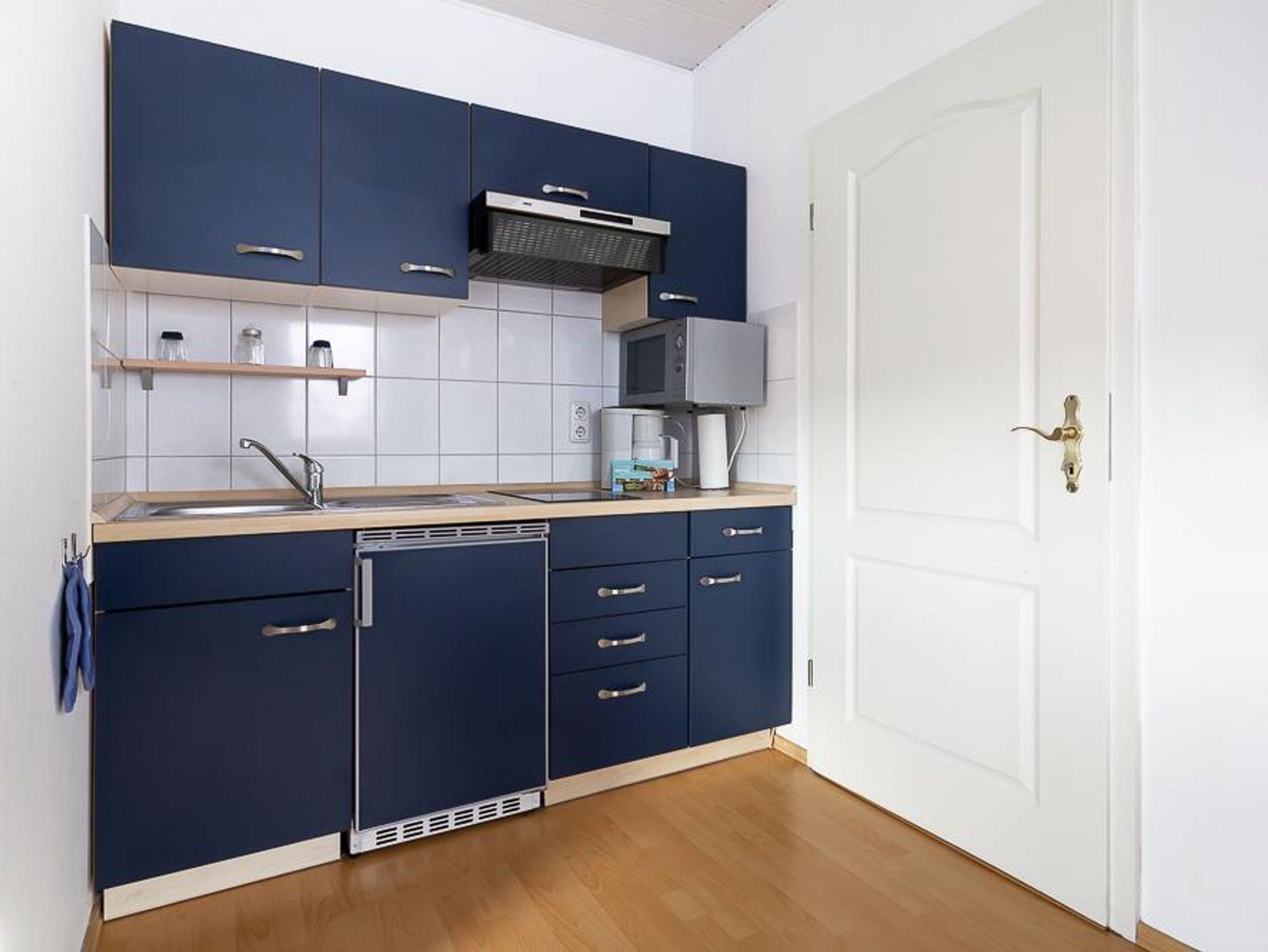 Das Appartement verfügt über eine komplett eingerichtete Wohnküche mit Geschirr, Kaffeemaschine, Wasserkocher, Elektroherd und Küchlschrank mit Gerfrierfach.